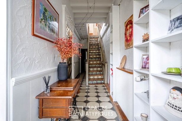 A staircase adorned with cement tiles leads to the second level, which houses a fitted kitchen, organized around a central island, and opens onto a double living room with a balcony.