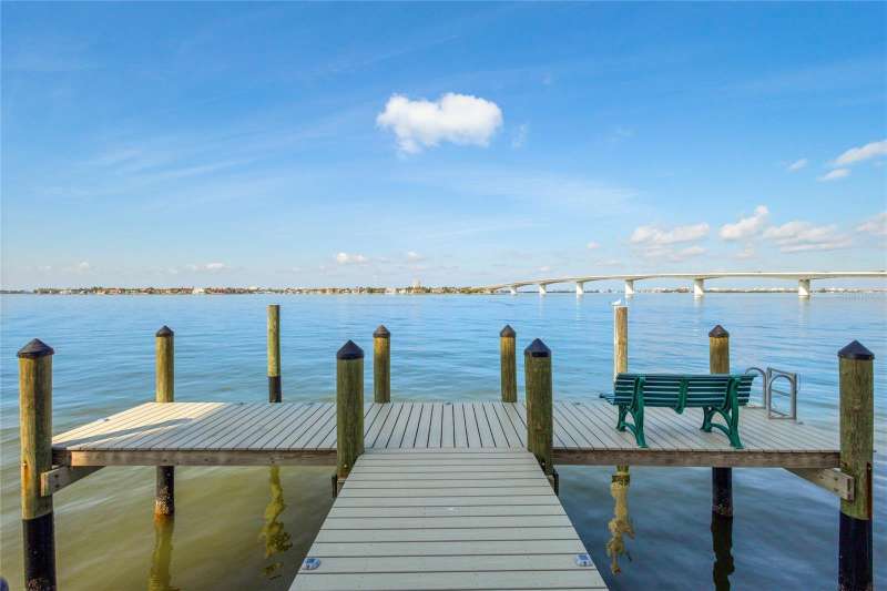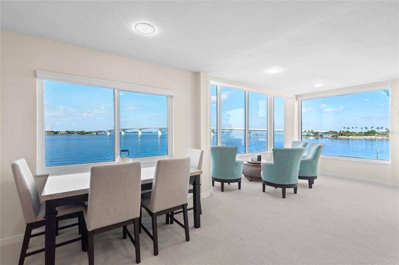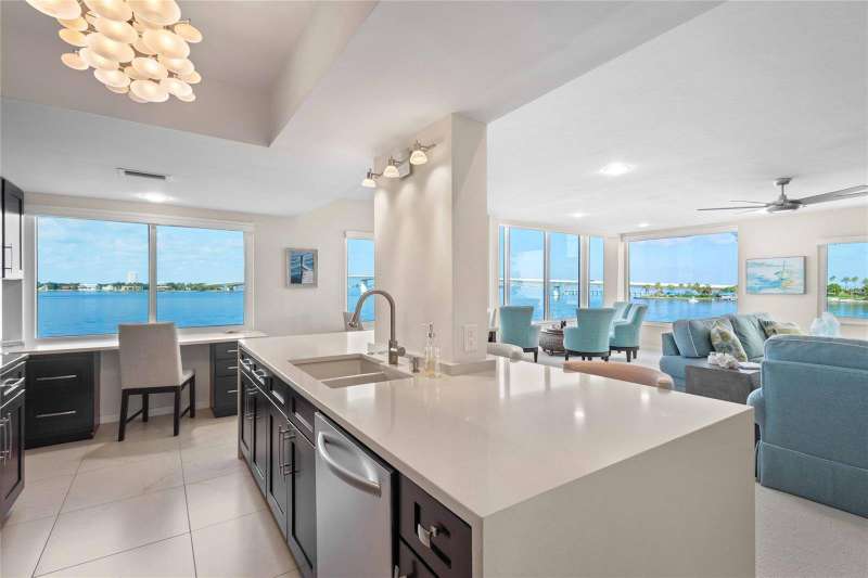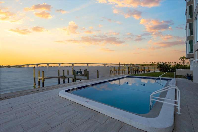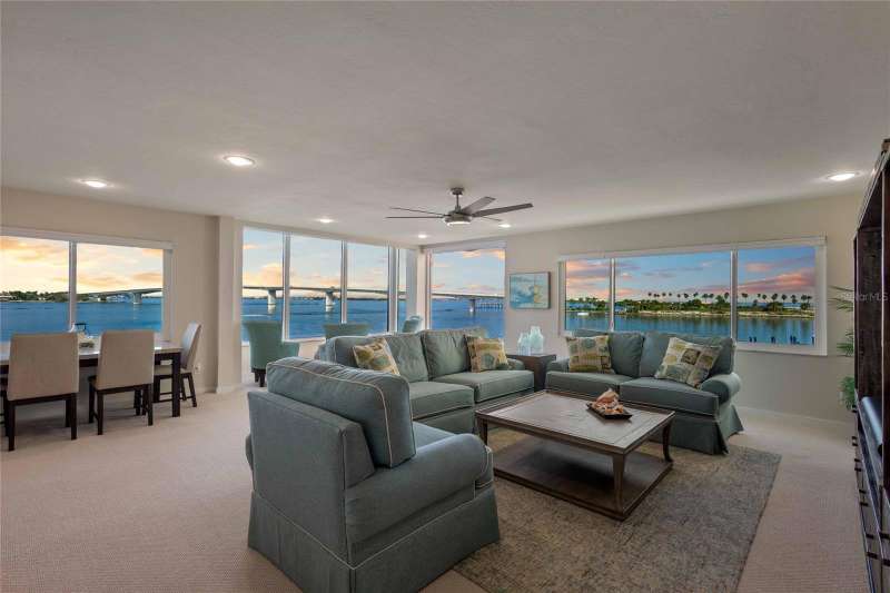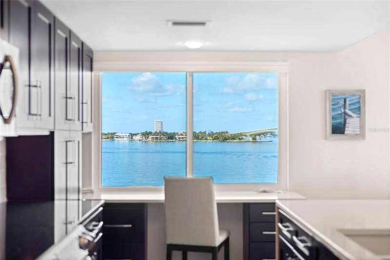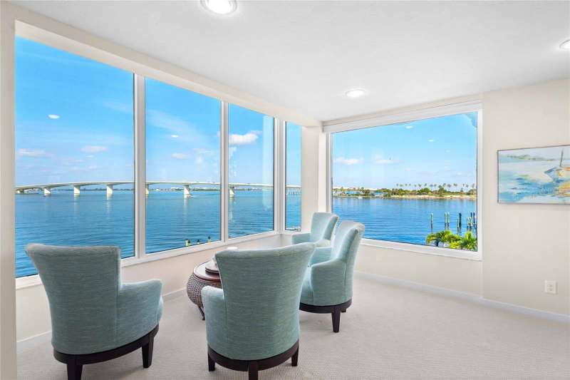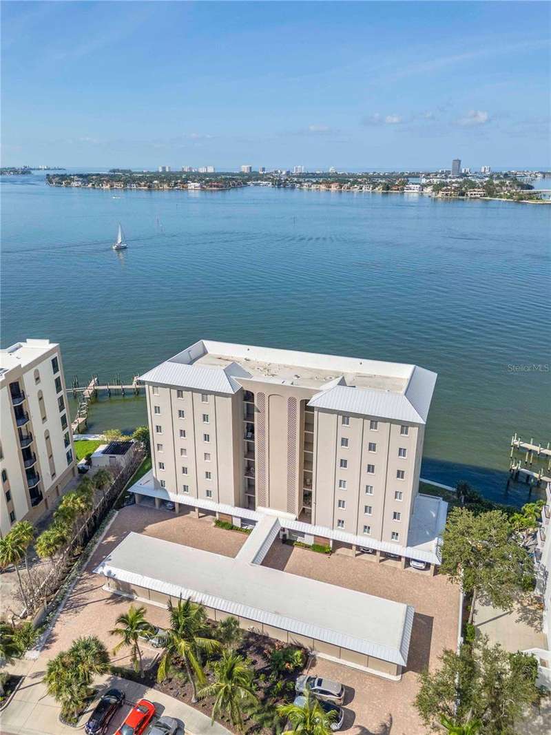 Coastal living at its finest, the panoramic and breathtaking views from this Golden Gate Point residence offer an unparalleled yet attainable opportunity to live the sought-after waterfront lifestyle. This elegantly renovated corner unit boasts walls of impact-rated PGT windows (2024) that perfectly frame sweeping views of Sarasota Bay, Bird Key, and the iconic John Ringling Bridge, offering a front-row seat to jaw-dropping sunsets and endless natural beauty. The open-concept kitchen has been thoughtfully redesigned with a quartz waterfall island, soft-close cabinetry, built-in desk, and a seamless flow into the living and dining areas—ideal for both entertaining and everyday living. The spacious great room enjoys phenomenal north and west-facing vistas, with the unit uniquely set in front of the neighboring building to maximize natural light and privacy. Throughout the residence, you'll find custom interior doors, a neutral color palette, thoughtfully renovated bathrooms, and elevated finishes that reflect refined taste. Both bedrooms feature serene bay vistas, and the expansive 18' x 12' primary suite allows space for a sitting area or workspace plus separate reach-in and walk-in closets in the vestibule leading to the primary bathroom. Storage is abundant, with a large entry closet, full-size hallway closet, a generous 8' x 7' laundry/utility room, and a 6' x 5' private storage room conveniently located just outside the front door. Residents of this boutique community enjoy exceptional amenities, including a heated bayfront pool (34' x 17'), day dock, outdoor shower, and renovated poolside bath. Assigned covered parking and ample guest parking provide convenience. Set on the prestigious Golden Gate Point peninsula with its tree-lined and brick-pavered street, this residence is minutes from downtown Sarasota’s dining, arts, and cultural attractions, as well as the shops and restaurants of St. Armands Circle and the world-famous beaches of Lido Key. This is a rare opportunity to live the waterfront lifestyle in one of Sarasota’s most exclusive neighborhoods.
