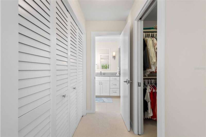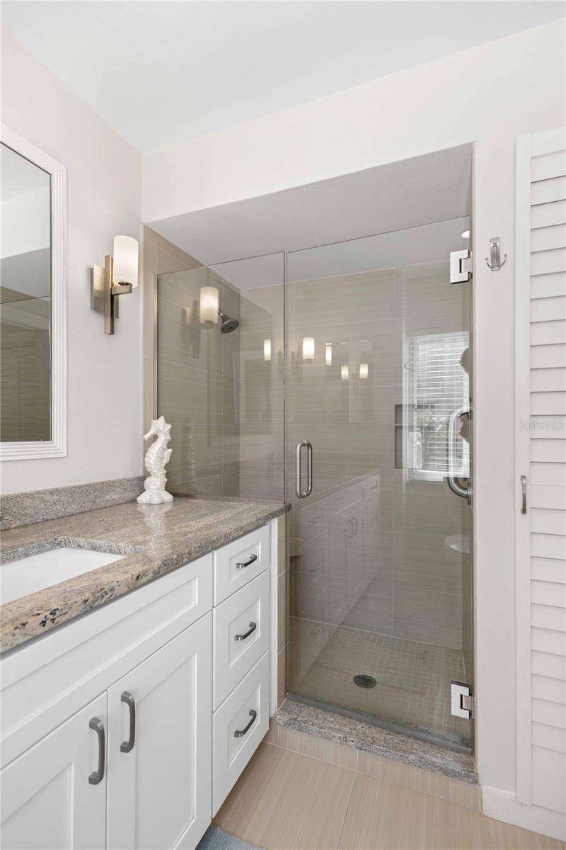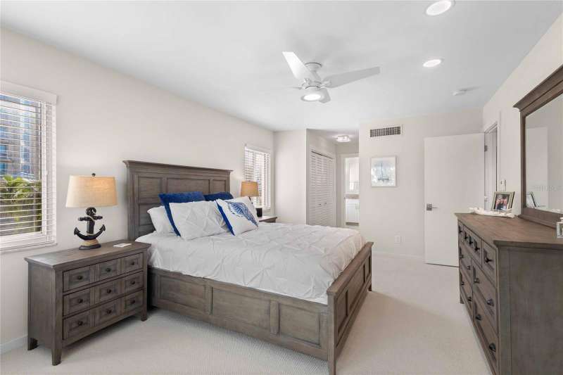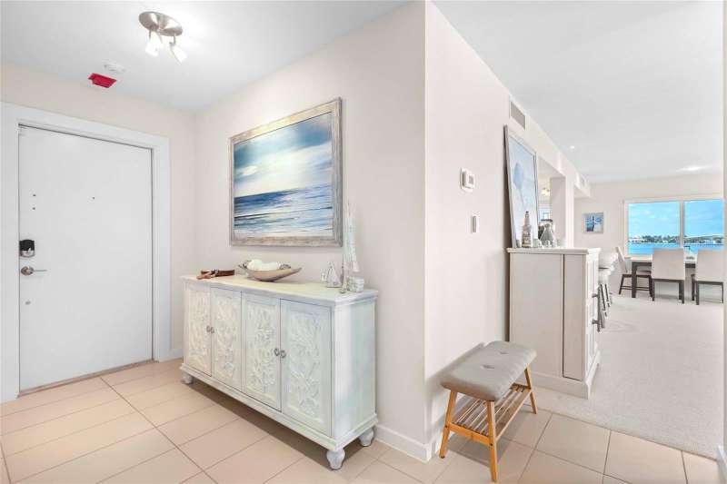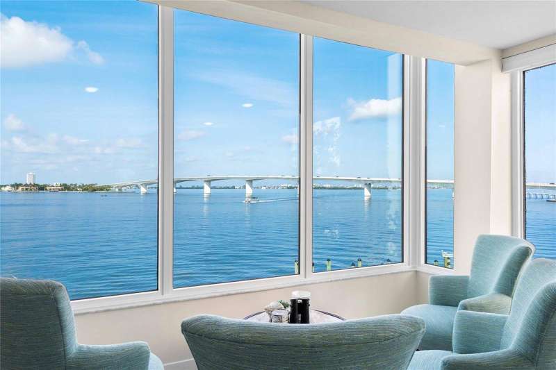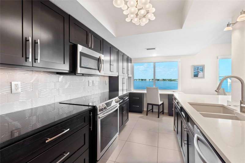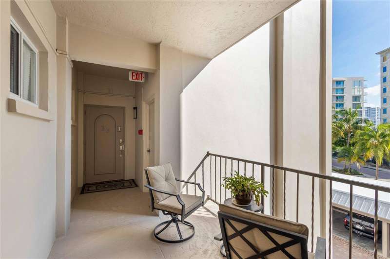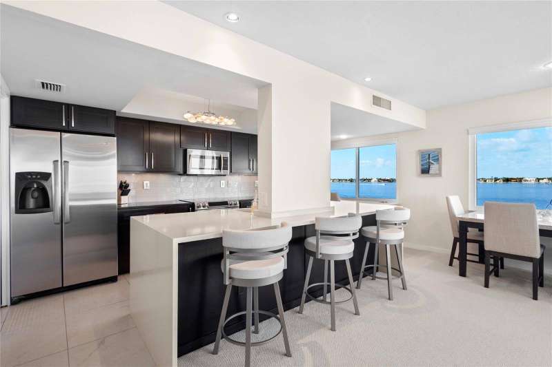 Coastal living at its finest, the panoramic and breathtaking views from this Golden Gate Point residence offer an unparalleled yet attainable opportunity to live the sought-after waterfront lifestyle. This elegantly renovated corner unit boasts walls of impact-rated PGT windows (2024) that perfectly frame sweeping views of Sarasota Bay, Bird Key, and the iconic John Ringling Bridge, offering a front-row seat to jaw-dropping sunsets and endless natural beauty. The open-concept kitchen has been thoughtfully redesigned with a quartz waterfall island, soft-close cabinetry, built-in desk, and a seamless flow into the living and dining areas—ideal for both entertaining and everyday living. The spacious great room enjoys phenomenal north and west-facing vistas, with the unit uniquely set in front of the neighboring building to maximize natural light and privacy. Throughout the residence, you'll find custom interior doors, a neutral color palette, thoughtfully renovated bathrooms, and elevated finishes that reflect refined taste. Both bedrooms feature serene bay vistas, and the expansive 18' x 12' primary suite allows space for a sitting area or workspace plus separate reach-in and walk-in closets in the vestibule leading to the primary bathroom. Storage is abundant, with a large entry closet, full-size hallway closet, a generous 8' x 7' laundry/utility room, and a 6' x 5' private storage room conveniently located just outside the front door. Residents of this boutique community enjoy exceptional amenities, including a heated bayfront pool (34' x 17'), day dock, outdoor shower, and renovated poolside bath. Assigned covered parking and ample guest parking provide convenience. Set on the prestigious Golden Gate Point peninsula with its tree-lined and brick-pavered street, this residence is minutes from downtown Sarasota’s dining, arts, and cultural attractions, as well as the shops and restaurants of St. Armands Circle and the world-famous beaches of Lido Key. This is a rare opportunity to live the waterfront lifestyle in one of Sarasota’s most exclusive neighborhoods.