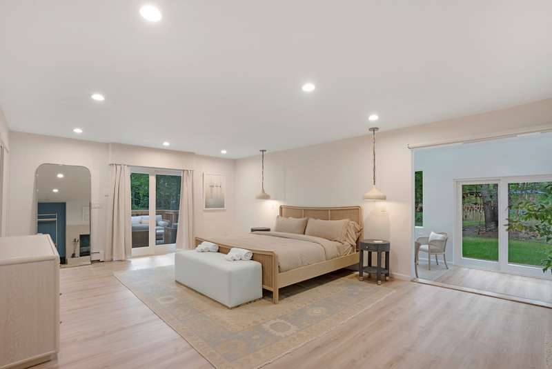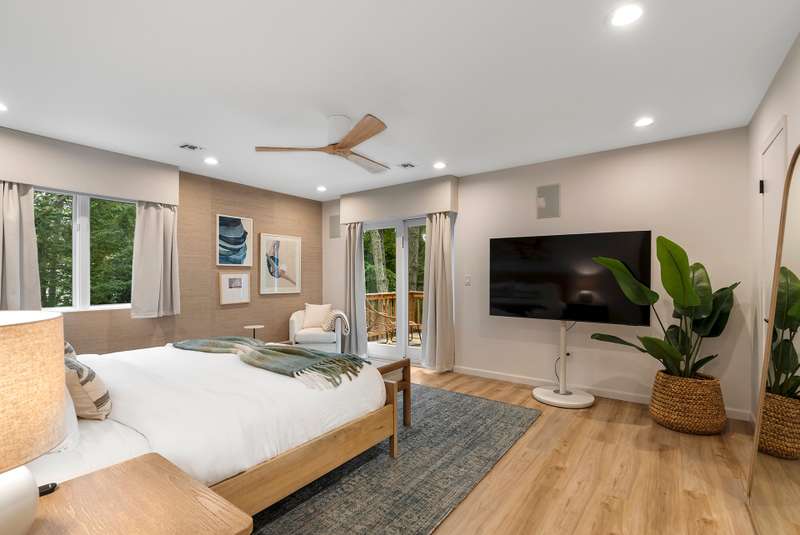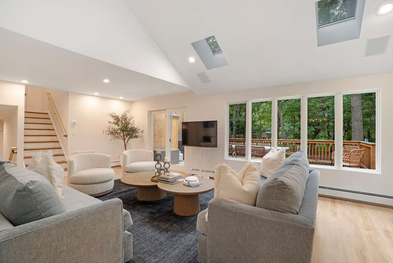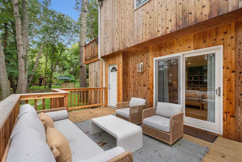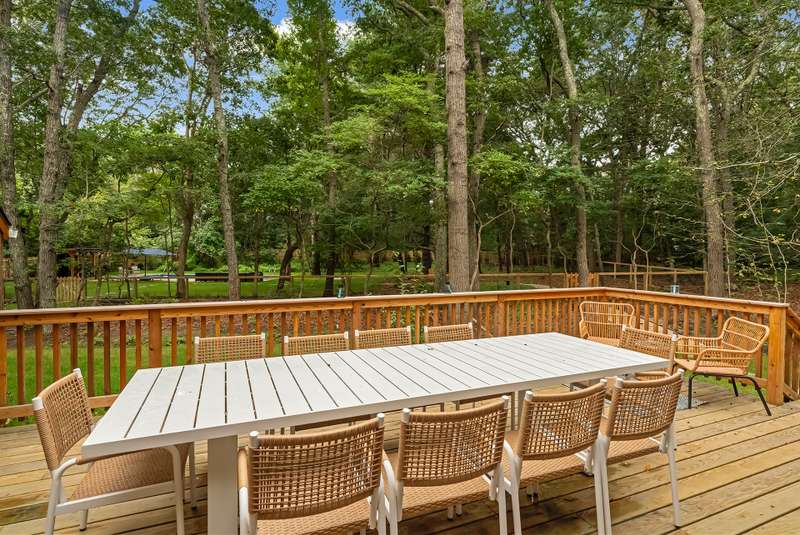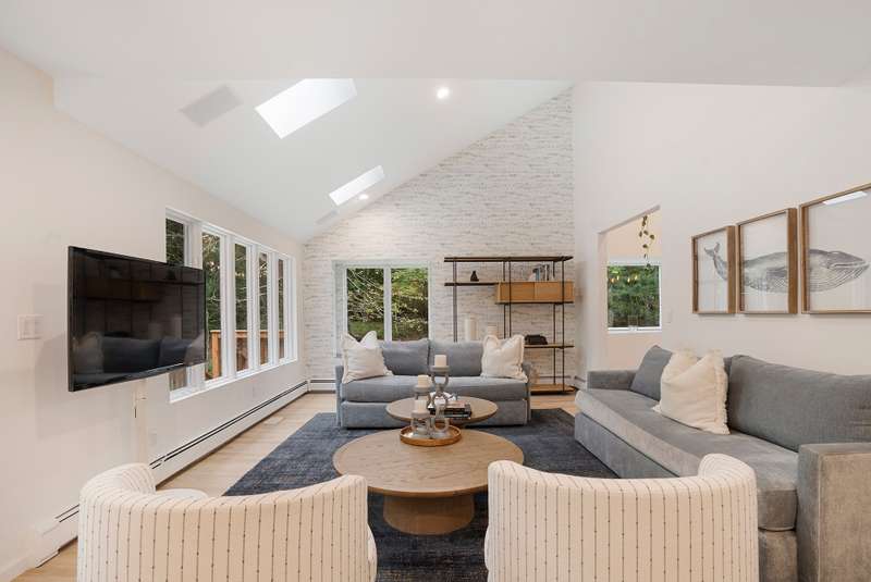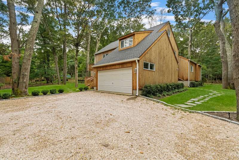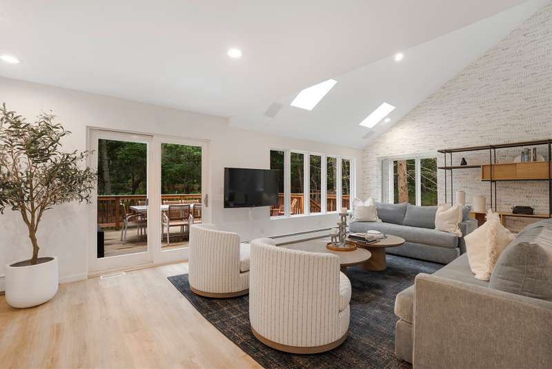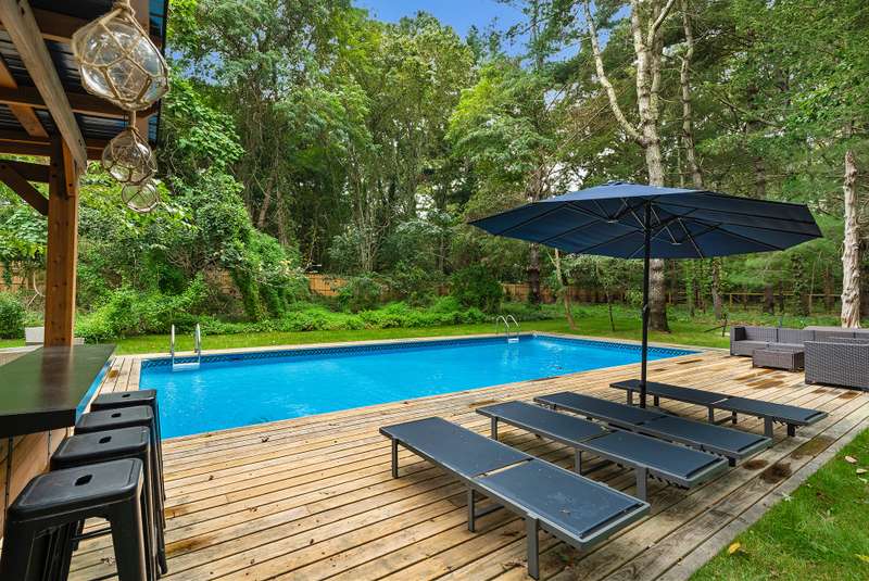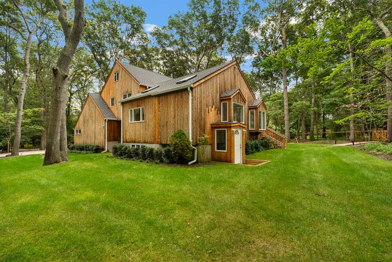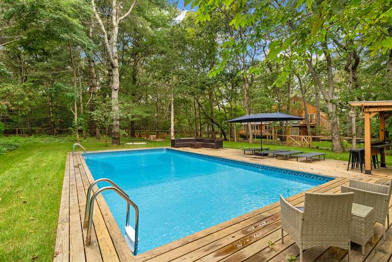 RR# RP250704 Secluded yet close to the Village, this split-level contemporary features four bedrooms and four baths. Living room with fireplace, sunroom, dining room, kitchen, extensive decking. The 20' x 40' pool is set amid the very private, wooded 2.8-acre property. .