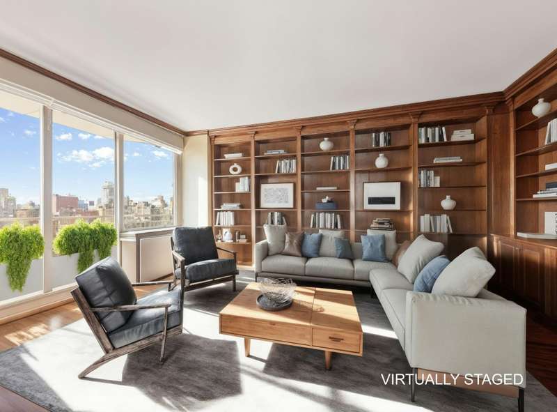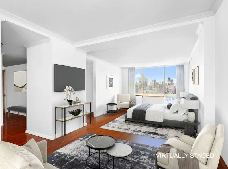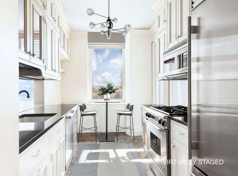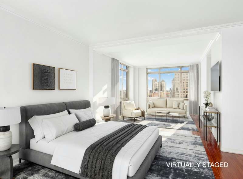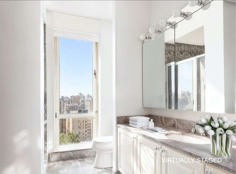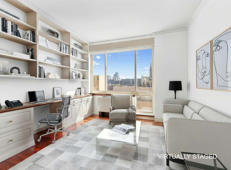 There is an expansive, light-filled primary suite with a sitting room. It features three exposures with sweeping city views, two separate, en-suite bathrooms, and five substantial closets.
