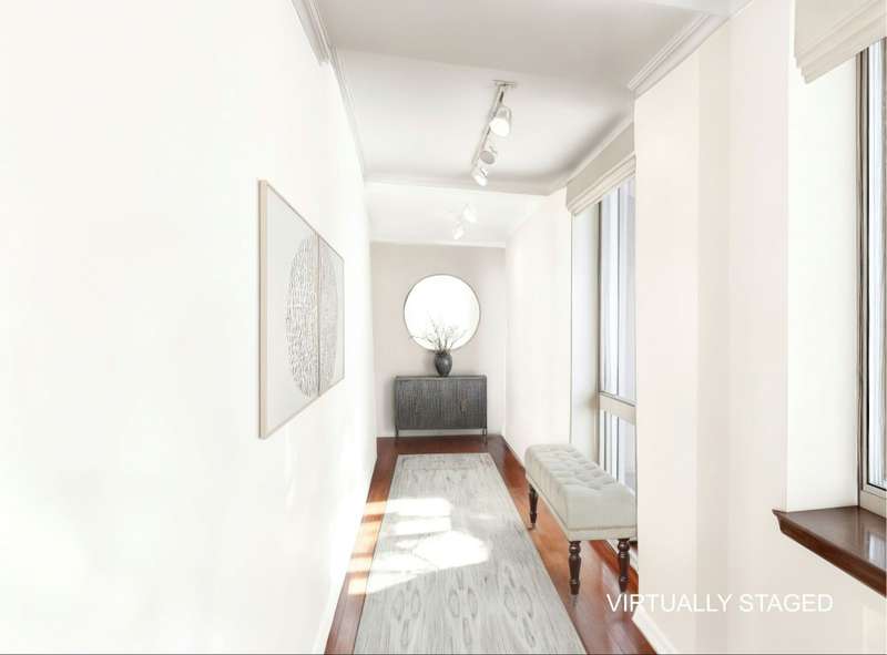 Exit the elevator onto a private landing. As you enter the apartment, you are welcomed home by an elegant, sunlit gallery with floor-to-ceiling windows that flows into a gracious foyer, with a closet for guests.