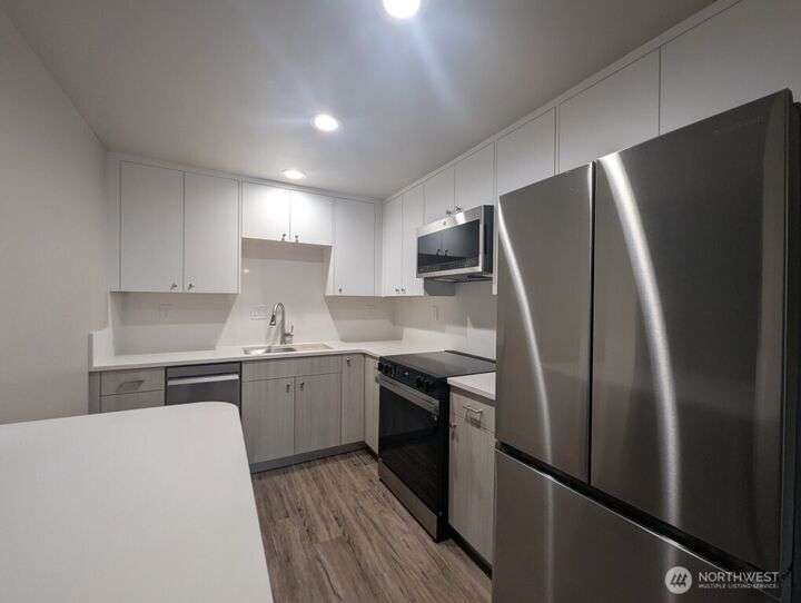 Available Now! Fully remodeled ground floor 1-bed unit in the Edmonds Bowl! Luxury meets convenience. All brand new: Kitchen cabinets and counter tops, appliances, luxury vinyl plank flooring, interior paint, etc. Water & Garbage included in rental rate. 1 Pet OK with addit'l $500 deposit. Must be under 40 lbs. Tenant responsible for all other utilities.
