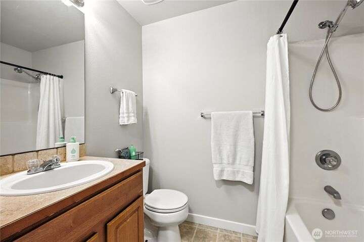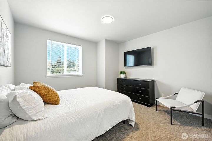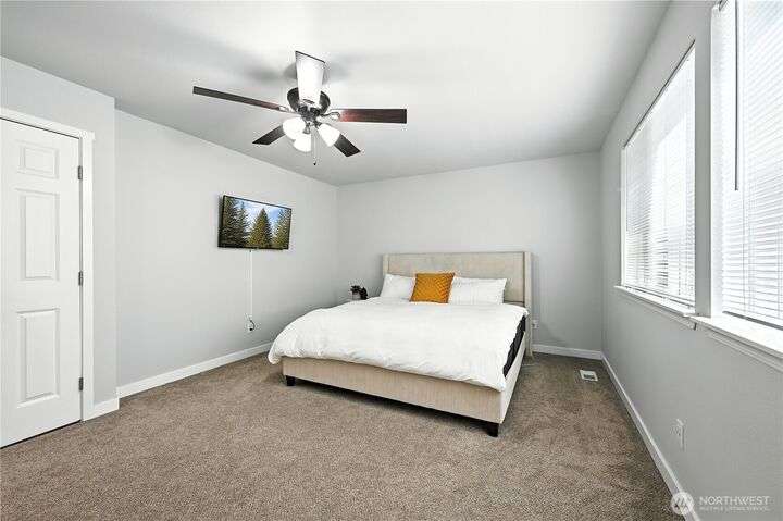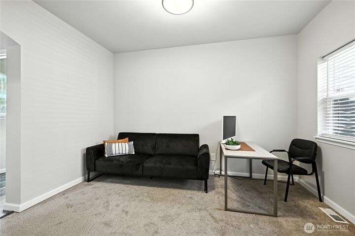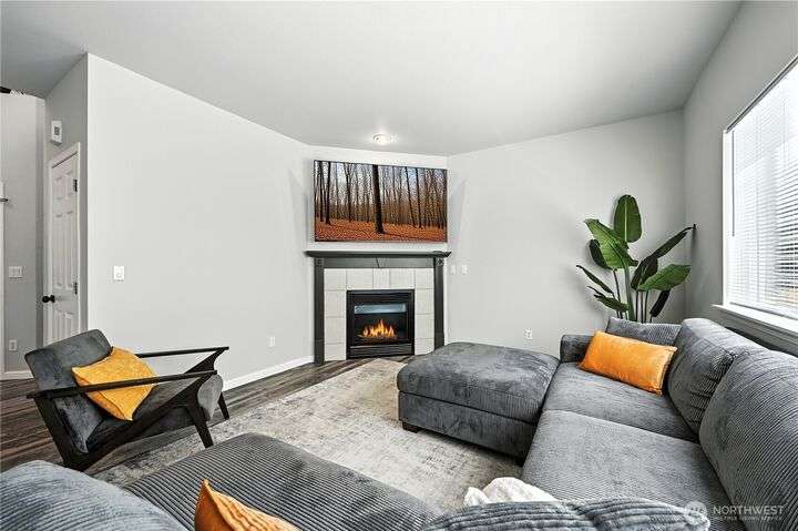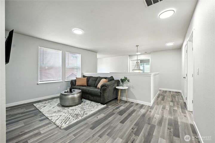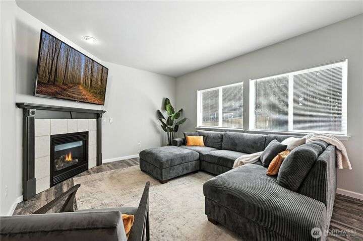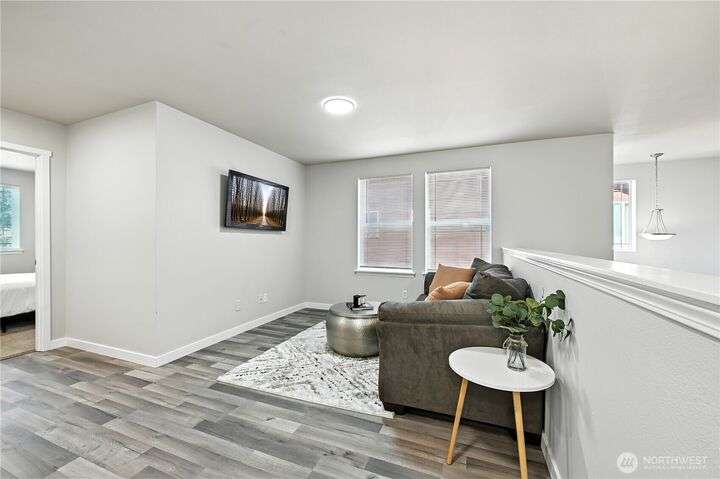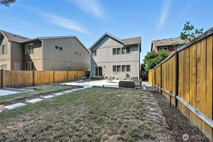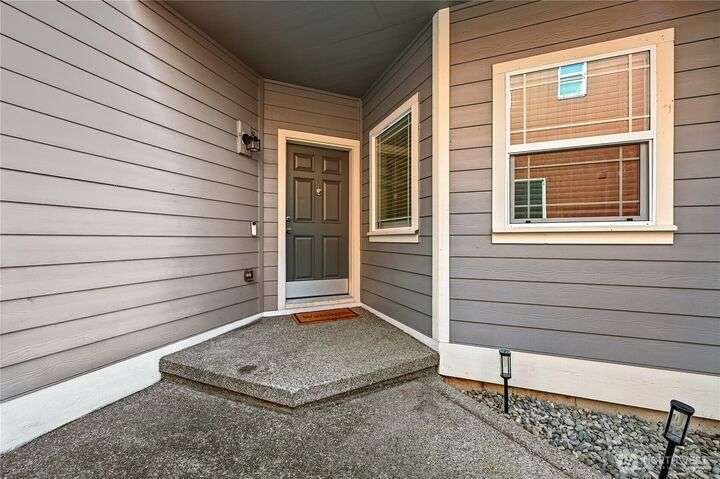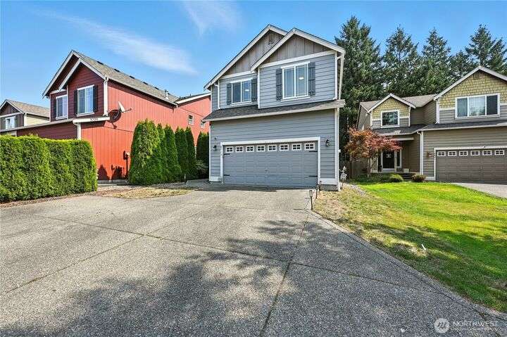 Don’t miss this updated and move-in ready 3-bedroom + den home! Recent updates completed in the last few years include fresh interior paint, carpet, stylish vinyl plank flooring, window coverings and newly redone lawn & patio. The soaring ceilings and open layout set the stage for gatherings, while the cozy living room fireplace brings warmth and comfort. Enjoy the refreshing AC on those hot summer days. The upstairs primary suite offers a large walk-in closet and private bath, joined by a loft and two spacious bedrooms. Convenient upstairs laundry room. Step outside to your fully fenced backyard retreat with direct access to scenic neighborhood walking trails. All this in a prime location close to shopping, dining, and JBLM. Welcome home!