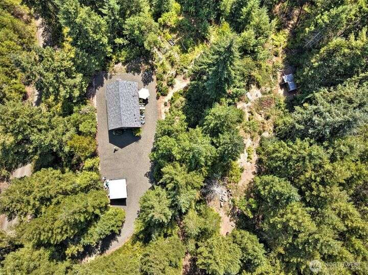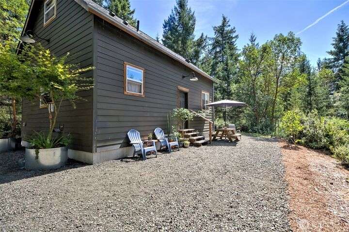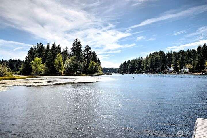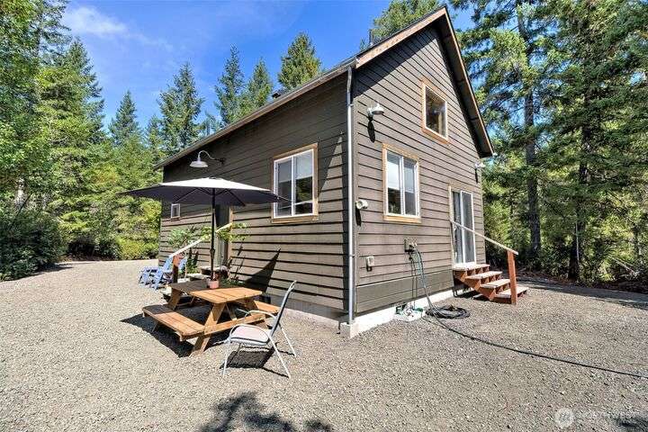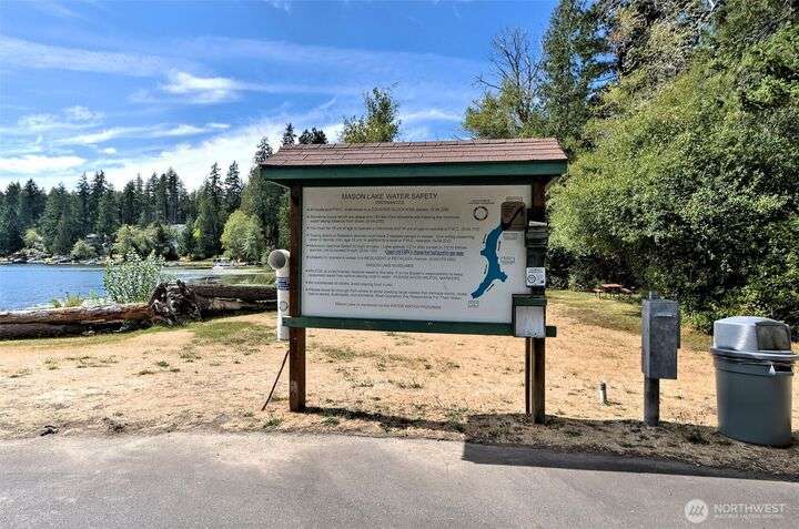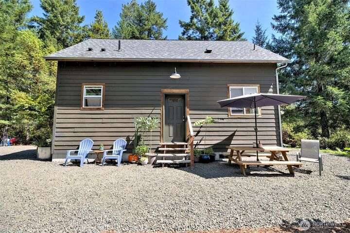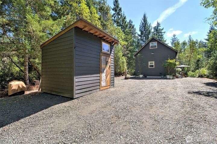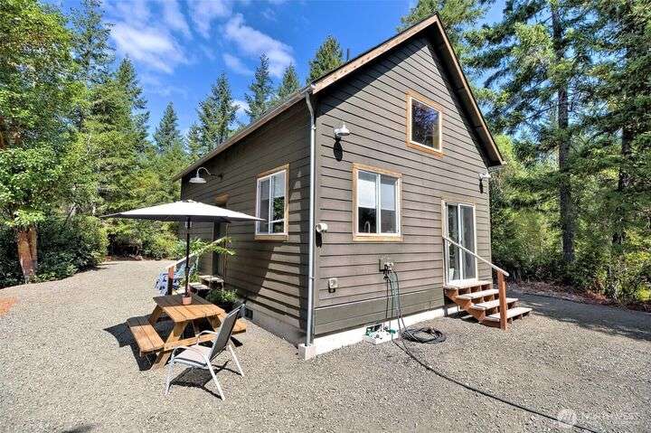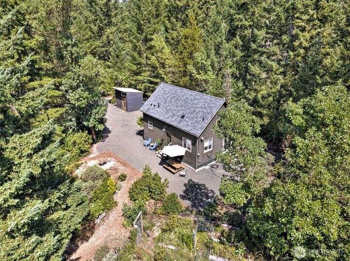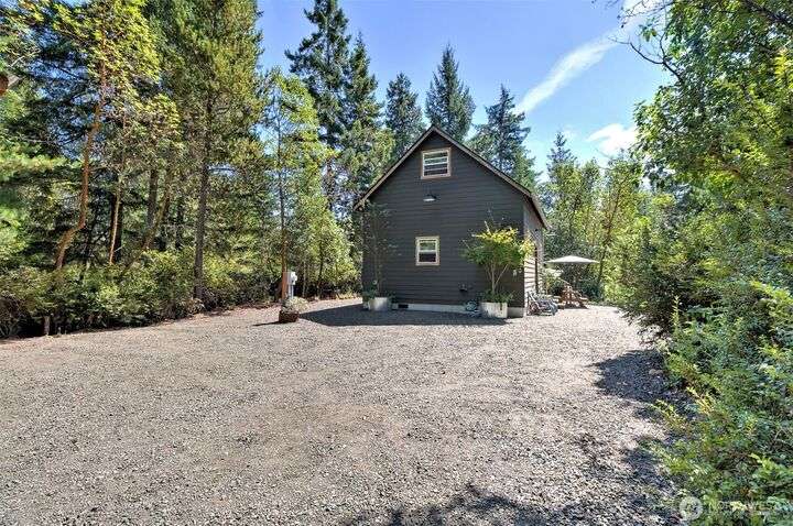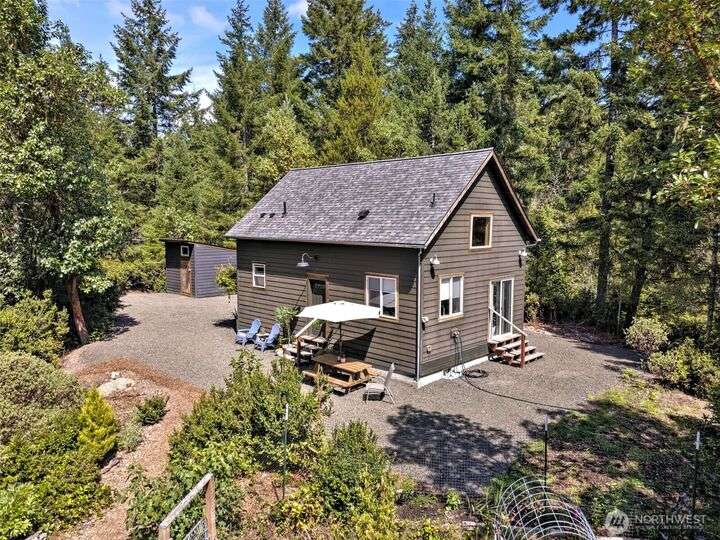 This very cool cabin located on almost 3 acres sits on top of a hill just across the road from Mason Lake & offers great privacy but has wonderful access to all the things! This compact home features a great primary bedroom on the main level, a loft for additional sleeping or office/den & a big open living, kitchen & dining area that has high vaulted ceilings & tons of light. The finishing touches are really nicely done as the photos show. All of the appliances are included so just pack your bags and move on in! You will love the property! From the great garden area to the little spots and trails throughout that make great hideaways to read or just sit & enjoy the natural beauty. Might be able to open up a lake view with tree trimming!