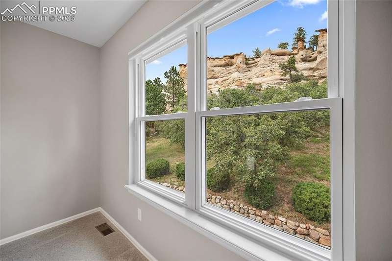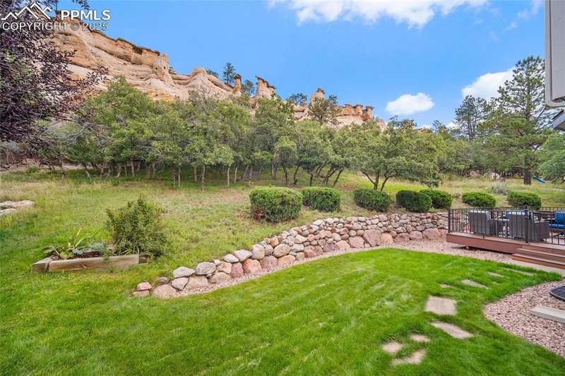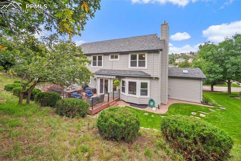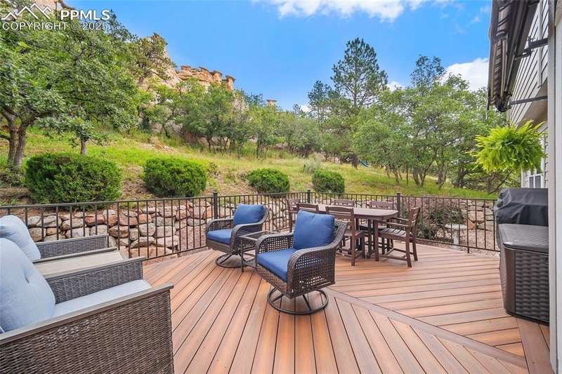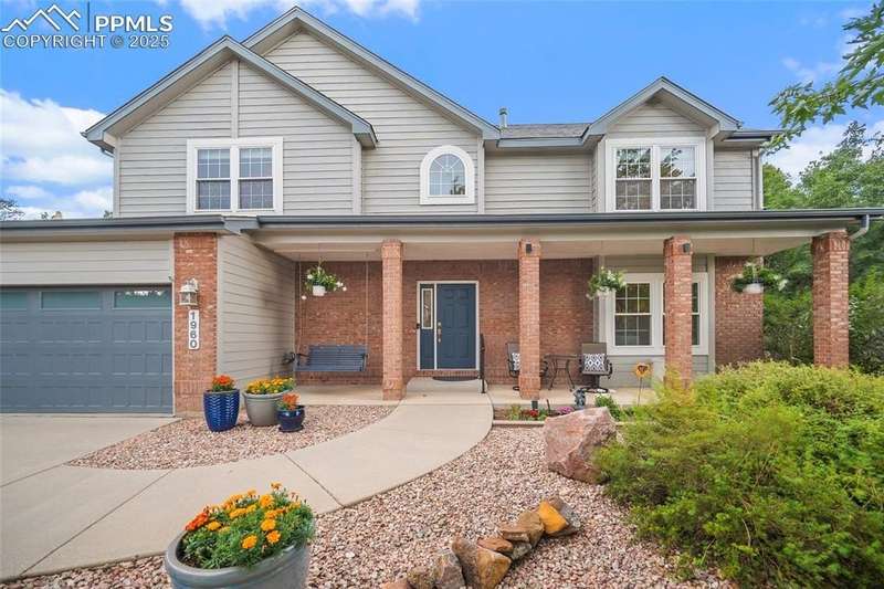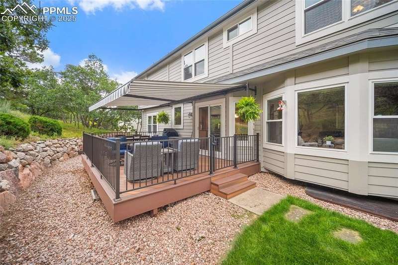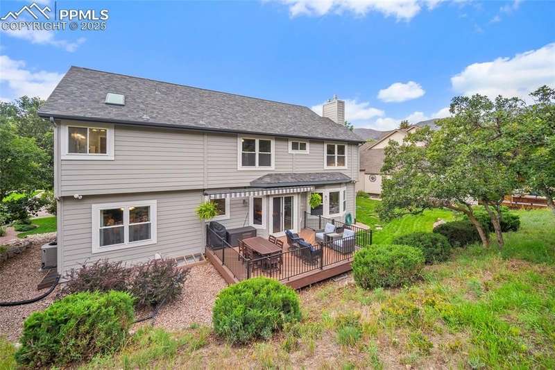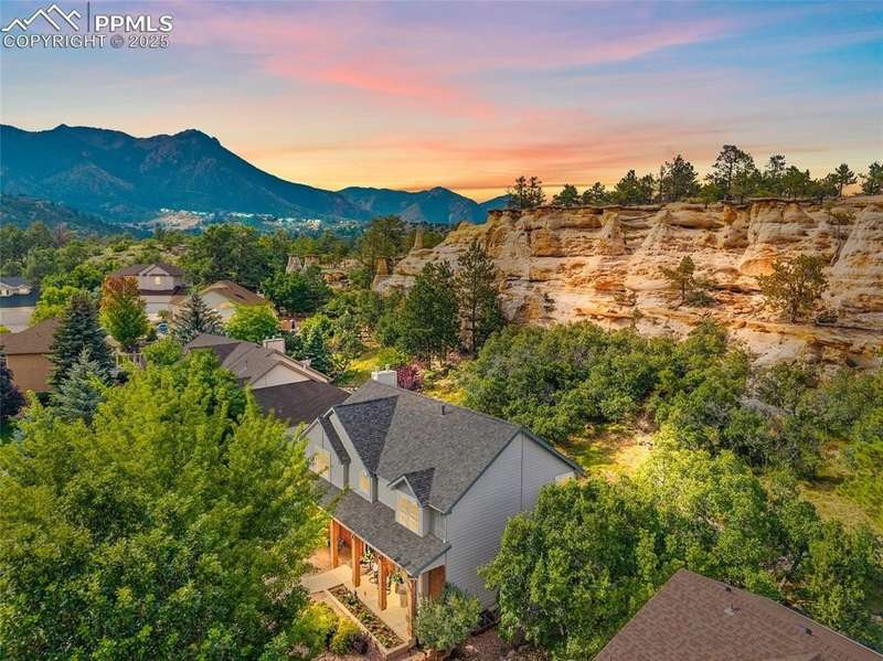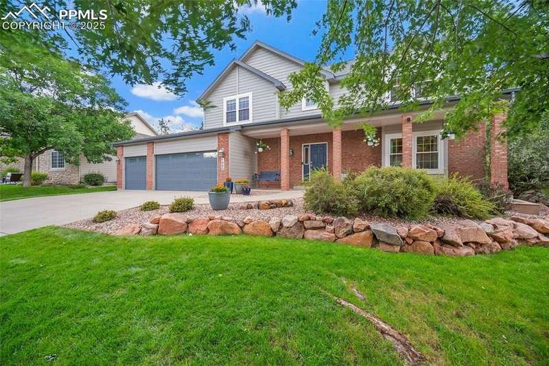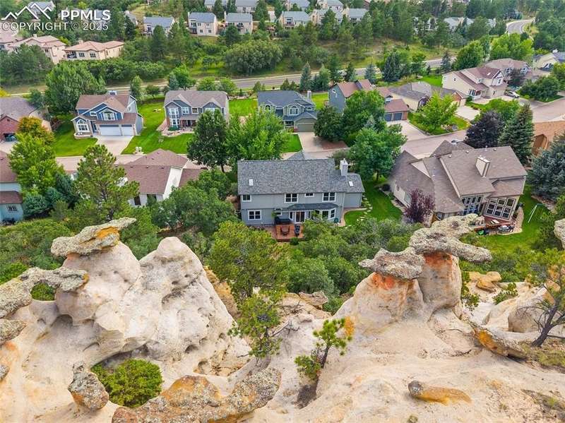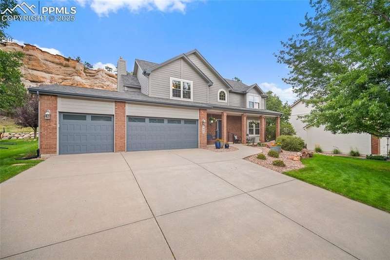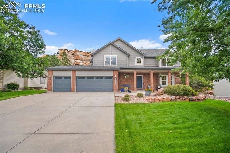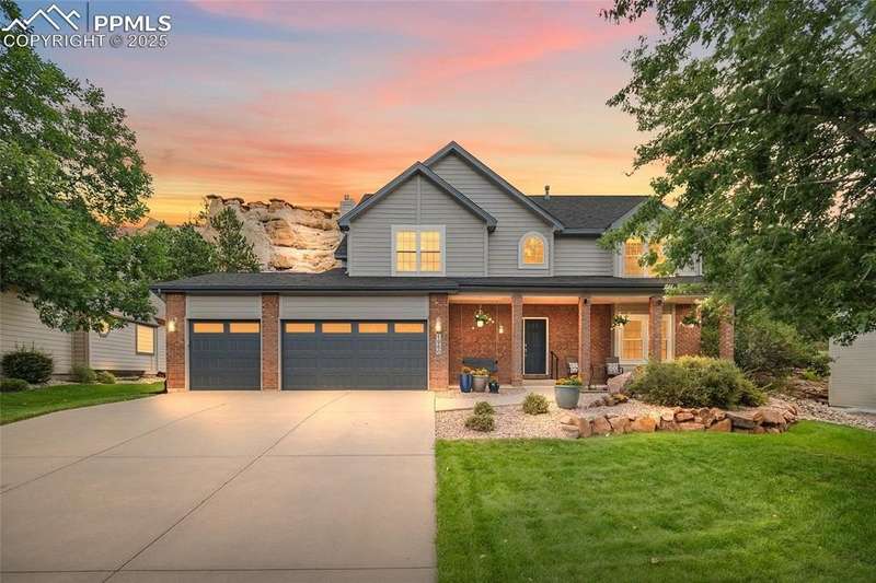 Drama and serenity come together in this meticulously maintained two-story home set against a backdrop of hoodoo rock formations on an exemplary street in the shadow of Blodgett Peak. A peaceful main level seamlessly melds formal spaces with more casual ones for comfortable living, and five bedrooms provide all the space you need for everyone you want to live with or visit you. A cozy family room sits off the kitchen/dining combo with fireplace and built-in bookcases, with a walk-out to a large composite deck complete with retractable awning that sits under towering hoodoos above for dramatic and private outdoor living. Four large upstairs bedrooms are anchored by a massive master suite with renovated bath that gorgeously presents a glass shower enclosure, separate tub, dual vanity and walk-in closet, and adds heated floors for extra comfort. The fully finished basement is so perfect for guests that they may never come upstairs, with a quiet bedroom, game space, kitchenette and a second cozy living space with gas fireplace, as well as a full bath and storage. The three-car garage includes cabinetry for storage and a built-in workbench, and the roof, exterior paint and furnace are all new since 2024. Situated on a neighborly tree-lined street in the lower part of Peregrine, the home is easily accessible to Woodmen Roberts Elementary School, hiking trails, I-25, shopping and restaurants.