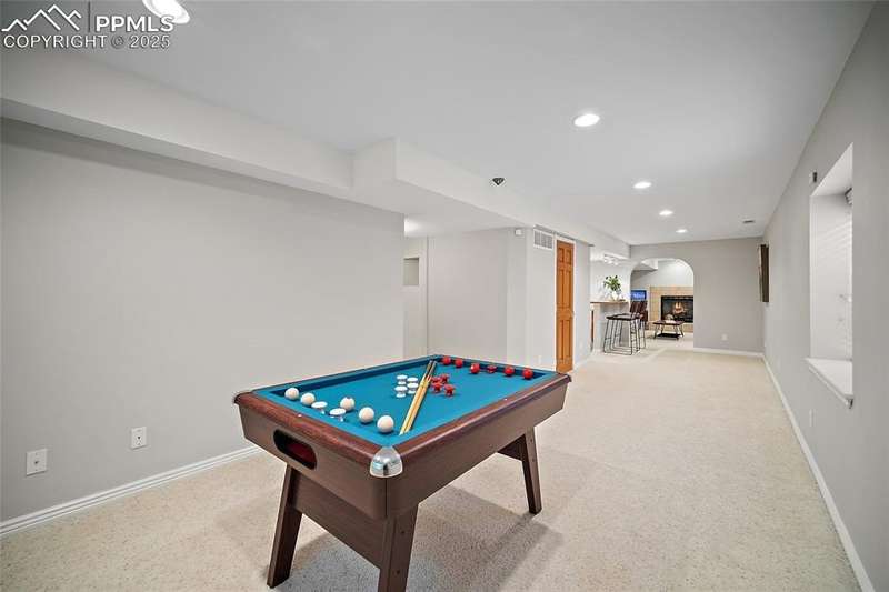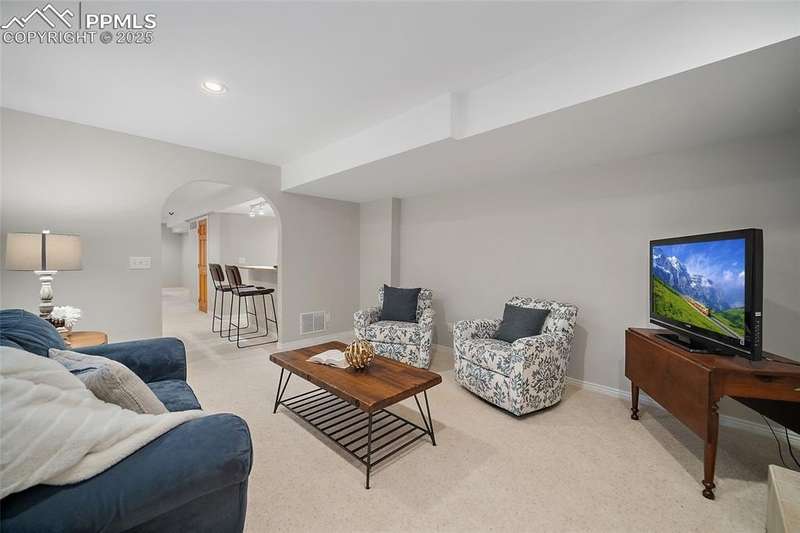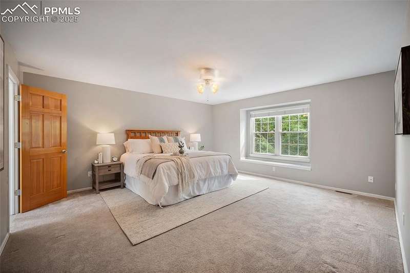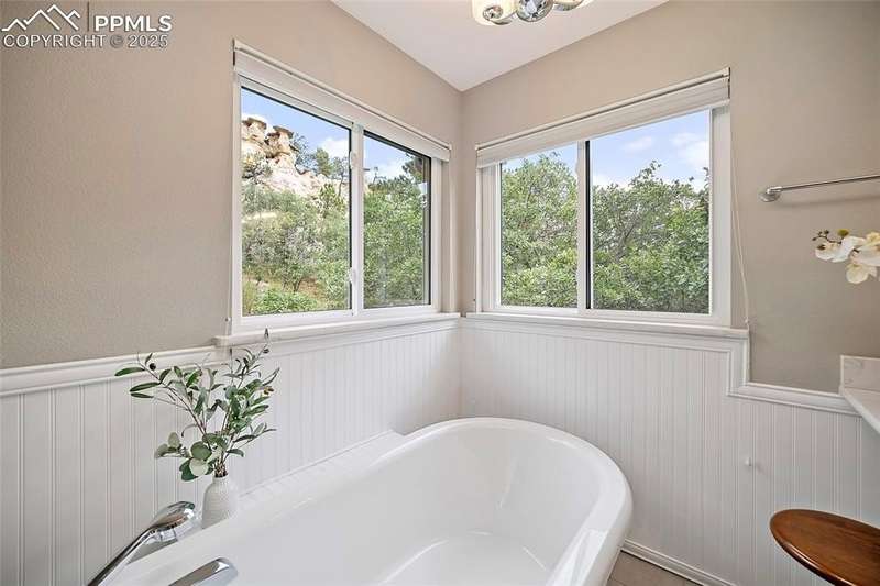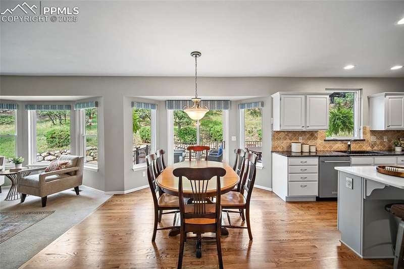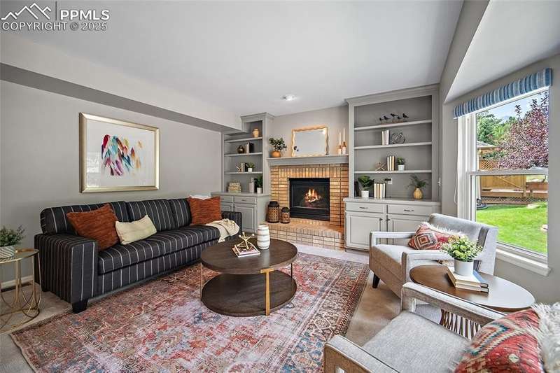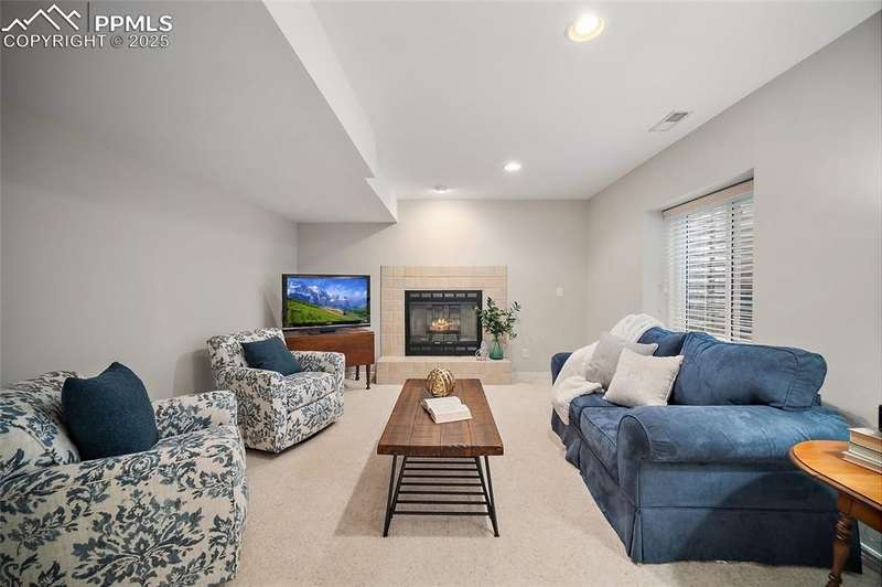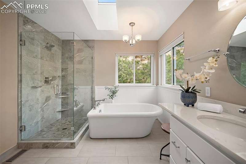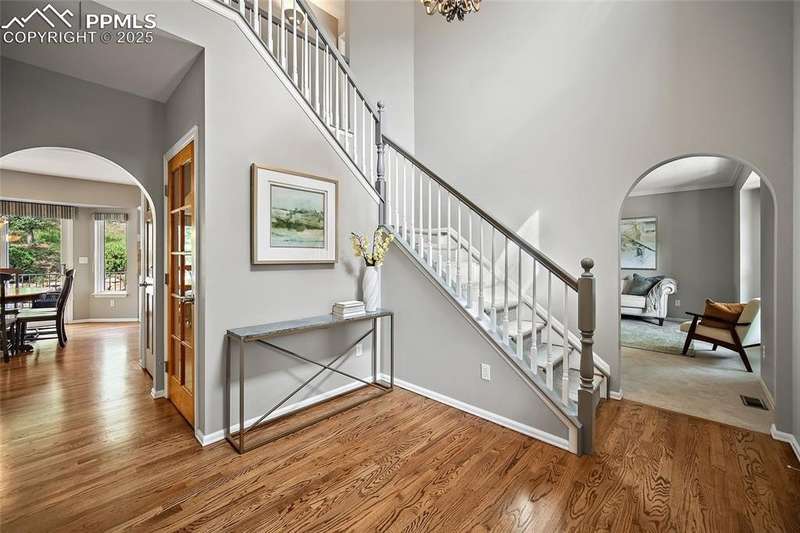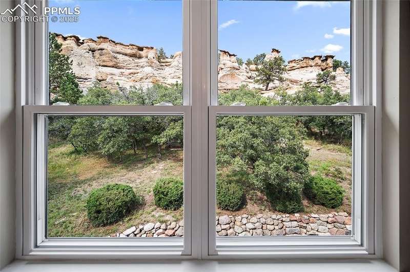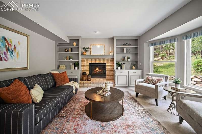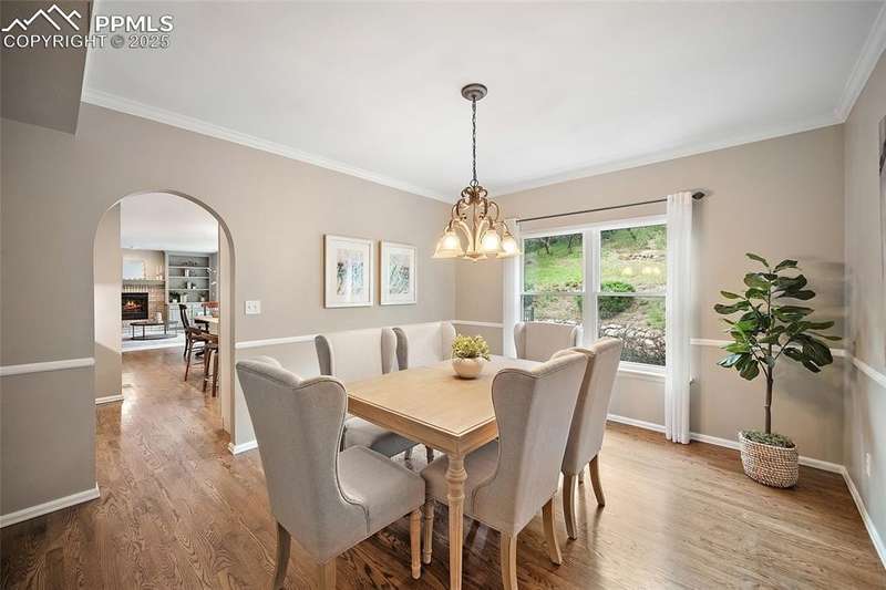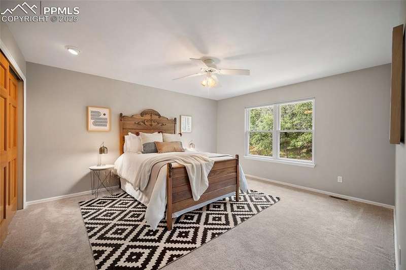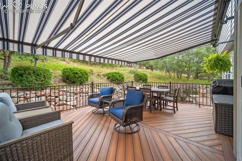 Drama and serenity come together in this meticulously maintained two-story home set against a backdrop of hoodoo rock formations on an exemplary street in the shadow of Blodgett Peak. A peaceful main level seamlessly melds formal spaces with more casual ones for comfortable living, and five bedrooms provide all the space you need for everyone you want to live with or visit you. A cozy family room sits off the kitchen/dining combo with fireplace and built-in bookcases, with a walk-out to a large composite deck complete with retractable awning that sits under towering hoodoos above for dramatic and private outdoor living. Four large upstairs bedrooms are anchored by a massive master suite with renovated bath that gorgeously presents a glass shower enclosure, separate tub, dual vanity and walk-in closet, and adds heated floors for extra comfort. The fully finished basement is so perfect for guests that they may never come upstairs, with a quiet bedroom, game space, kitchenette and a second cozy living space with gas fireplace, as well as a full bath and storage. The three-car garage includes cabinetry for storage and a built-in workbench, and the roof, exterior paint and furnace are all new since 2024. Situated on a neighborly tree-lined street in the lower part of Peregrine, the home is easily accessible to Woodmen Roberts Elementary School, hiking trails, I-25, shopping and restaurants.