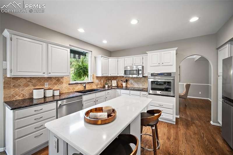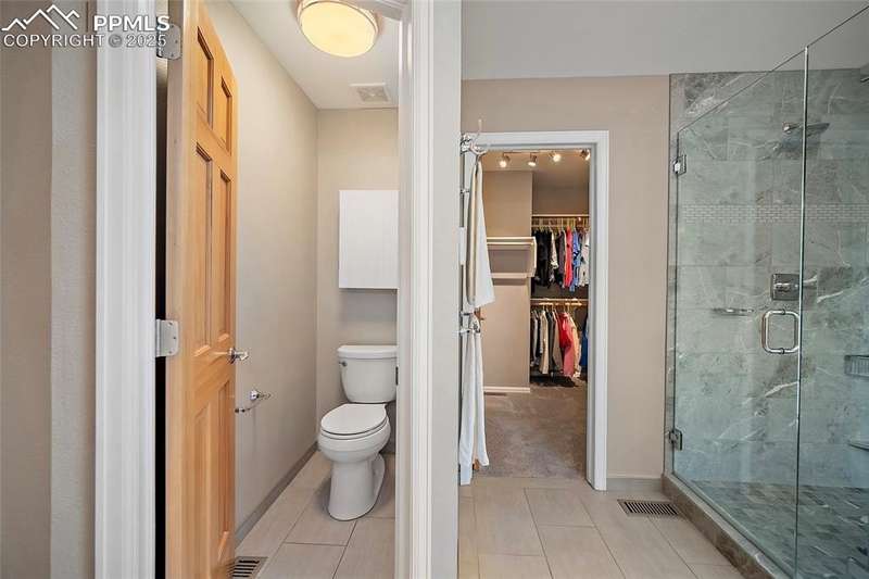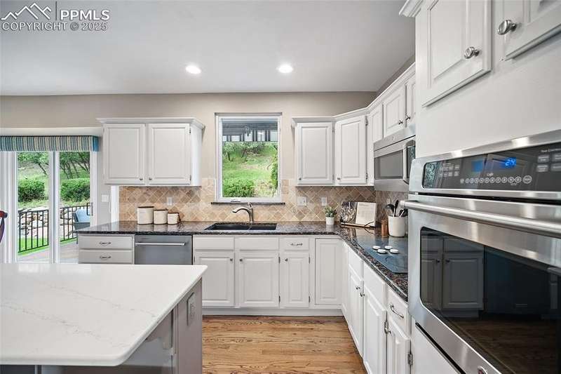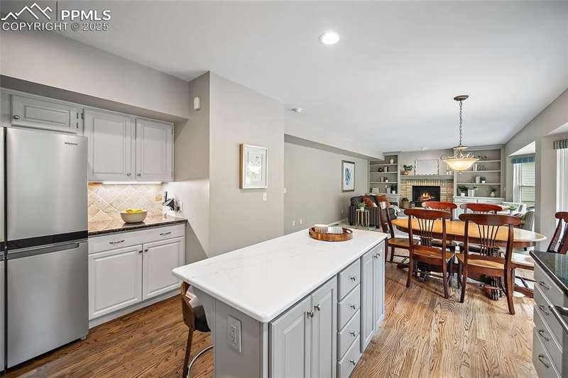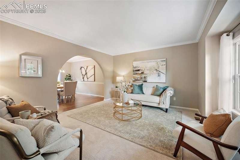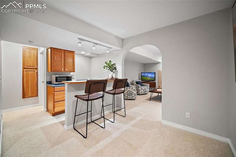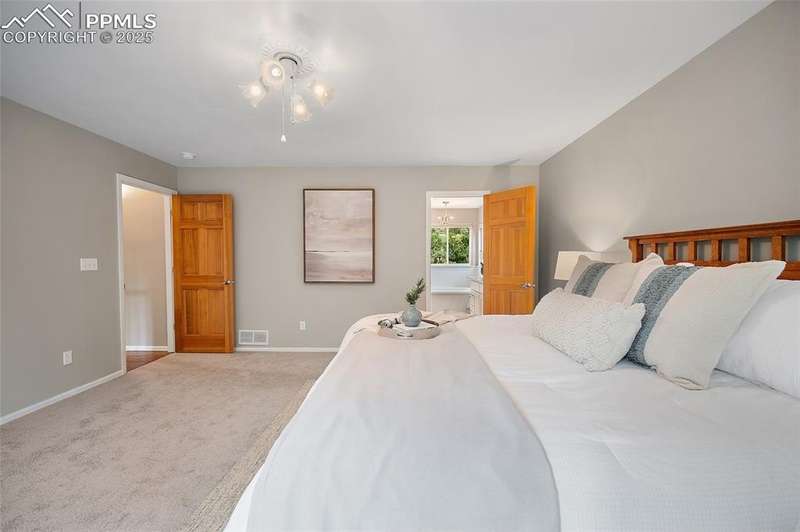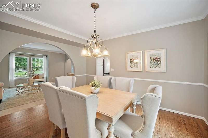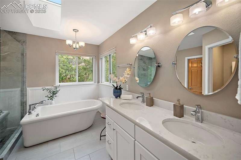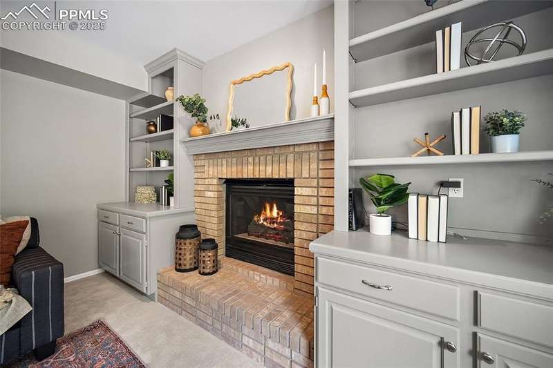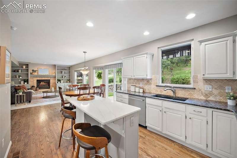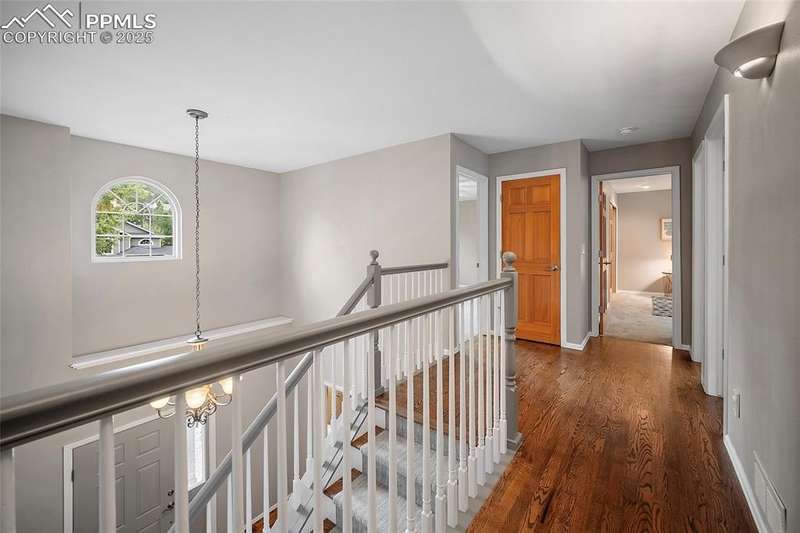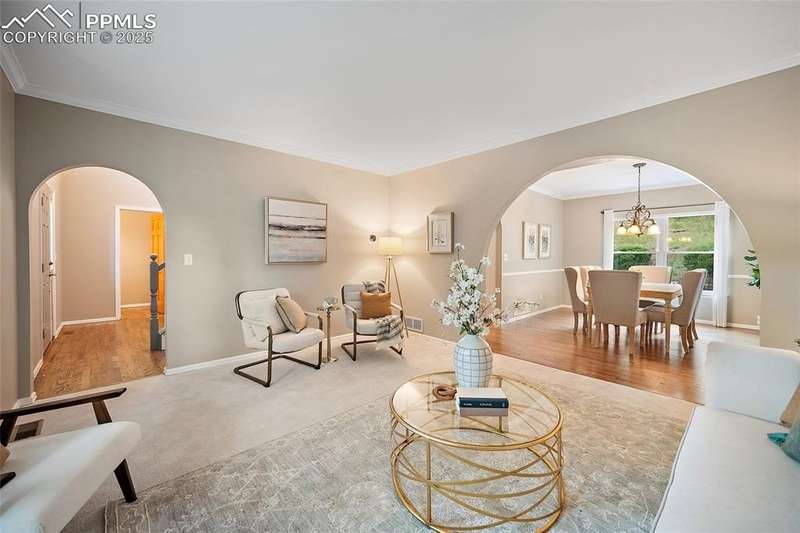 Drama and serenity come together in this meticulously maintained two-story home set against a backdrop of hoodoo rock formations on an exemplary street in the shadow of Blodgett Peak. A peaceful main level seamlessly melds formal spaces with more casual ones for comfortable living, and five bedrooms provide all the space you need for everyone you want to live with or visit you. A cozy family room sits off the kitchen/dining combo with fireplace and built-in bookcases, with a walk-out to a large composite deck complete with retractable awning that sits under towering hoodoos above for dramatic and private outdoor living. Four large upstairs bedrooms are anchored by a massive master suite with renovated bath that gorgeously presents a glass shower enclosure, separate tub, dual vanity and walk-in closet, and adds heated floors for extra comfort. The fully finished basement is so perfect for guests that they may never come upstairs, with a quiet bedroom, game space, kitchenette and a second cozy living space with gas fireplace, as well as a full bath and storage. The three-car garage includes cabinetry for storage and a built-in workbench, and the roof, exterior paint and furnace are all new since 2024. Situated on a neighborly tree-lined street in the lower part of Peregrine, the home is easily accessible to Woodmen Roberts Elementary School, hiking trails, I-25, shopping and restaurants.