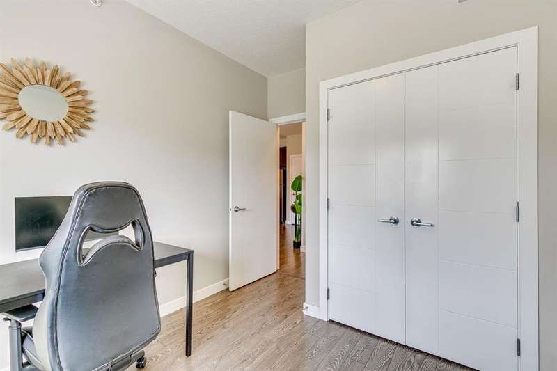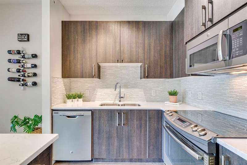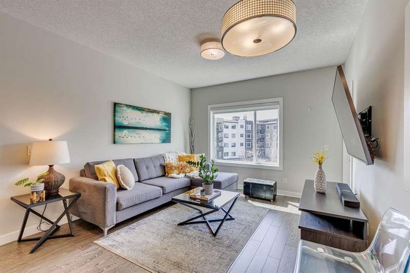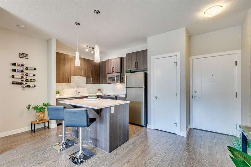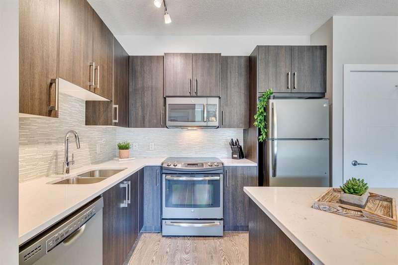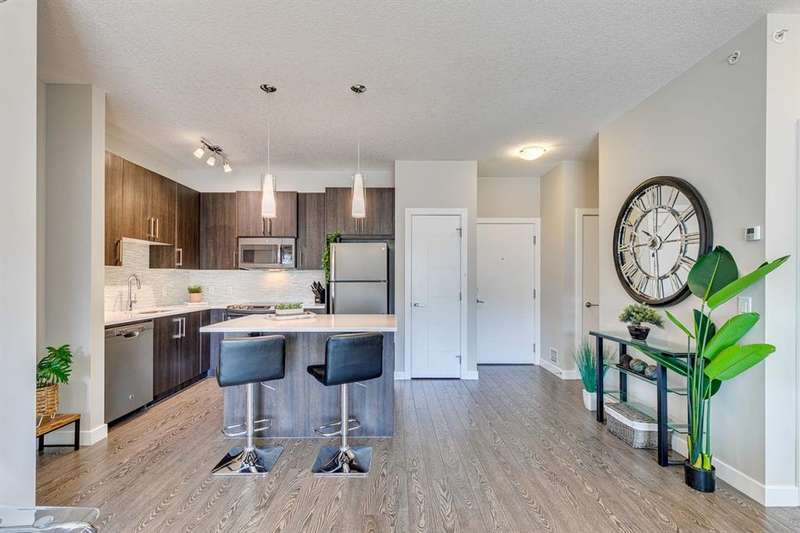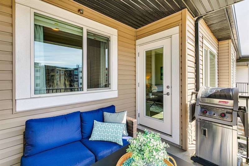 Welcome to your new home in the well-established community of Sage Hill. This stylish and thoughtfully designed 2 bedroom + den home offers the perfect blend of comfort, functionality, and a low-maintenance lifestyle. The open-concept layout is warm and inviting, with large windows that fill the space with natural light and provide great views of the neighbouring green space. The kitchen is a real standout—featuring sleek dark cabinets, upgraded stainless steel appliances, quartz countertops and a central island that’s perfect for casual meals, morning coffee, or catching up with friends. Step outside onto your private balcony—an ideal outdoor retreat with room for a comfy sofa, coffee table, and even a propane barbecue (yes, they’re allowed!). Whether you’re grilling dinner or unwinding with a book, this space is perfect for soaking up some fresh air and enjoying the view. The primary bedroom is spacious with accommodation for a king-size bed and offers generous closet space, giving you a quiet and cozy place to recharge. Two full bathrooms, including an ensuite, feature clean, modern finishes, and a second bedroom offers flexible space for guests, a home office, or hobbies. Plus, a pocket office gives you a compact workspace or alternatively in-suite storage. You’ll appreciate the quality touches throughout—durable hard-surface flooring, modern lighting, and a smart, efficient layout that makes the most of every square foot (over 800 of them!). And no need to worry about winter—this home comes with a titled, heated underground parking stall to keep your vehicle warm and protected all year round. Best of all, the building is pet-friendly, so your furry companion is welcome too (just be sure to ask for approval)! With this beautiful home, you’ll be close to everything—from shops and restaurants to parks, transit and walking paths. Whether you’re starting out, downsizing, or simply looking for a fresh space to call your own, this condo checks all the boxes.