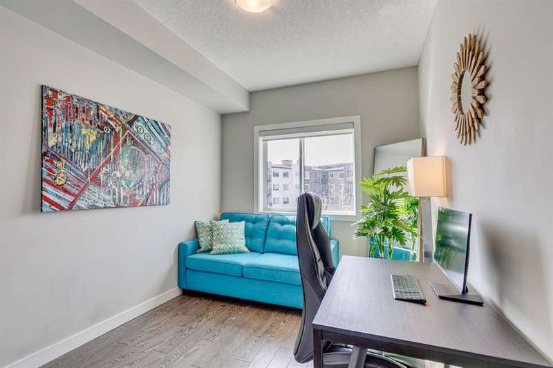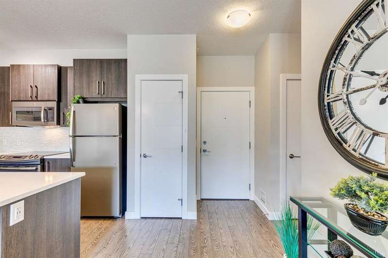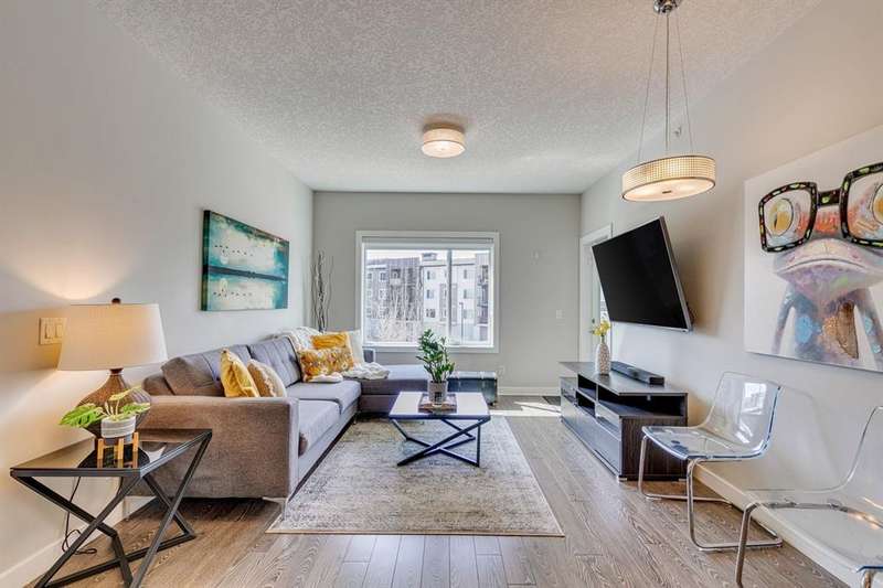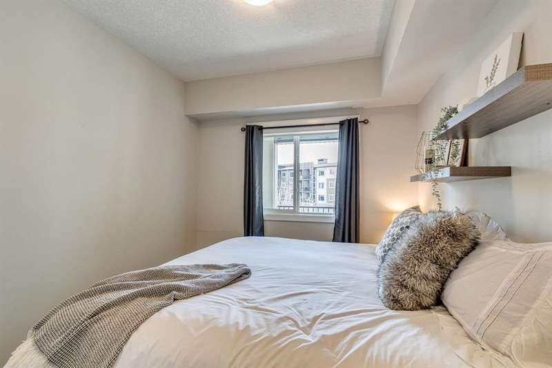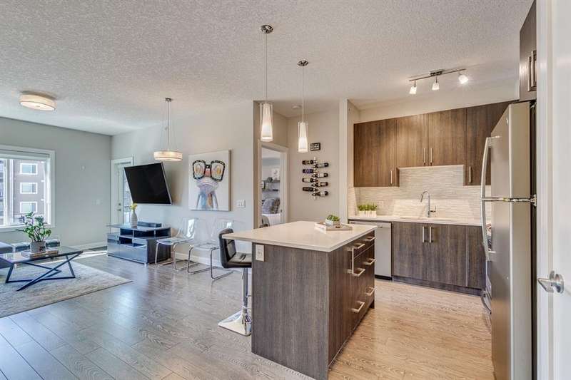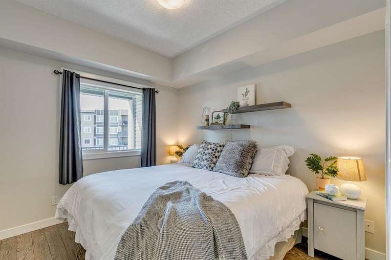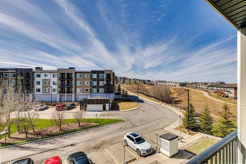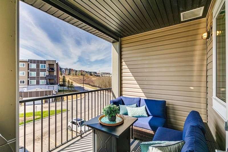 Welcome to your new home in the well-established community of Sage Hill. This stylish and thoughtfully designed 2 bedroom + den home offers the perfect blend of comfort, functionality, and a low-maintenance lifestyle. The open-concept layout is warm and inviting, with large windows that fill the space with natural light and provide great views of the neighbouring green space. The kitchen is a real standout—featuring sleek dark cabinets, upgraded stainless steel appliances, quartz countertops and a central island that’s perfect for casual meals, morning coffee, or catching up with friends. Step outside onto your private balcony—an ideal outdoor retreat with room for a comfy sofa, coffee table, and even a propane barbecue (yes, they’re allowed!). Whether you’re grilling dinner or unwinding with a book, this space is perfect for soaking up some fresh air and enjoying the view. The primary bedroom is spacious with accommodation for a king-size bed and offers generous closet space, giving you a quiet and cozy place to recharge. Two full bathrooms, including an ensuite, feature clean, modern finishes, and a second bedroom offers flexible space for guests, a home office, or hobbies. Plus, a pocket office gives you a compact workspace or alternatively in-suite storage. You’ll appreciate the quality touches throughout—durable hard-surface flooring, modern lighting, and a smart, efficient layout that makes the most of every square foot (over 800 of them!). And no need to worry about winter—this home comes with a titled, heated underground parking stall to keep your vehicle warm and protected all year round. Best of all, the building is pet-friendly, so your furry companion is welcome too (just be sure to ask for approval)! With this beautiful home, you’ll be close to everything—from shops and restaurants to parks, transit and walking paths. Whether you’re starting out, downsizing, or simply looking for a fresh space to call your own, this condo checks all the boxes.