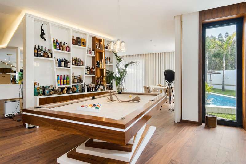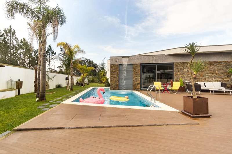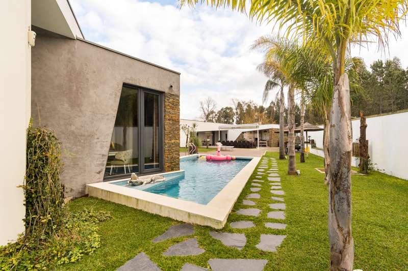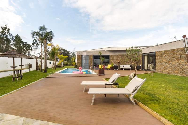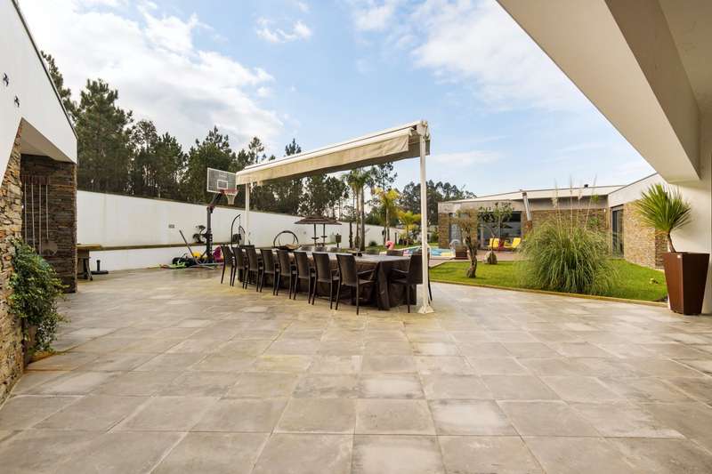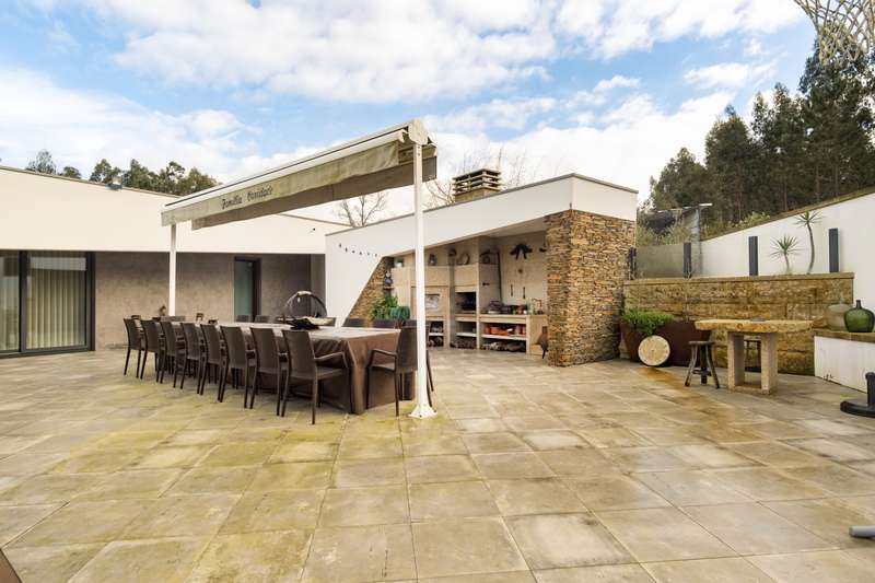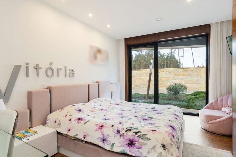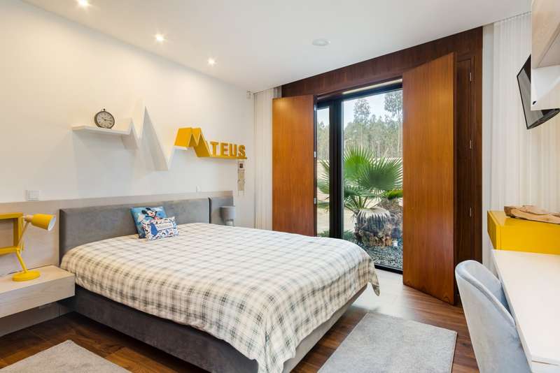 In Ovar, for sale is a distinguished luxury villa with four facades and outstanding construction quality that favours light, comfort, and tranquilly. This villa's expansive spaces and opulent embellishments, such as wood and natural stone, create a distinctive ambiance. Large windows and balconies saturate the house with natural light and facilitate interaction with the outdoors. In the main house, there are a spacious open-plan living room and kitchen, a living room, a games room with a bar and a guest toilet. The private area of the property contains three bedrooms with en suite bathrooms and an office. In addition, there is a three-car garage and a storage room. The exterior features a guesthouse, barbecue with dining area, heated swimming pool, playground, yard and a large garden surrounding the home, which is situated on a 2987m2 lot. The guesthouse has a local accommodation licence, a living room, kitchen, suite, swimming pool and landscaped outdoor space. Equipped with a reinforced door, ambient sound, triple glazing, electric thermal blinds, solar and photovoltaic panels, and air conditioning. The hotel is situated in a tranquil area, near to shops, services, and excellent highway access, and is only 10 minutes from the beach. CHARACTERISTICS: Plot Area: 2 987 m2 | 32 152 sq ft Deployment Area: 359 m2 | 3 862 sq ft Building Area: 359 m2 | 3 862 sq ft Bedrooms: 4 Bathrooms: 5 Garage: 3 Energy efficiency: A+ FEATURES: 4-Bedroom's House Guest House Garden Barbecue Heated pool Playground Backyard Air Conditioning Indoor and outdoor video surveillance Interior and exterior alarm Indoor and outdoor sound system Laundry