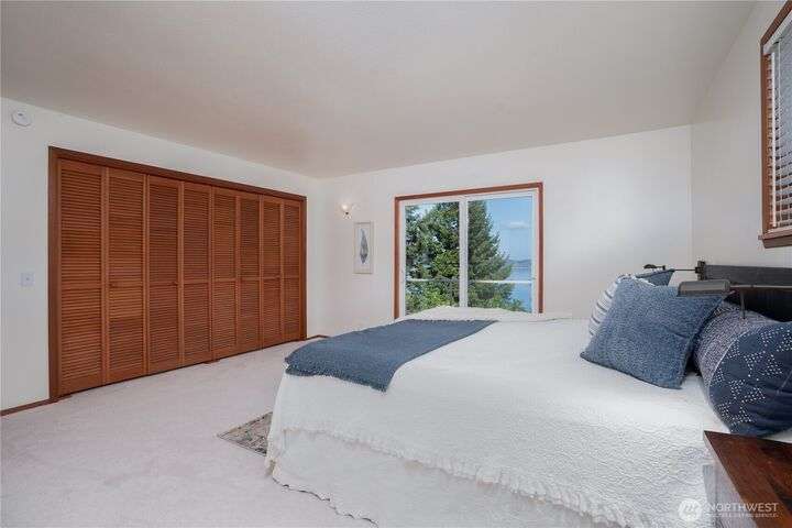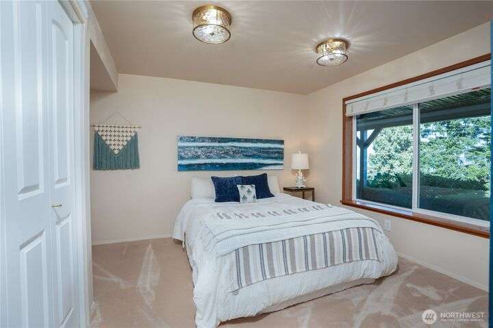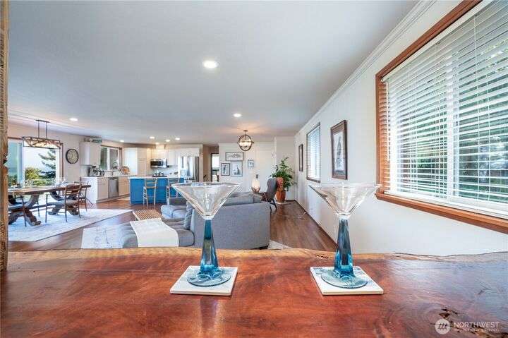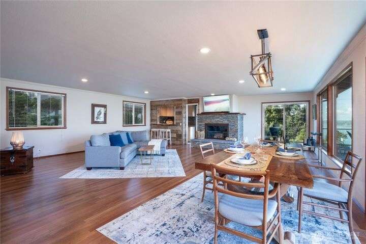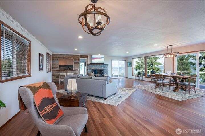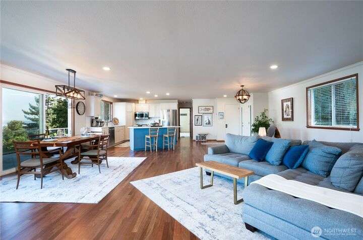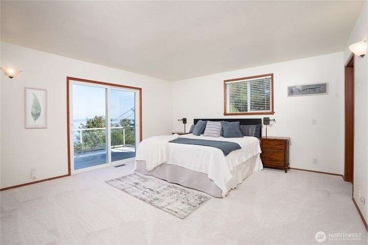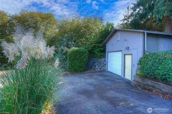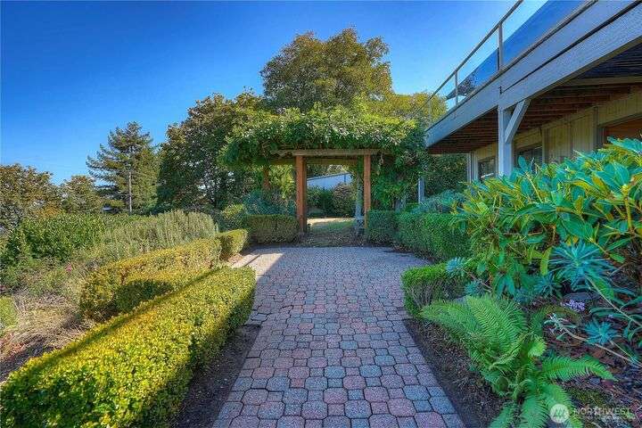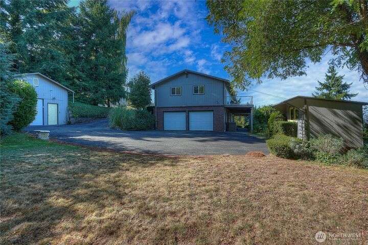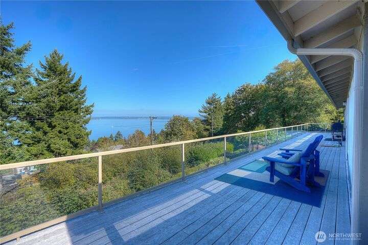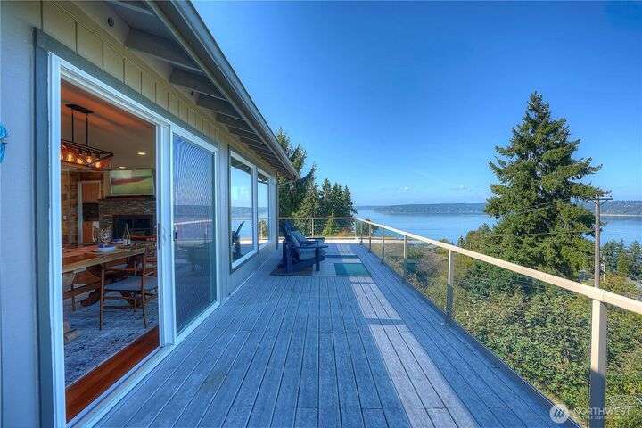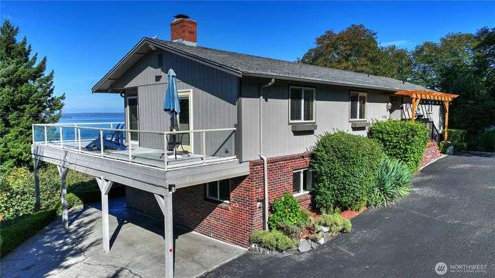 Enjoy sweeping views of Puget Sound & the Olympic Mtns from this 4BR/3BA custom NW contemporary. Nearly every room frames the stunning scenery, featuring an expansive 1,100 sq ft deck, a covered breezeway, terraced gardens with multiple private sitting areas, fruit trees, and quiet seclusion throughout. Inside, updates include new paint, quartz counters, and hardwoods. Laundry upstairs and downstairs. The open layout features a wet bar, fireplace, & workshop with a concrete floor—luxurious 5-pc primary bath w/large walk-in shower. There is an opportunity to convert the downstairs to an ADU with its own laundry. Comfort year-round w/heat pump, A/C & HEPA filtration. Ample storage w/4-car garage & carport.A private retreat to call home!