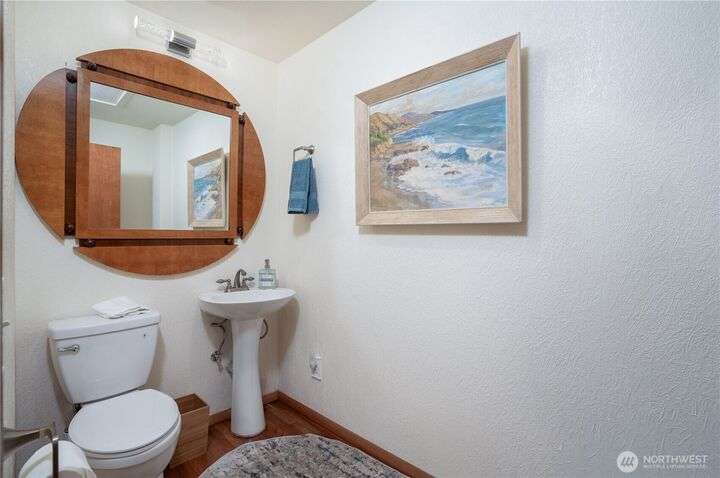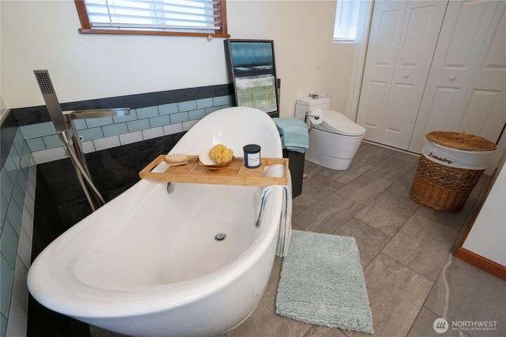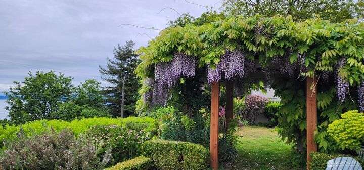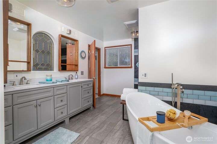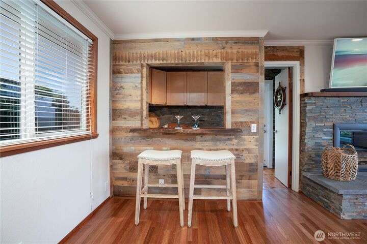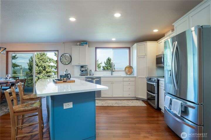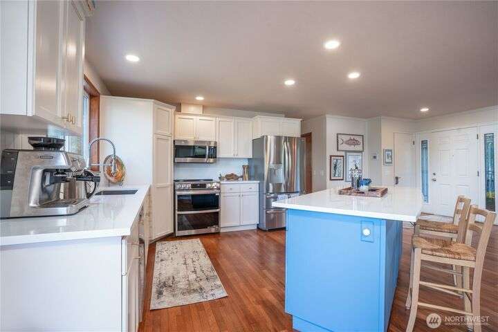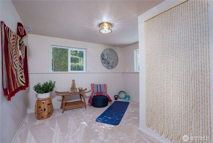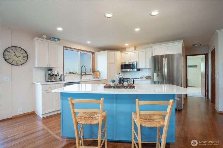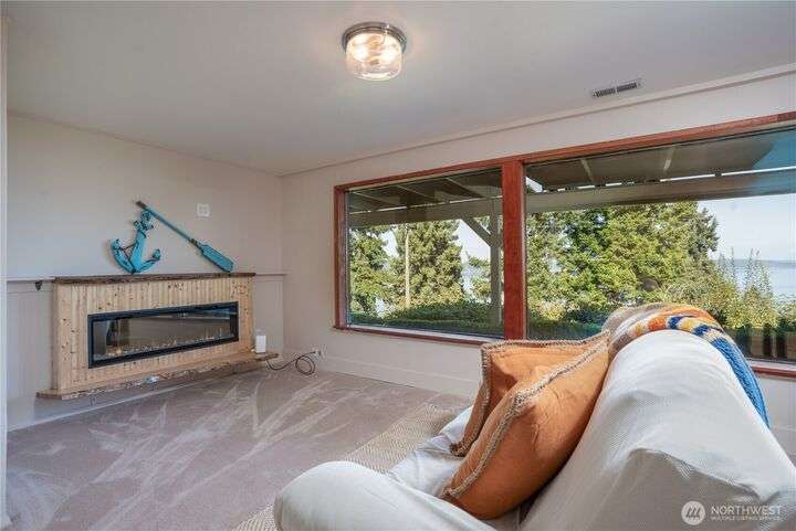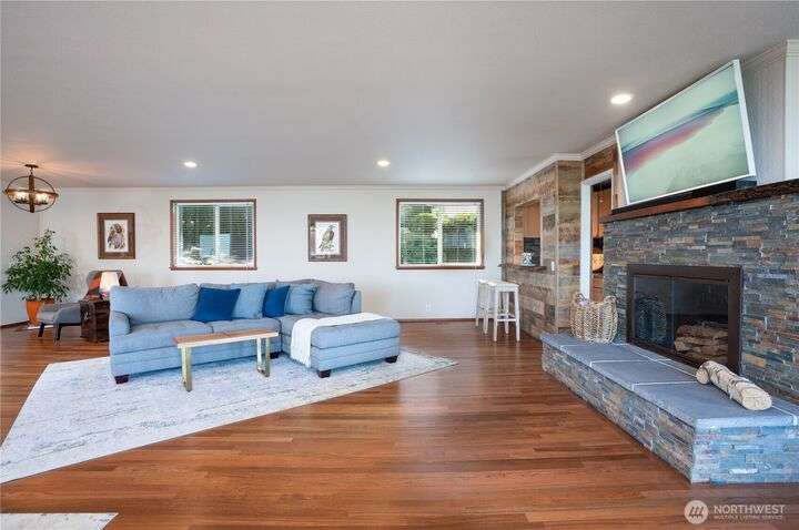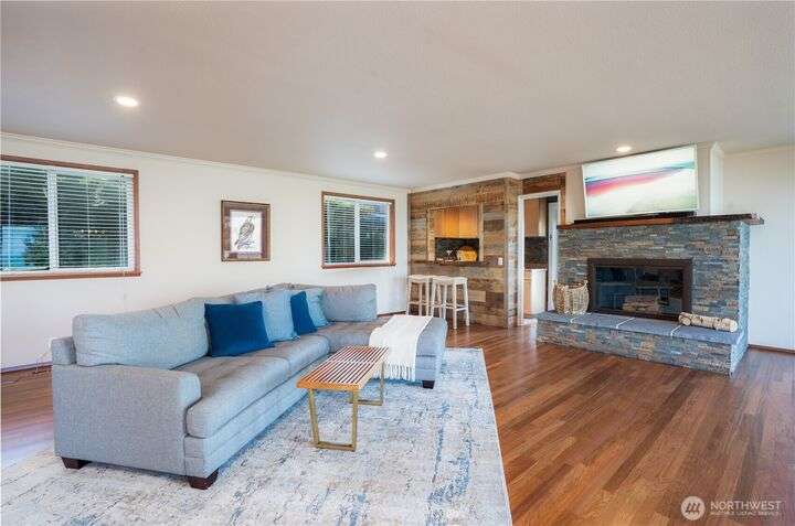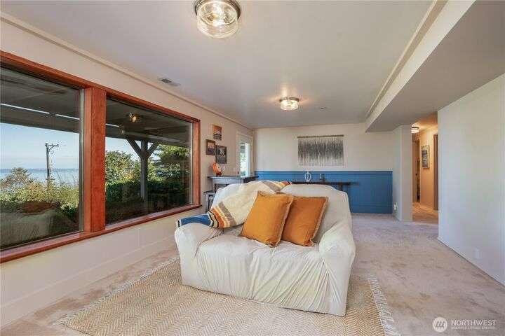 Enjoy sweeping views of Puget Sound & the Olympic Mtns from this 4BR/3BA custom NW contemporary. Nearly every room frames the stunning scenery, featuring an expansive 1,100 sq ft deck, a covered breezeway, terraced gardens with multiple private sitting areas, fruit trees, and quiet seclusion throughout. Inside, updates include new paint, quartz counters, and hardwoods. Laundry upstairs and downstairs. The open layout features a wet bar, fireplace, & workshop with a concrete floor—luxurious 5-pc primary bath w/large walk-in shower. There is an opportunity to convert the downstairs to an ADU with its own laundry. Comfort year-round w/heat pump, A/C & HEPA filtration. Ample storage w/4-car garage & carport.A private retreat to call home!