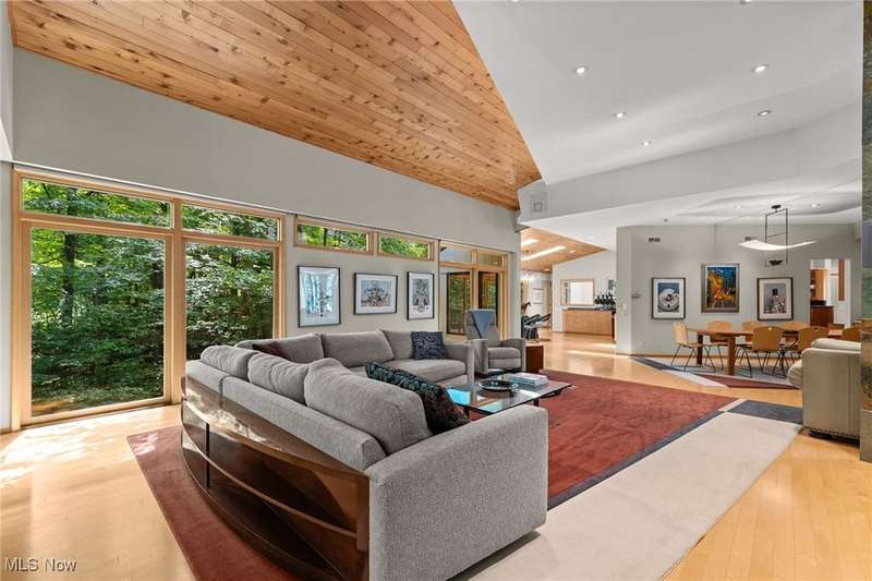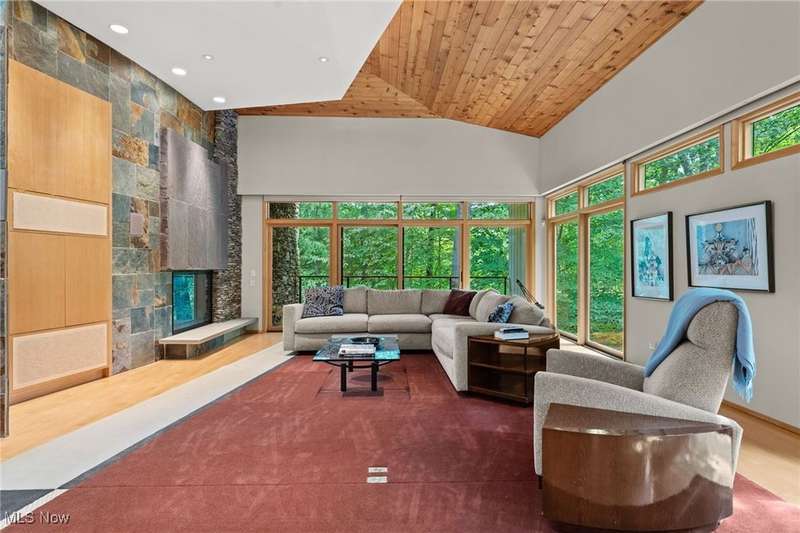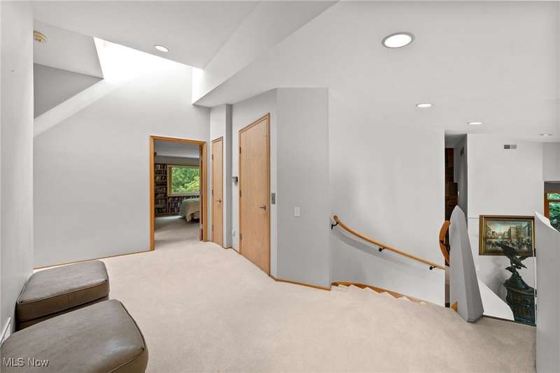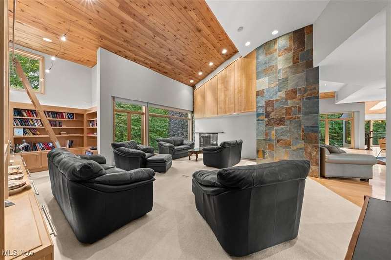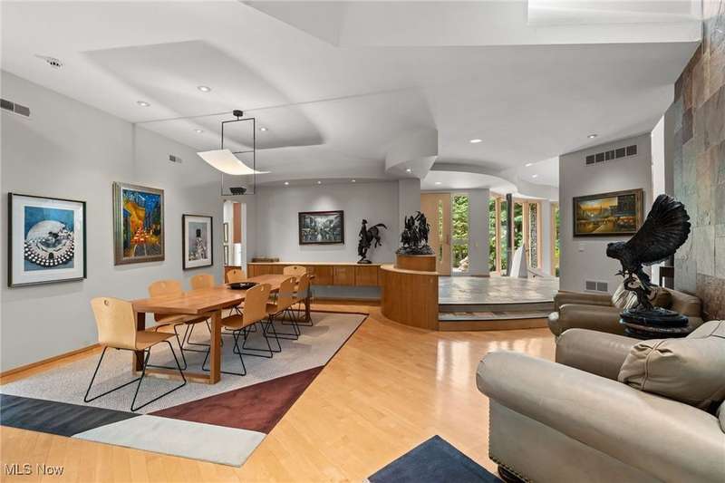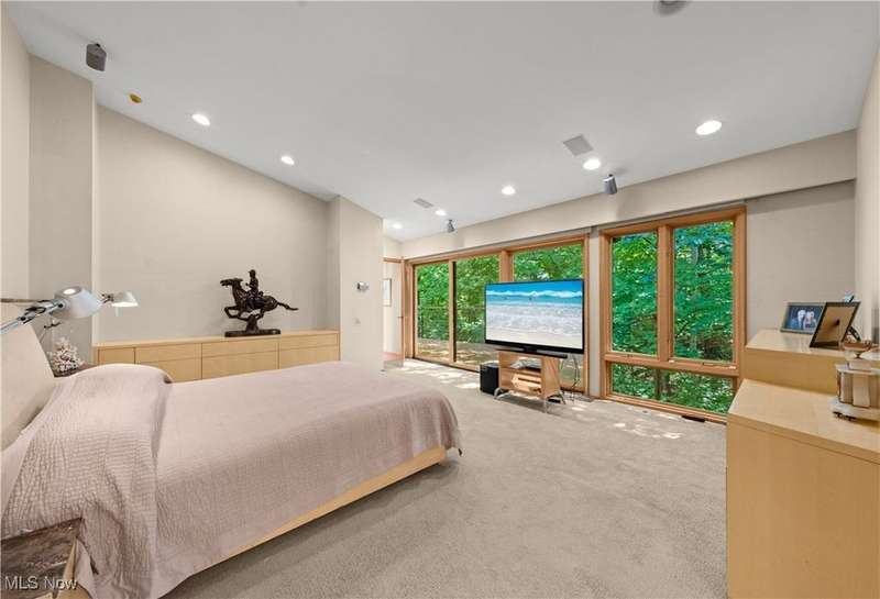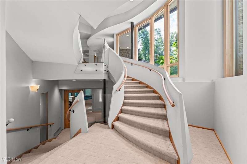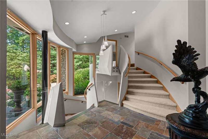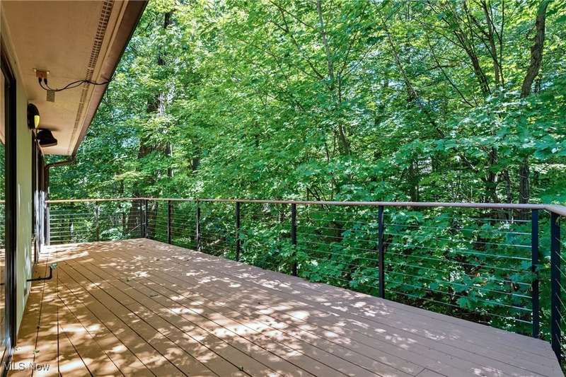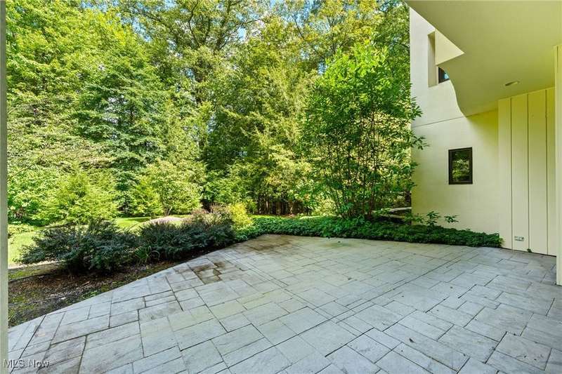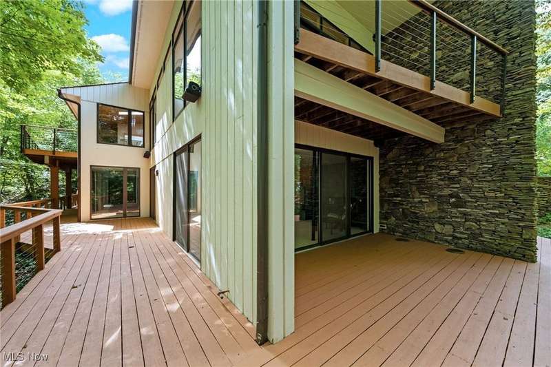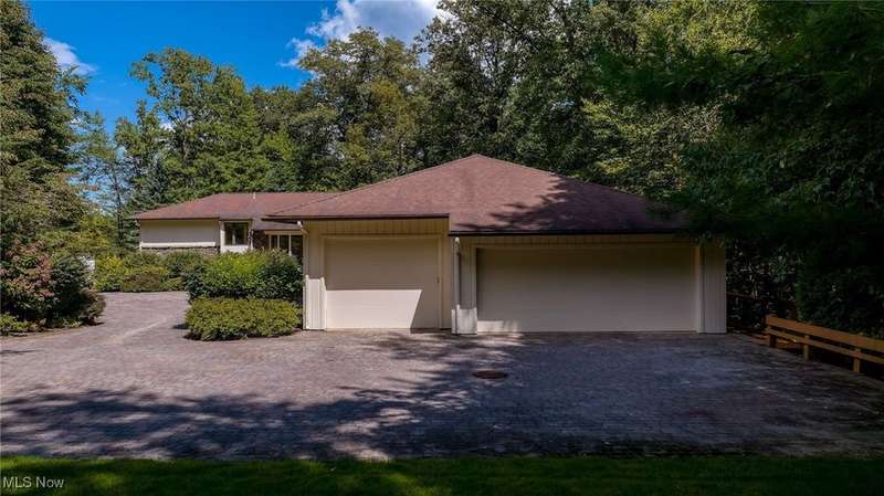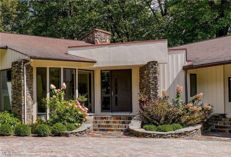 Remarkable modern design by Tony Crisafi (California architect) with a Frank LLoyd Wright influence. Sited on a gorgeous, wooded lot with a beautiful meandering creek, this home is designed for entertaining! A dramatic entry foyer with curved stairway opens onto the fabulous living area which consists of a great room and library separated by a dramatic fireplace, an open kitchen, and a fabulous dining room. These rooms all flow seamlessly together, have walls of glass to let the outdoors inside, and custom built-ins throughout! The first-floor owner's suite has dual bathrooms, a walk-in closet, and glorious views. The second floor of this home has 3 bedrooms and 2 full bathrooms! A mezzanine level down a couple of steps from the foyer features a huge multi-purpose room which can be a studio, exercise room, game room, or more! And then there is the one-of-a-kind walkout lower level which is simply second to none! There is an indoor lap pool, spa, family room, media room, and bar area! All of this is surrounded by walls of windows which overlook the beautiful landscape. This home as an elevator, wrap around decks, steam room, and lighting system! A truly one-of-a-kind property on one of Moreland Hills most sought after cul de sac streets!