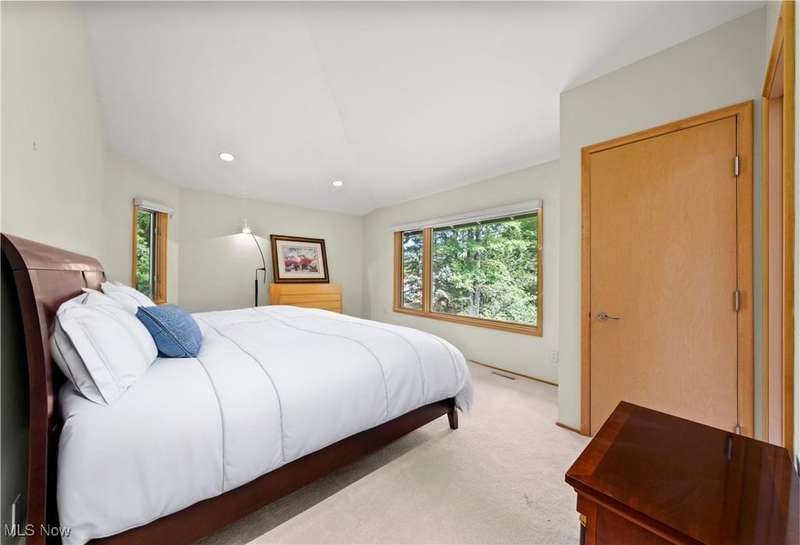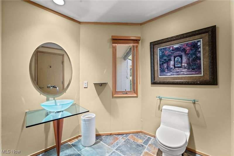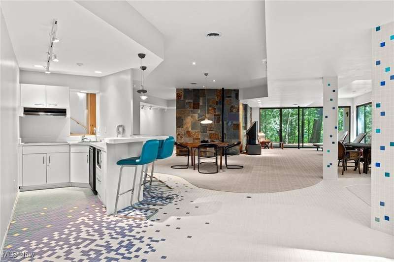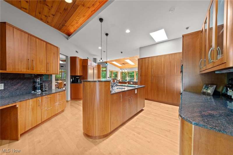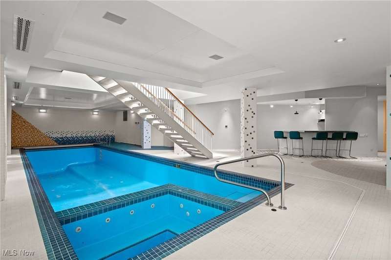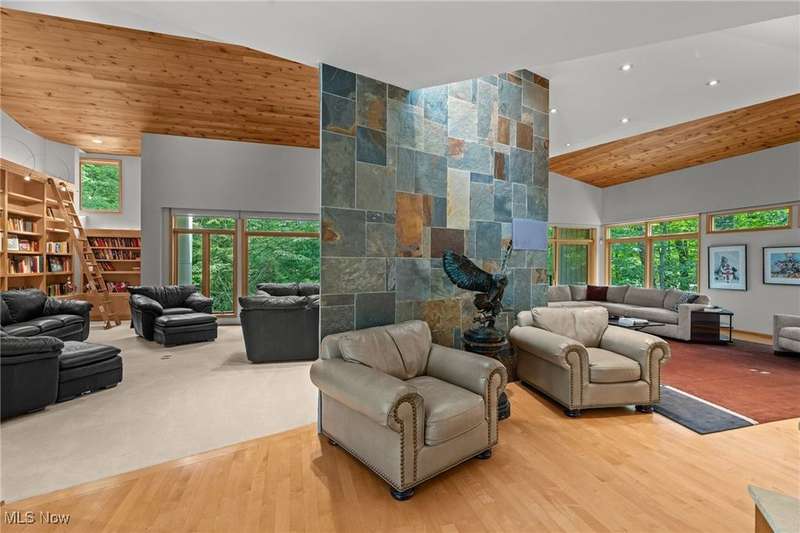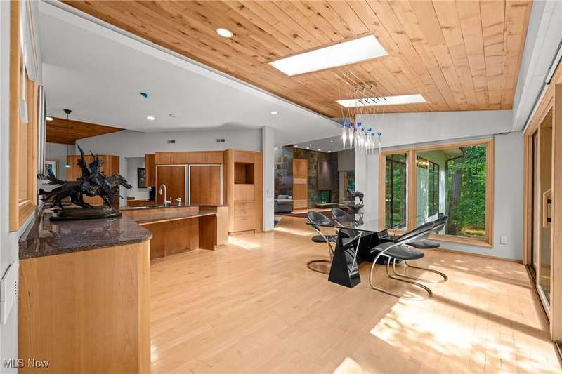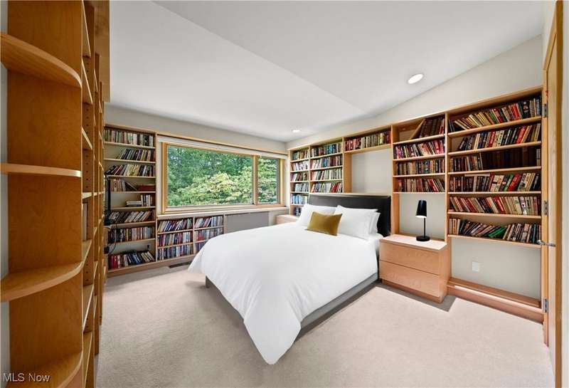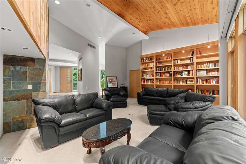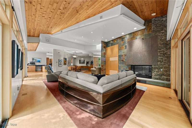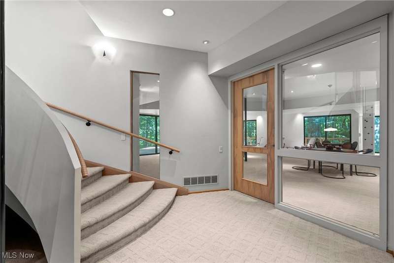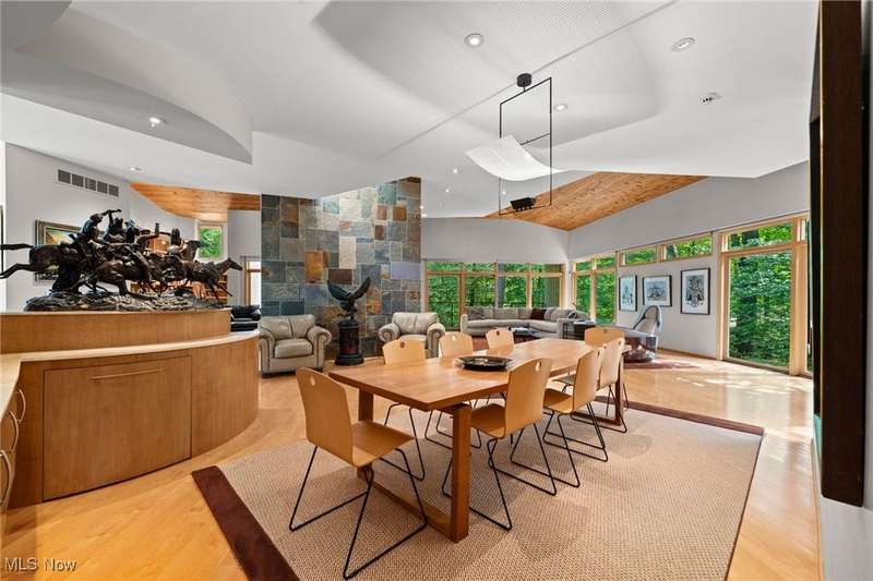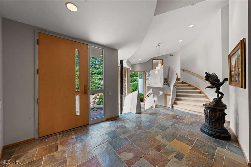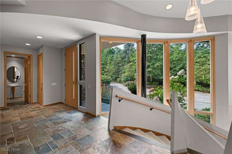 Remarkable modern design by Tony Crisafi (California architect) with a Frank LLoyd Wright influence. Sited on a gorgeous, wooded lot with a beautiful meandering creek, this home is designed for entertaining! A dramatic entry foyer with curved stairway opens onto the fabulous living area which consists of a great room and library separated by a dramatic fireplace, an open kitchen, and a fabulous dining room. These rooms all flow seamlessly together, have walls of glass to let the outdoors inside, and custom built-ins throughout! The first-floor owner's suite has dual bathrooms, a walk-in closet, and glorious views. The second floor of this home has 3 bedrooms and 2 full bathrooms! A mezzanine level down a couple of steps from the foyer features a huge multi-purpose room which can be a studio, exercise room, game room, or more! And then there is the one-of-a-kind walkout lower level which is simply second to none! There is an indoor lap pool, spa, family room, media room, and bar area! All of this is surrounded by walls of windows which overlook the beautiful landscape. This home as an elevator, wrap around decks, steam room, and lighting system! A truly one-of-a-kind property on one of Moreland Hills most sought after cul de sac streets!