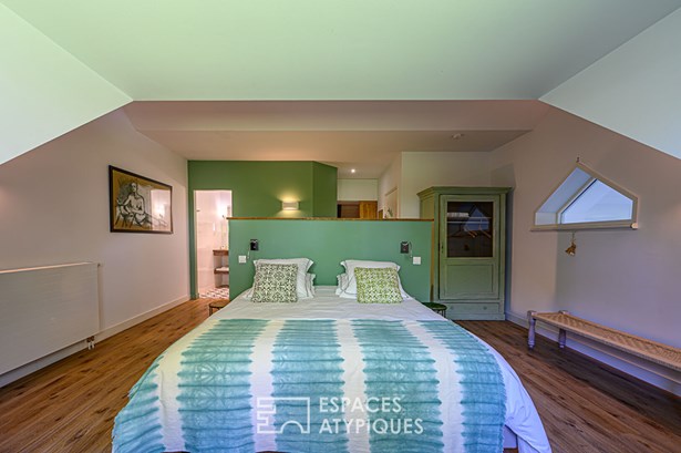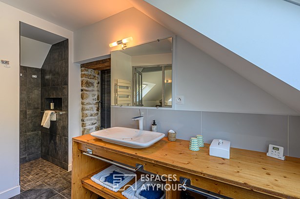 La maison de maitre se distingue par ses volumes, ses combles amenages et la presence de salles d'eau et de toilettes a chaque niveau, assurant praticite et intimite.