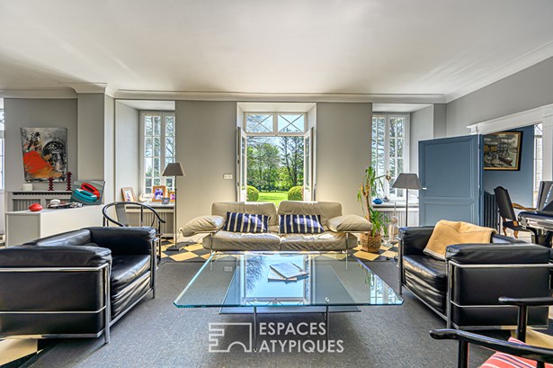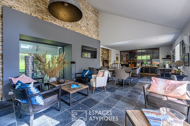 Des l'entree, parquets anciens, cheminees d'epoque, murs en pierre et poutres apparentes racontent son histoire, tandis que les materiaux nobles se melent en harmonie au confort moderne.