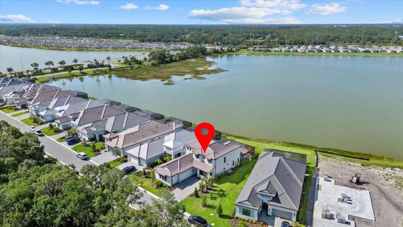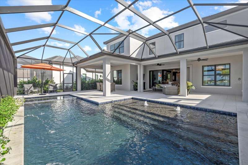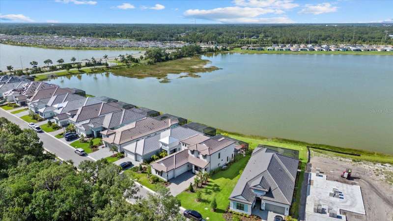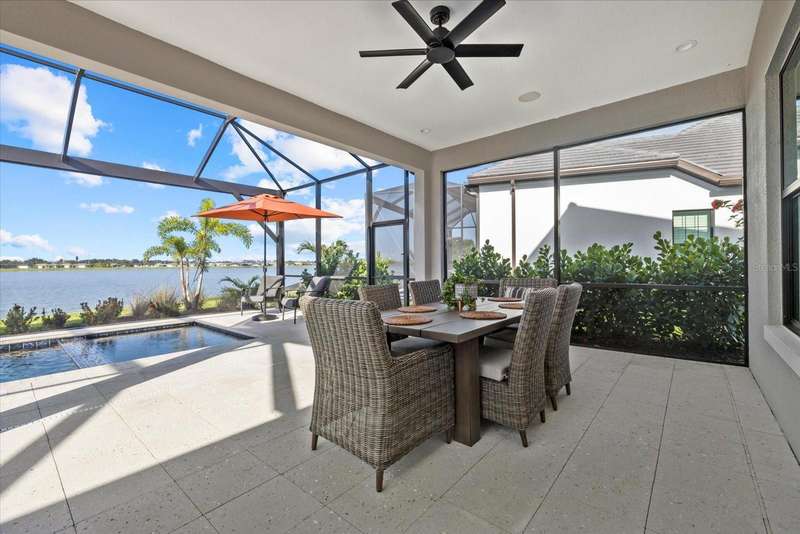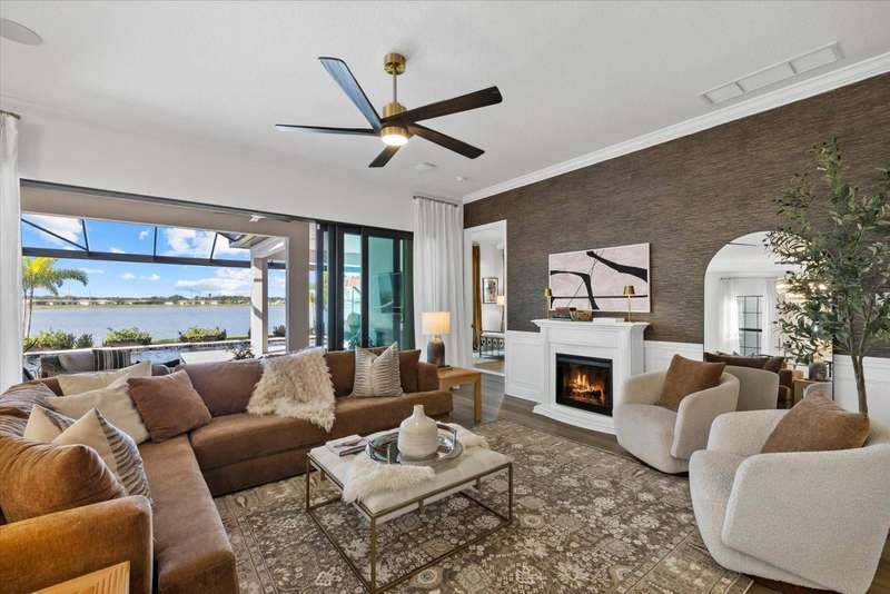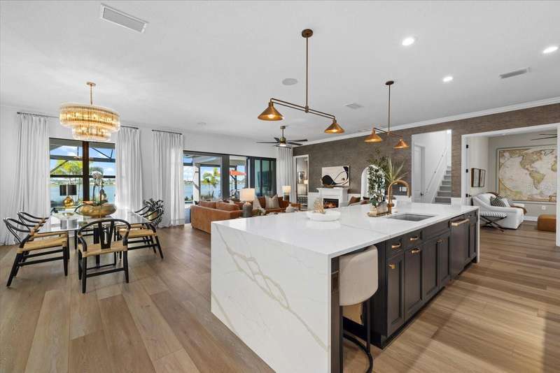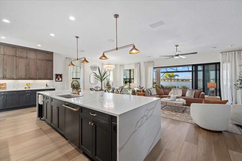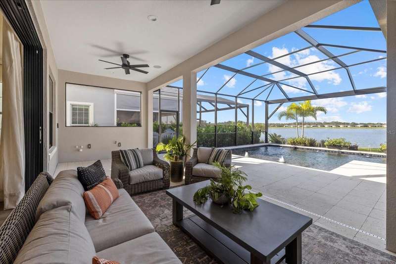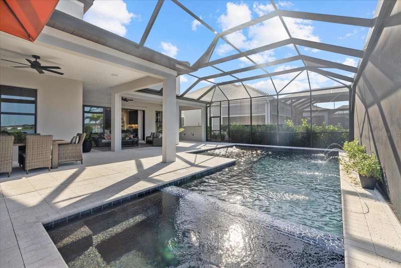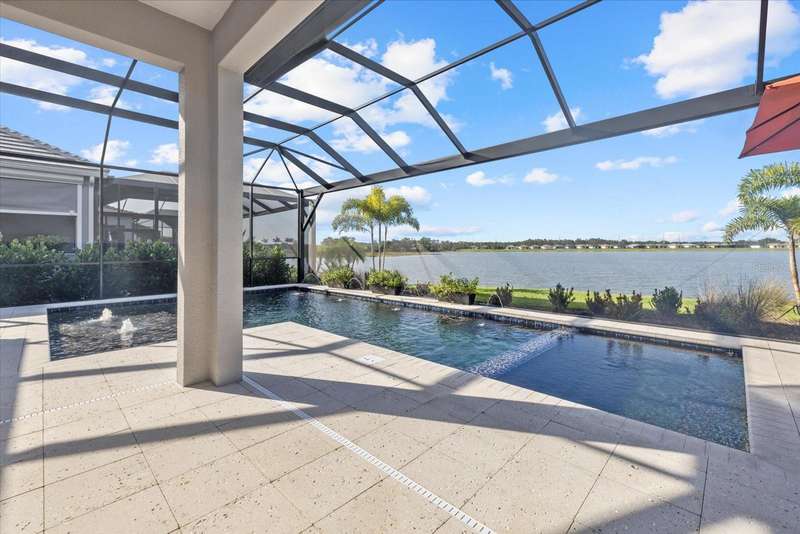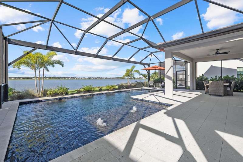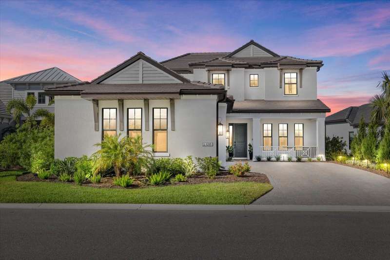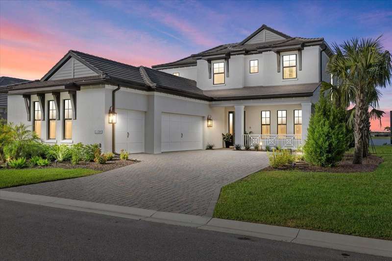 Experience refined coastal living in this exquisite West Indies-style home, perfectly positioned on one of the largest waterfront lots in The Alcove at Waterside. Custom built by Neal Signature Homes in 2024, this practically new 3,404 sq ft residence offers sweeping views of Blue Heron Lake, elevated interior design, and unforgettable sunsets. From the moment you enter, you're greeted by panoramic lake views that provide a stunning backdrop throughout the main living areas. Rich wood-look flooring flows across the first floor, accentuating the home’s clean architectural lines, elegant crown molding, tray ceilings, and curated designer finishes. At the heart of the home is a chef’s dream kitchen, ideal for entertaining. It features a striking waterfall island with seating, a gas cooktop, double ovens, a spacious walk-in pantry, and dual-toned cabinetry. The open-concept layout blends the kitchen, dining, and family rooms into a seamless space for harmonious living. Step outside into your private backyard oasis complete with a heated pool and spa, upgraded pavers, and a panoramic screened lanai—perfect for relaxing and entertaining year-round. Also on the first floor is an expansive bedroom with a walk-in closet and private en-suite bath—an ideal space that could effortlessly function as a secondary primary bedroom. This level also features a refined den or office, an elegant powder bath, and a thoughtfully designed mudroom for everyday convenience. Upstairs, the primary suite offers a true retreat, complete with dual sink vanities, a spa-inspired smart shower, and expansive his-and-hers walk-in closets. The second level also features two additional bedrooms, a full bath, a spacious bonus room, and a generously sized laundry room for added ease and efficiency. Other notable features of this all-encompassing 4,952 square foot home include: hurricane – grade impact windows and sliders, alarm system with camera, and a three-car garage with epoxy flooring. Residents of The Alcove at Waterside enjoy a boutique community of just 47 lakeside homes, with access to a private kayak launch on Blue Heron Lake. Located in Lakewood Ranch’s sought-after Waterside District, you’re moments from Waterside Place’s dining and shopping, and the vibrant events and recreation at Waterside Park. HOA includes full landscaping for a maintenance-free lifestyle.