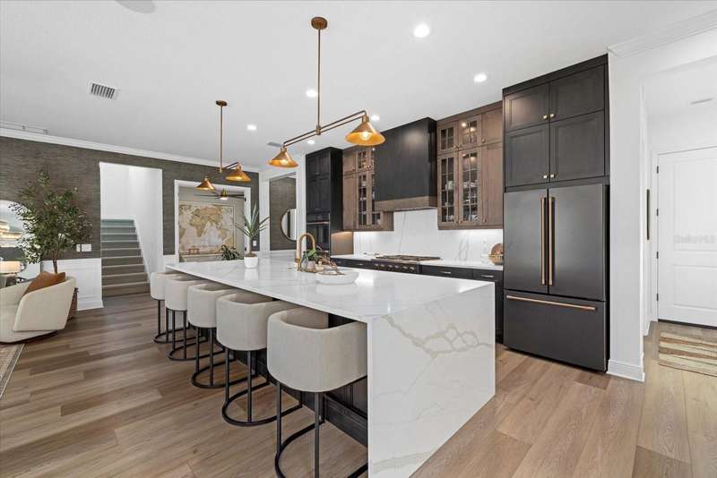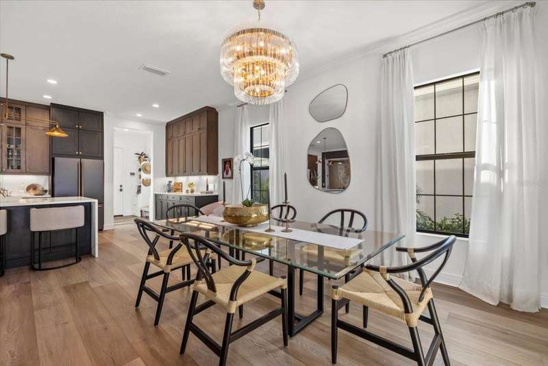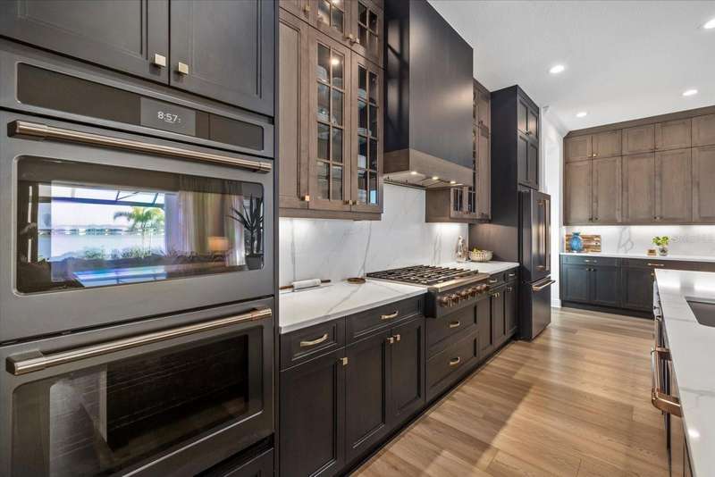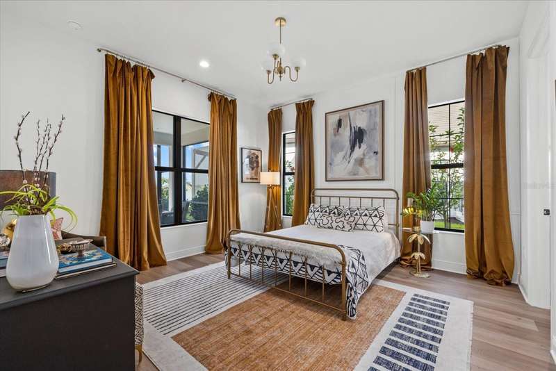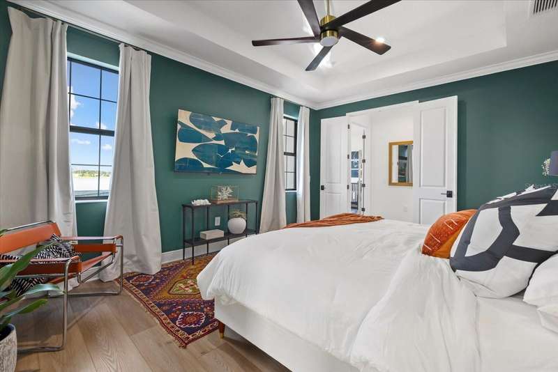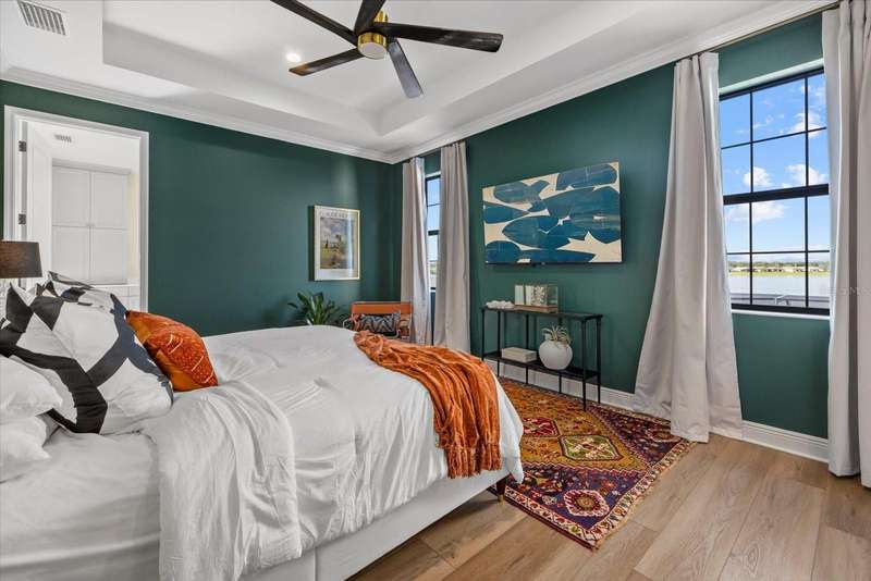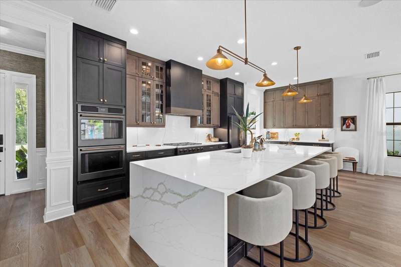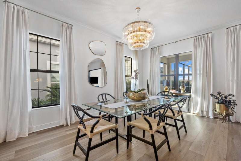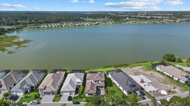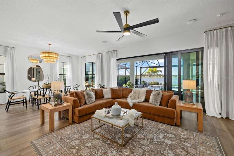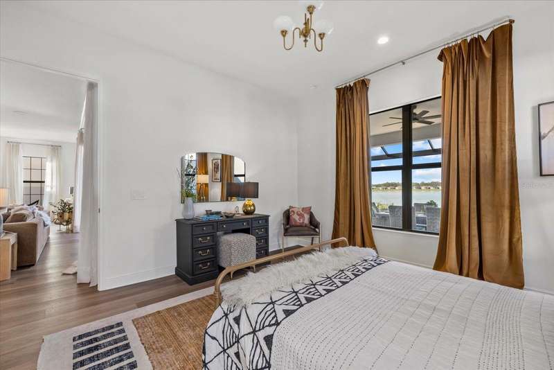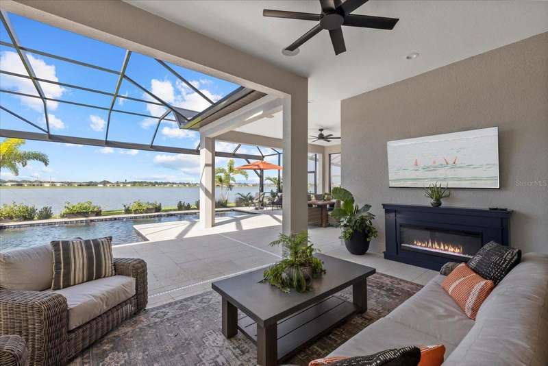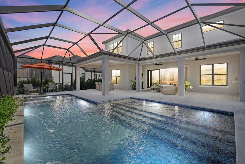 Experience refined coastal living in this exquisite West Indies-style home, perfectly positioned on one of the largest waterfront lots in The Alcove at Waterside. Custom built by Neal Signature Homes in 2024, this practically new 3,404 sq ft residence offers sweeping views of Blue Heron Lake, elevated interior design, and unforgettable sunsets. From the moment you enter, you're greeted by panoramic lake views that provide a stunning backdrop throughout the main living areas. Rich wood-look flooring flows across the first floor, accentuating the home’s clean architectural lines, elegant crown molding, tray ceilings, and curated designer finishes. At the heart of the home is a chef’s dream kitchen, ideal for entertaining. It features a striking waterfall island with seating, a gas cooktop, double ovens, a spacious walk-in pantry, and dual-toned cabinetry. The open-concept layout blends the kitchen, dining, and family rooms into a seamless space for harmonious living. Step outside into your private backyard oasis complete with a heated pool and spa, upgraded pavers, and a panoramic screened lanai—perfect for relaxing and entertaining year-round. Also on the first floor is an expansive bedroom with a walk-in closet and private en-suite bath—an ideal space that could effortlessly function as a secondary primary bedroom. This level also features a refined den or office, an elegant powder bath, and a thoughtfully designed mudroom for everyday convenience. Upstairs, the primary suite offers a true retreat, complete with dual sink vanities, a spa-inspired smart shower, and expansive his-and-hers walk-in closets. The second level also features two additional bedrooms, a full bath, a spacious bonus room, and a generously sized laundry room for added ease and efficiency. Other notable features of this all-encompassing 4,952 square foot home include: hurricane – grade impact windows and sliders, alarm system with camera, and a three-car garage with epoxy flooring. Residents of The Alcove at Waterside enjoy a boutique community of just 47 lakeside homes, with access to a private kayak launch on Blue Heron Lake. Located in Lakewood Ranch’s sought-after Waterside District, you’re moments from Waterside Place’s dining and shopping, and the vibrant events and recreation at Waterside Park. HOA includes full landscaping for a maintenance-free lifestyle.