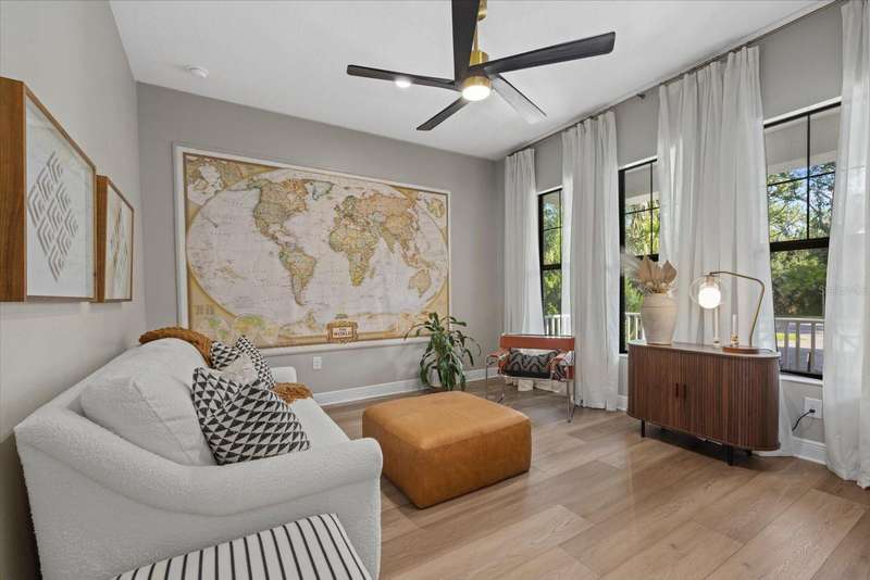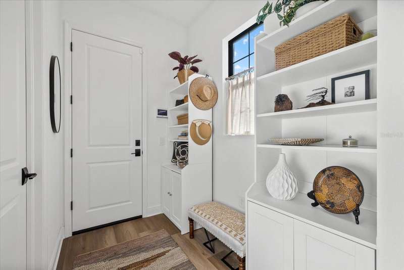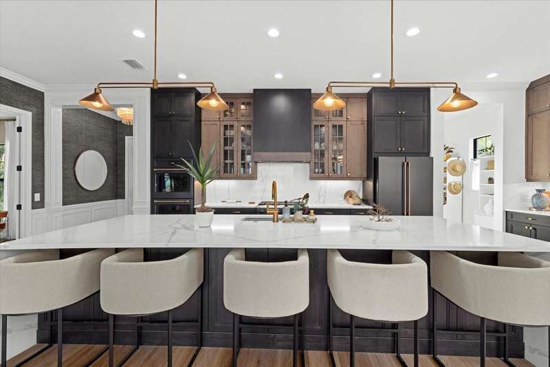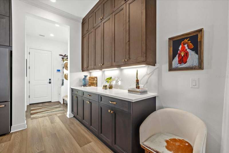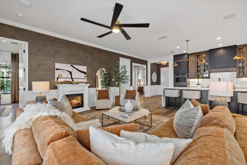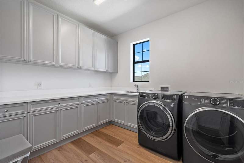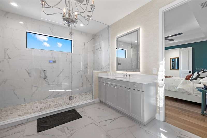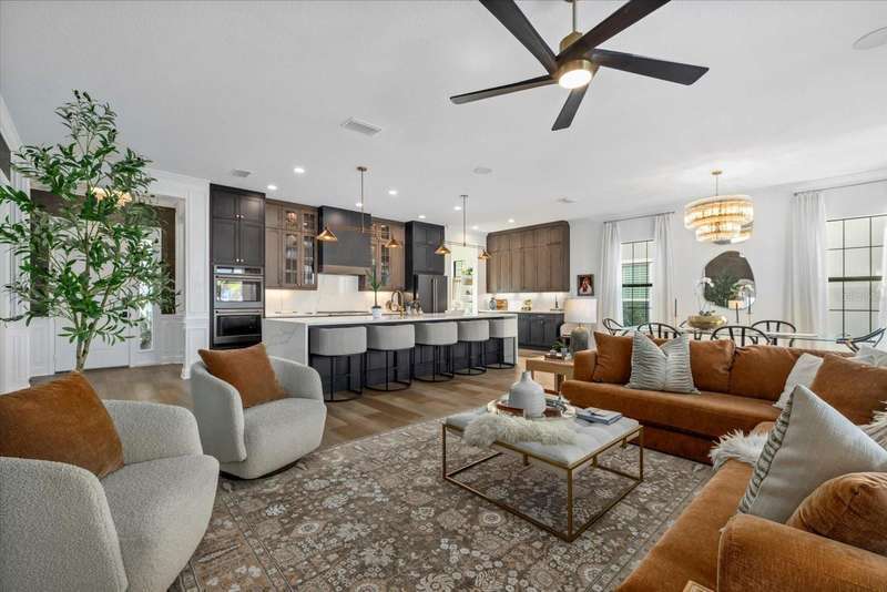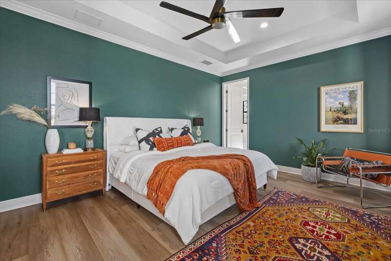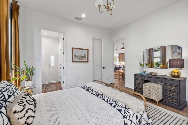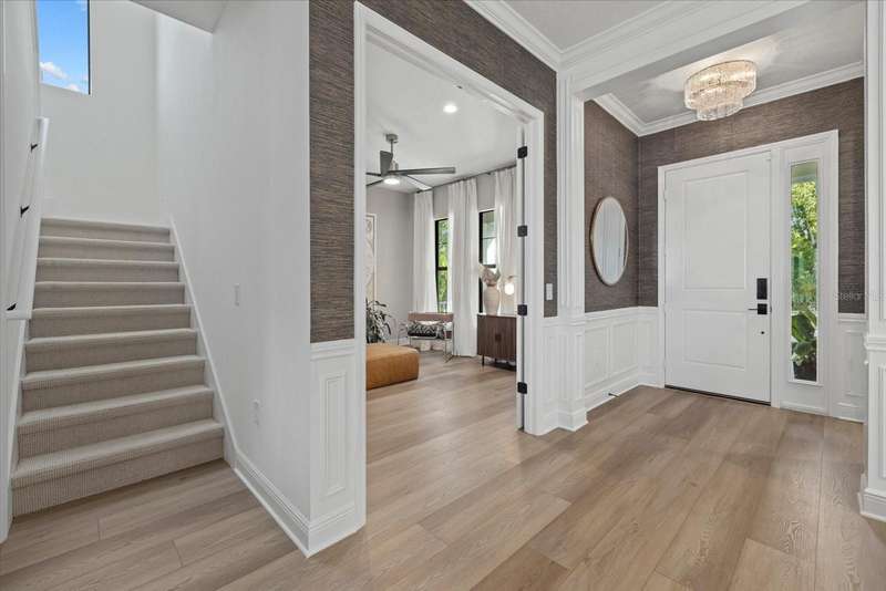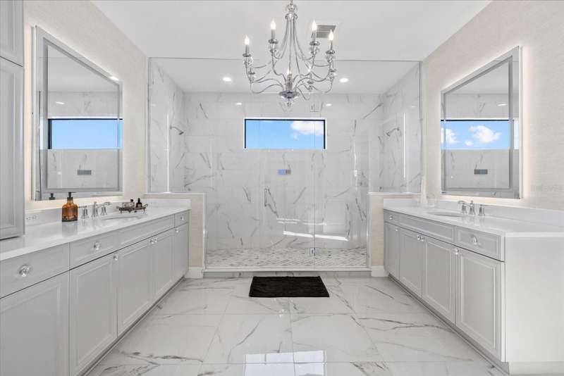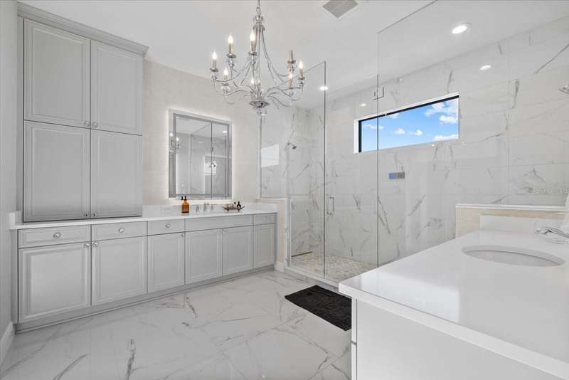 Experience refined coastal living in this exquisite West Indies-style home, perfectly positioned on one of the largest waterfront lots in The Alcove at Waterside. Custom built by Neal Signature Homes in 2024, this practically new 3,404 sq ft residence offers sweeping views of Blue Heron Lake, elevated interior design, and unforgettable sunsets. From the moment you enter, you're greeted by panoramic lake views that provide a stunning backdrop throughout the main living areas. Rich wood-look flooring flows across the first floor, accentuating the home’s clean architectural lines, elegant crown molding, tray ceilings, and curated designer finishes. At the heart of the home is a chef’s dream kitchen, ideal for entertaining. It features a striking waterfall island with seating, a gas cooktop, double ovens, a spacious walk-in pantry, and dual-toned cabinetry. The open-concept layout blends the kitchen, dining, and family rooms into a seamless space for harmonious living. Step outside into your private backyard oasis complete with a heated pool and spa, upgraded pavers, and a panoramic screened lanai—perfect for relaxing and entertaining year-round. Also on the first floor is an expansive bedroom with a walk-in closet and private en-suite bath—an ideal space that could effortlessly function as a secondary primary bedroom. This level also features a refined den or office, an elegant powder bath, and a thoughtfully designed mudroom for everyday convenience. Upstairs, the primary suite offers a true retreat, complete with dual sink vanities, a spa-inspired smart shower, and expansive his-and-hers walk-in closets. The second level also features two additional bedrooms, a full bath, a spacious bonus room, and a generously sized laundry room for added ease and efficiency. Other notable features of this all-encompassing 4,952 square foot home include: hurricane – grade impact windows and sliders, alarm system with camera, and a three-car garage with epoxy flooring. Residents of The Alcove at Waterside enjoy a boutique community of just 47 lakeside homes, with access to a private kayak launch on Blue Heron Lake. Located in Lakewood Ranch’s sought-after Waterside District, you’re moments from Waterside Place’s dining and shopping, and the vibrant events and recreation at Waterside Park. HOA includes full landscaping for a maintenance-free lifestyle.