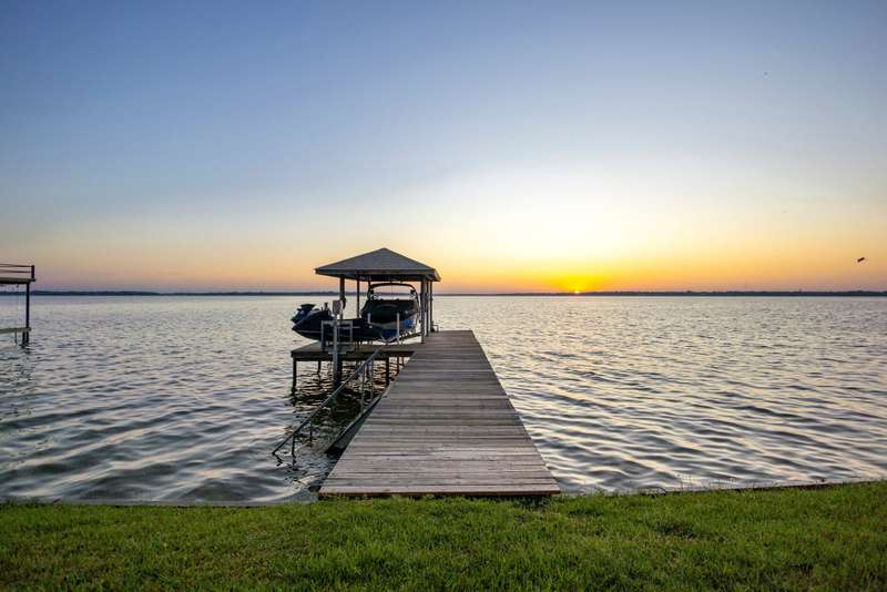 Wake up to breathtaking sunrises and sweeping waterfront views in this stunning lakefront retreat. Featuring some of the deepest, most desirable water on the lake, this property offers effortless access to all your favorite water activities fish, paddleboard, kayak, or swim right from your private dock.Inside, a wall of windows floods the open-concept living spaces with natural light, while the wraparound deck invites you to relax and take in the panoramic views. The well-equipped kitchen, complete with a large island, double ovens, and dishwasher, is perfect for entertaining family and friends.A spacious downstairs great room provides a separate area for gatherings, with direct access to a covered porch that extends your living space outdoors. This 4-bedroom, 3-bath home comfortably sleeps up to 17 guestsideal for hosting large families, friends, or as a lucrative short-term rental investment. One bedroom has been converted into a convenient wet room, ideal for storing all your lake gear after a day on the water.The home comes beautifully furnished, and all furnishings convey with the sale, so you can start enjoying lake life from day one.The covered boat dock includes three liftsone for a boat and two for jet skisplus a convenient stair entry to the lake.Located only five minutes from the marina, youll enjoy easy access to gas and boat-up dining. Just a short commute to local favorites such as Figs Steakhouse, Figs Backyard, Triple N Ranch Winery, Whistlestop Caf, Lone Star Marina, and Tiki Hut Bar & Grill. The new Eight at Tool community park is nearby, offering pickleball courts, walking trails, a playground, and a dog park.Whether youre looking for a primary residence, weekend getaway, or investment opportunity, this property offers the perfect blend of comfort, convenience, and waterfront charm.Life is shortstart making lake memories today!