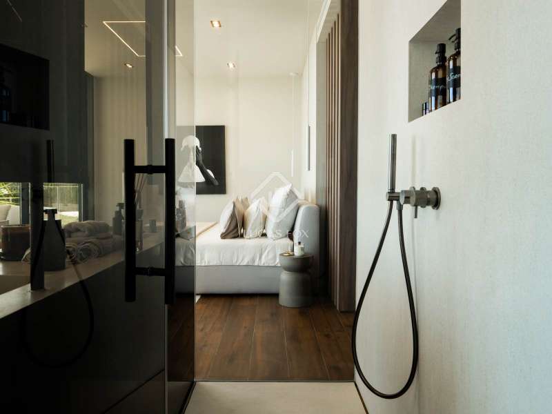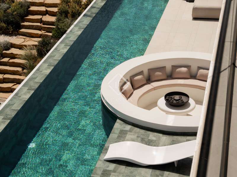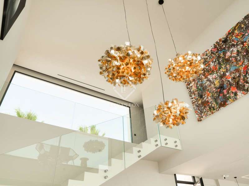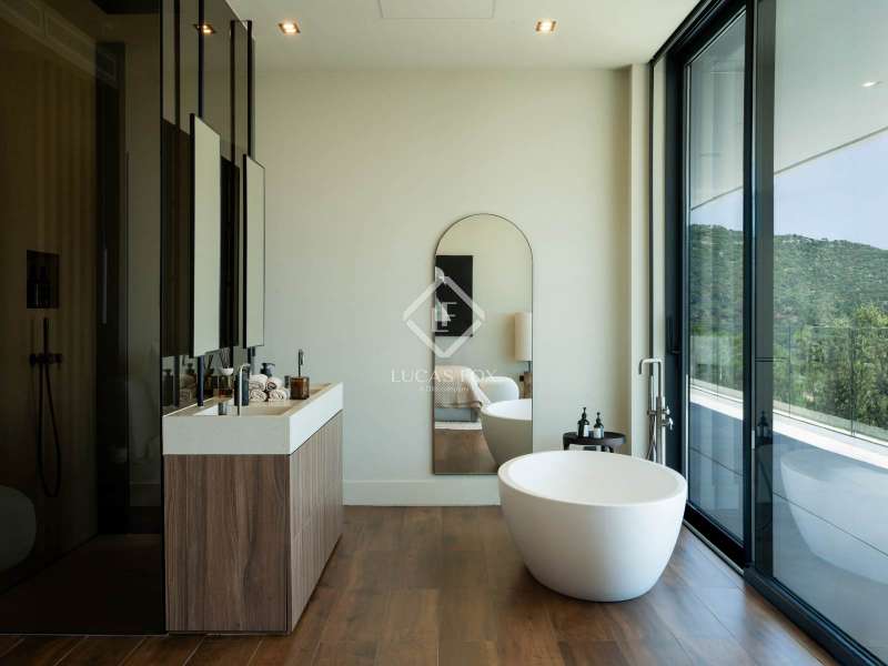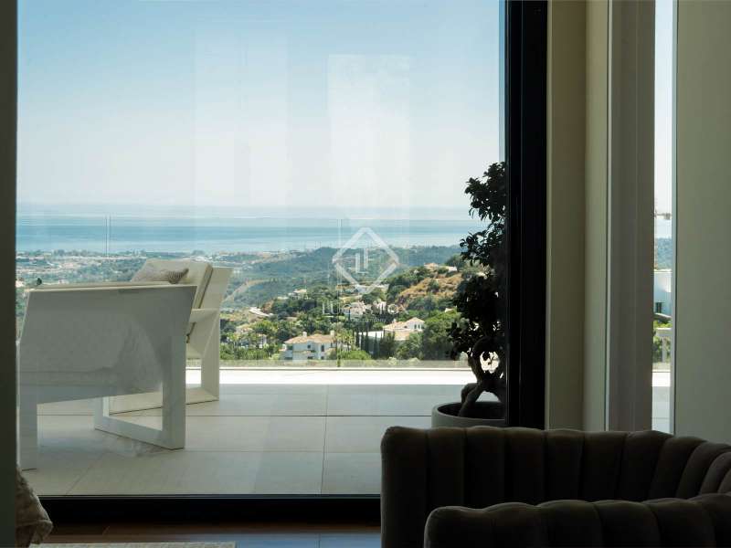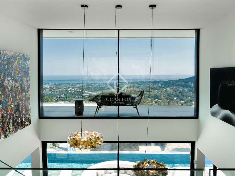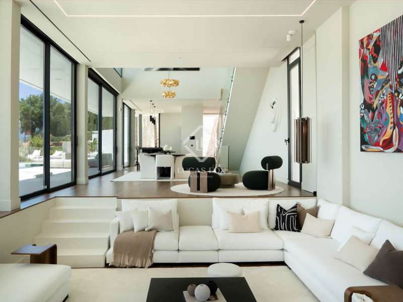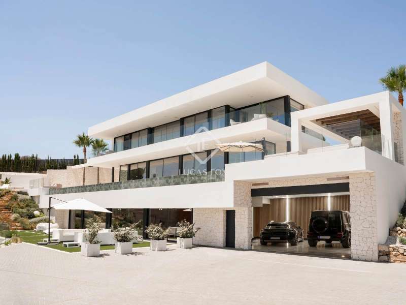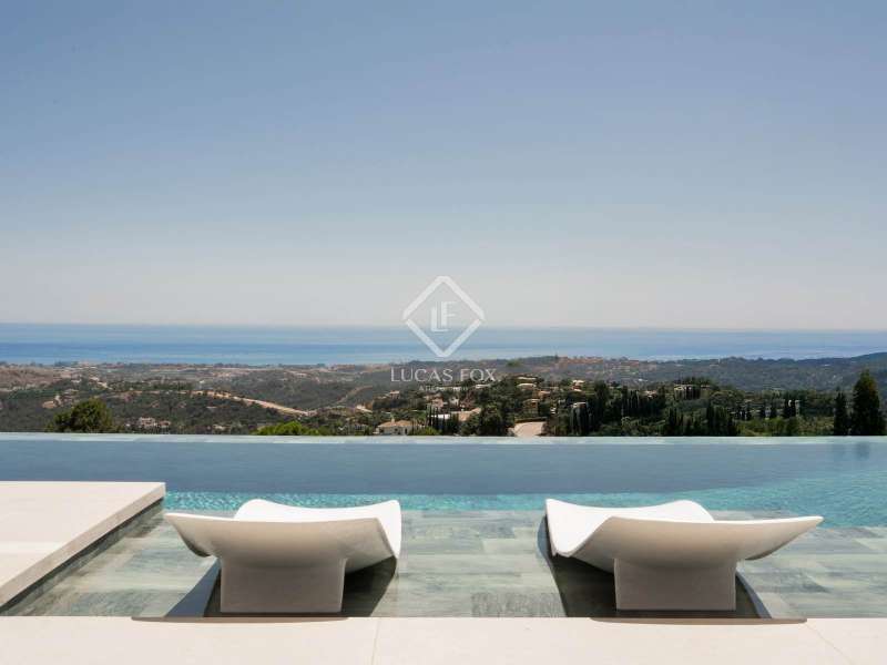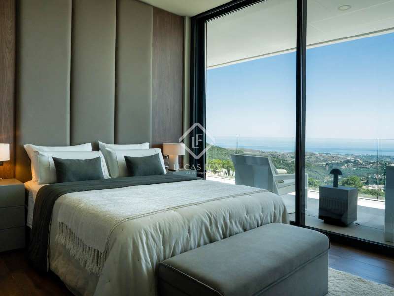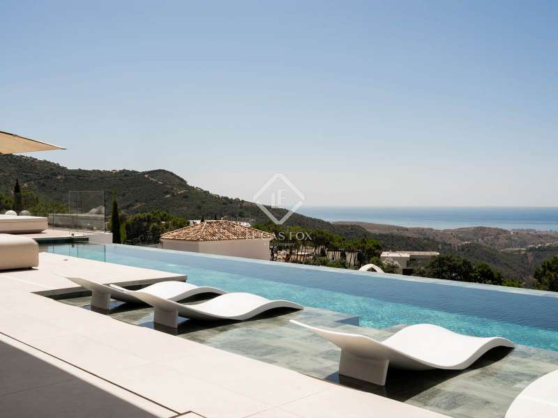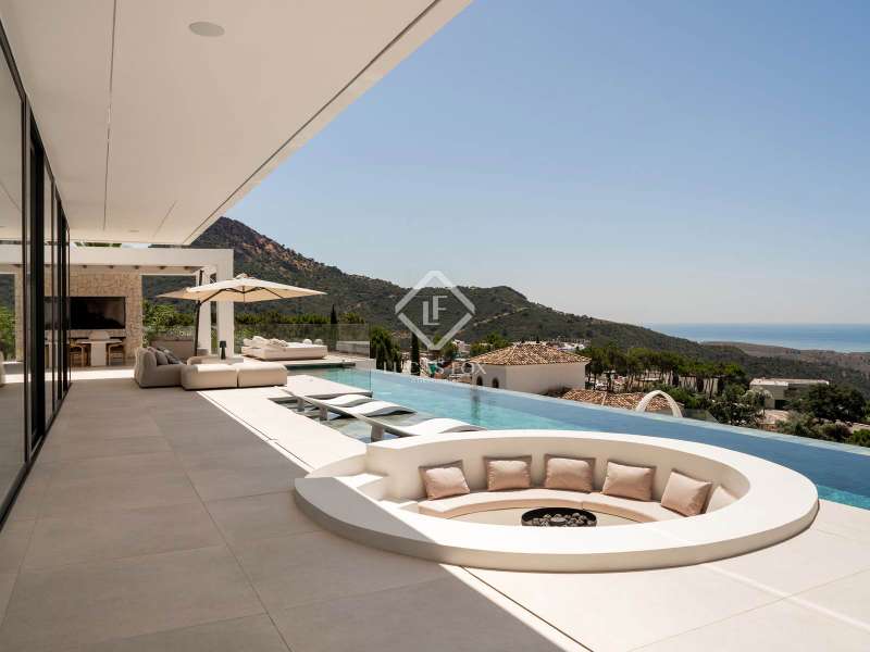 This modern residence is positioned within a tranquil and secure gated area in the hills of Benahavís, where privacy and natural surroundings create an exceptional living environment. Built on a generous plot of over 2,000 m² and encompassing more than 870 m² of interior space, the home is designed to capture open sea views and the dramatic mountain backdrop through expansive floor-to-ceiling windows and carefully planned architectural lines. The interior layout follows a refined open-plan concept, highlighted by a sunken living area and an impressive double-height dining space that enhances the sense of volume and natural light. Four spacious bedrooms and a generous number of bathrooms are distributed to provide comfort and discretion. High-quality materials, smart-home systems, individual climate control, and a private elevator contribute to a seamless living experience across all floors. One of the most distinctive elements of the property is its lower level, which enjoys rare sea views and functions as a complete private retreat. This area includes a 24-meter heated indoor pool, sauna, plunge pool, gym, bar, second living space, laundry area, and a cinema designed for sixteen guests. It offers an ideal combination of wellness, entertainment, and relaxation. Outdoor areas are equally thoughtfully conceived, featuring a 24-meter infinity-edge pool, outdoor kitchen, lounge areas, landscaped gardens, and multiple terraces designed to enjoy the surrounding scenery. Practical features such as a private driveway, ample guest parking, and a three-car garage ensure convenience alongside elegance. Additional elements—including 24-hour security, alarm system, solar energy solutions, underfloor heating in selected areas, and full home automation—provide comfort and peace of mind throughout the year.