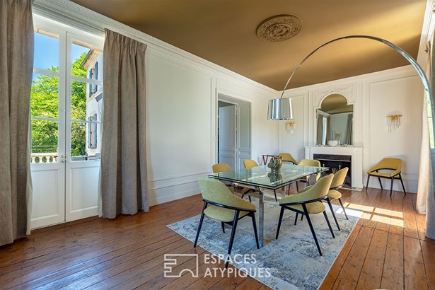 Let's start with this spacious mansion combining elegance and comfort. Once the stone steps are crossed, we arrive on a first terrace which leads to 2 large reception rooms. The charm works immediately, old parquet flooring, high ceilings, through light and dominant view of the park.