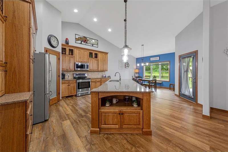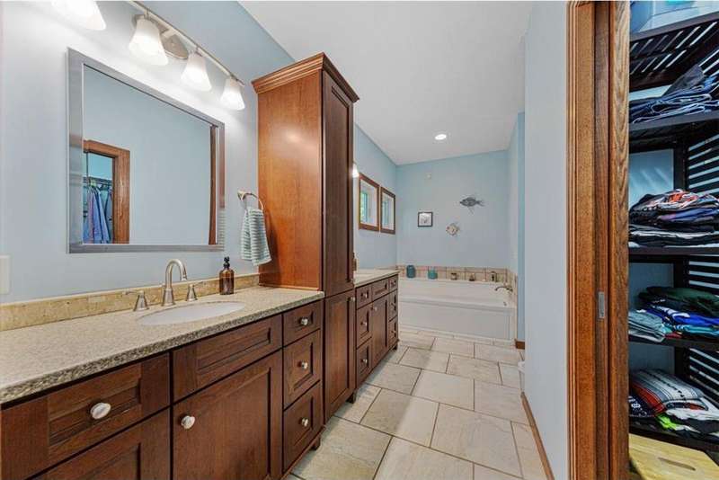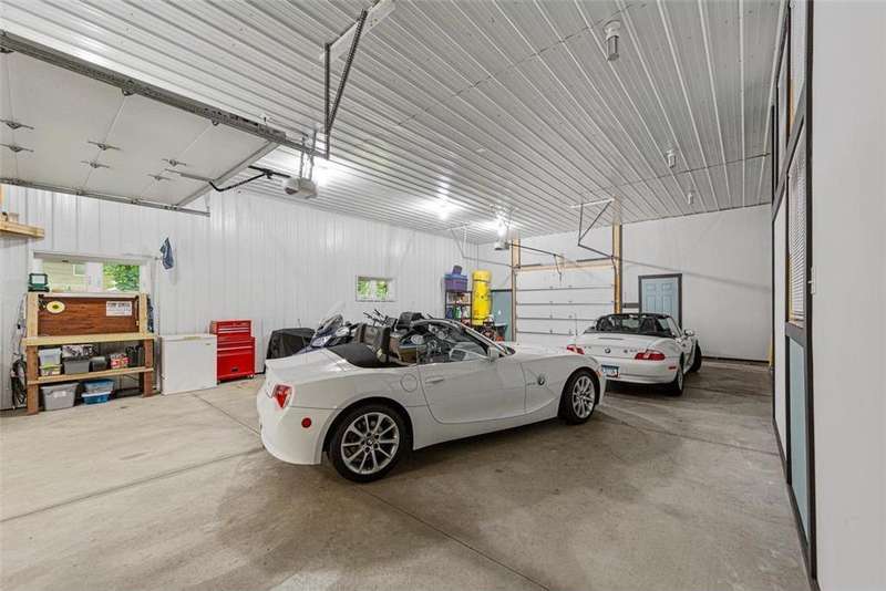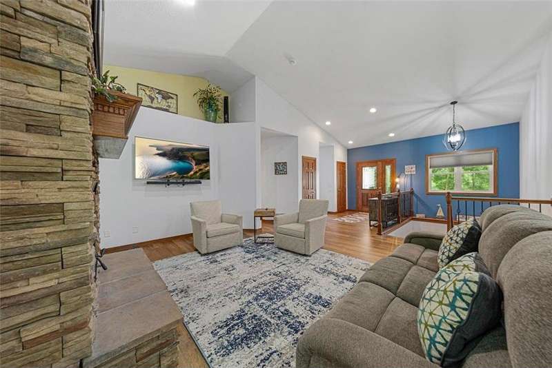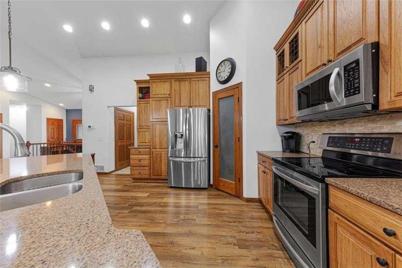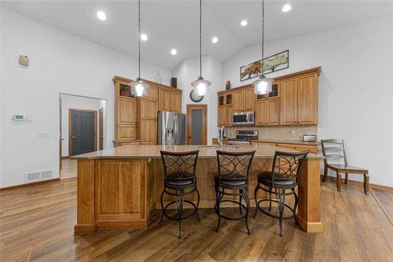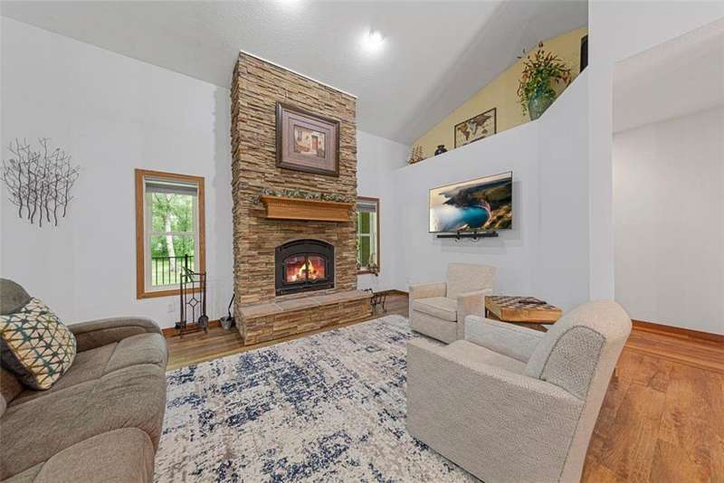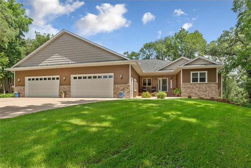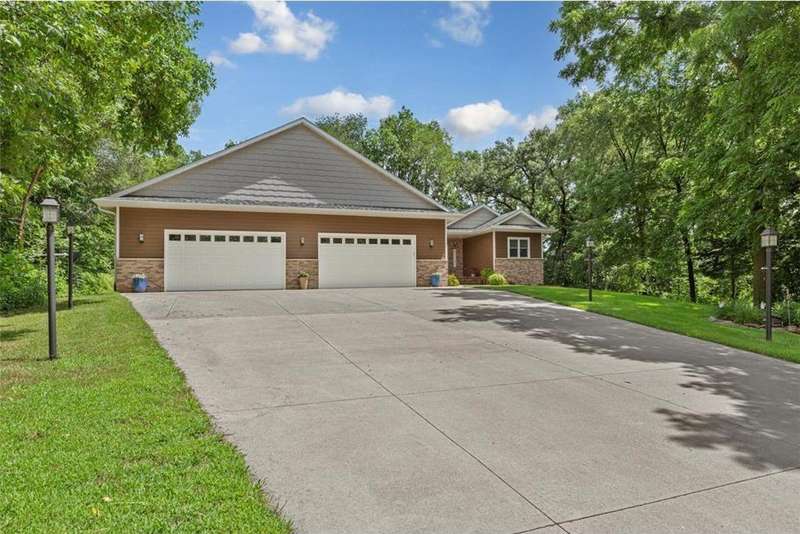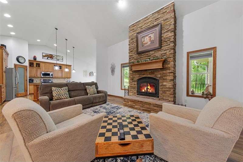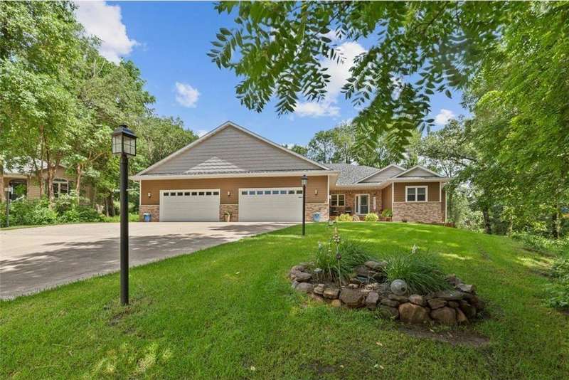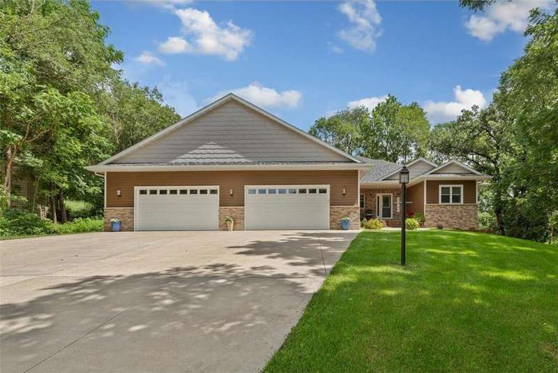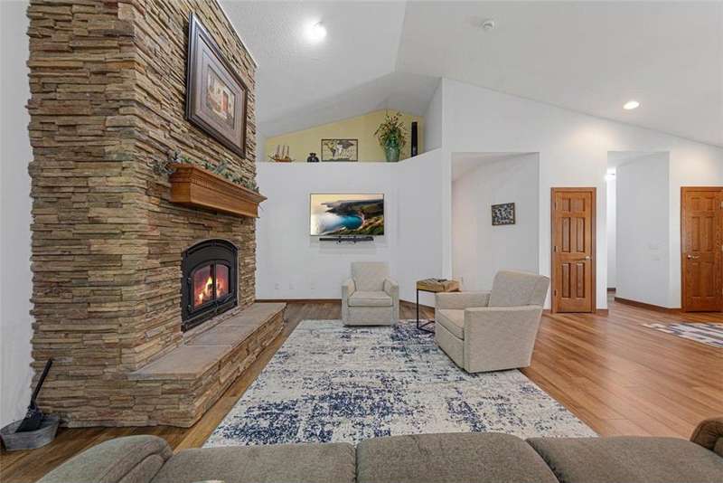 Exceptional In-Town Retreat on a Wooded Acre Lot! Tucked away on a beautifully wooded lot just over an acre—this stunning 4-bedroom plus office, 4-bath home offers the perfect balance of privacy, space, and convenience. Step into the heart of the home: a chef-inspired kitchen with a generous center island, perfect for gatherings, and a striking stone fireplace that warms the open, inviting living area. The main-floor primary suite is a true retreat, featuring a spa-like bath with dual vanities, a whirlpool tub, and a separate shower. Main-floor laundry adds ease to everyday living, while the finished lower level delivers even more: 2 zone in-floor heat, a second laundry area, a spacious family room, a stubbed-in wet bar, and direct walk-out access to the garage. For car enthusiasts or hobbyists, the attached 8+ car garage is a dream—offering over 2,400 sq ft of heated space, in-floor heat, a floor drain, ample storage, and four overhead doors. Thoughtfully designed and meticulously maintained, this rare in-town property has it all—privacy, functionality, and incredible space both inside and out.