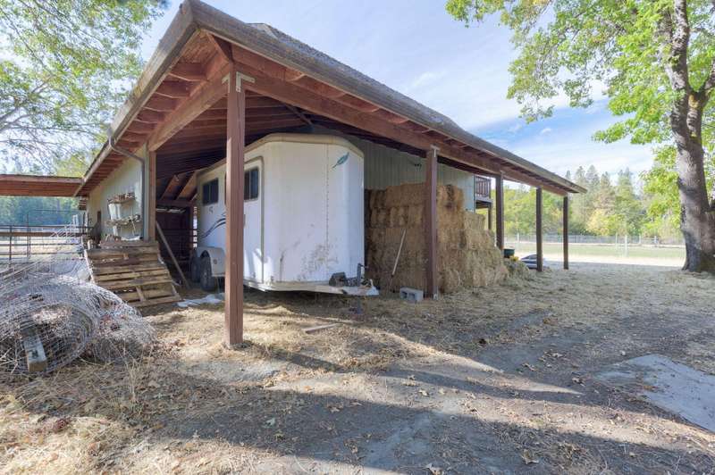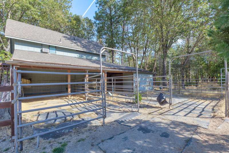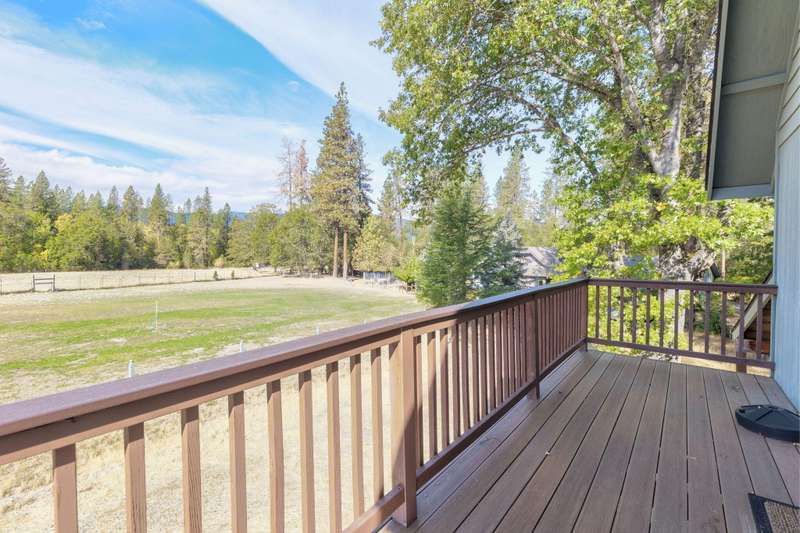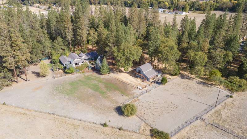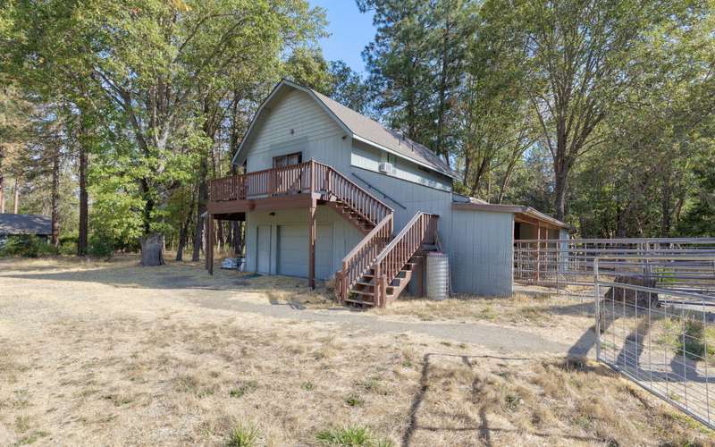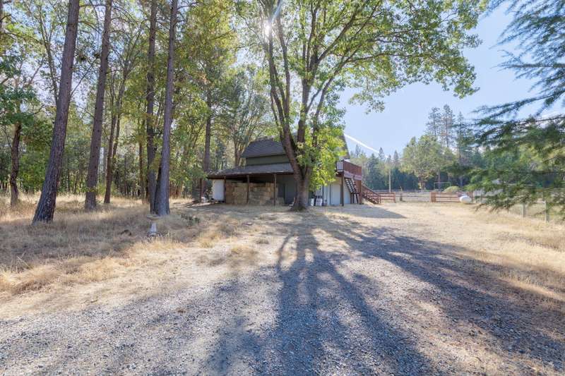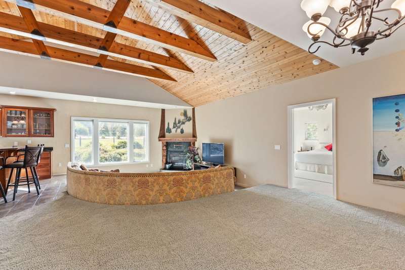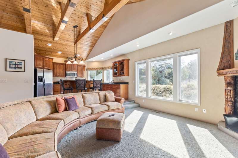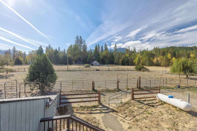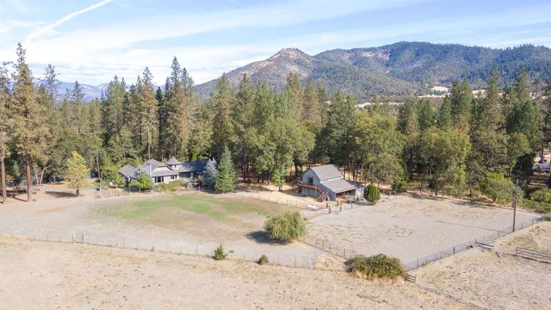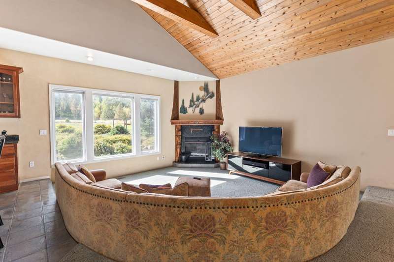 Welcome Home! Custom upgrades throughout feel more like a rural retreat with it's cozy home and horses facilities situated on 5 usable acres. The large living room windows provide incredible views of the mountains as well as the horse pastures. Architect enthusiasts will marvel at the robust exposed beams running across the vaulted ceilings, the sunken living room and expertly hand carved fireplace framing. Step outside onto the patio, where you can enjoy the serene surroundings from within your hot tub. Perfect for guests or extended family with studio/guest quarters above barn offering breathtaking views from the deck. Also features a whole house auto-transfer generator. This property is a true equestrian's dream, offering well-maintained horse arenas and grazing areas with stalls and tack room. Whether you're looking to enjoy the beauty of rural living or seeking a property with ample space for your horses and hobbies, this home offers it all.