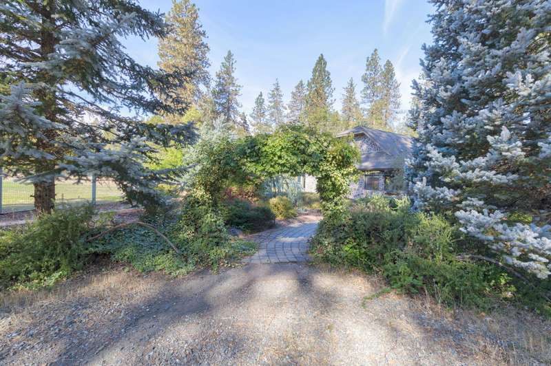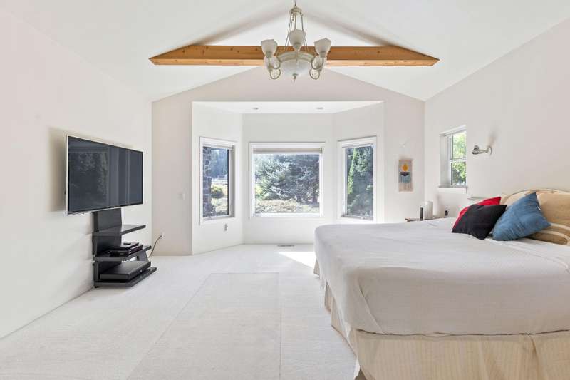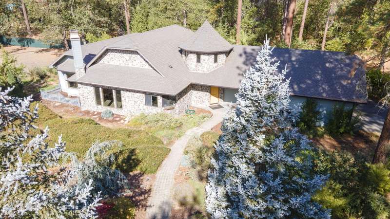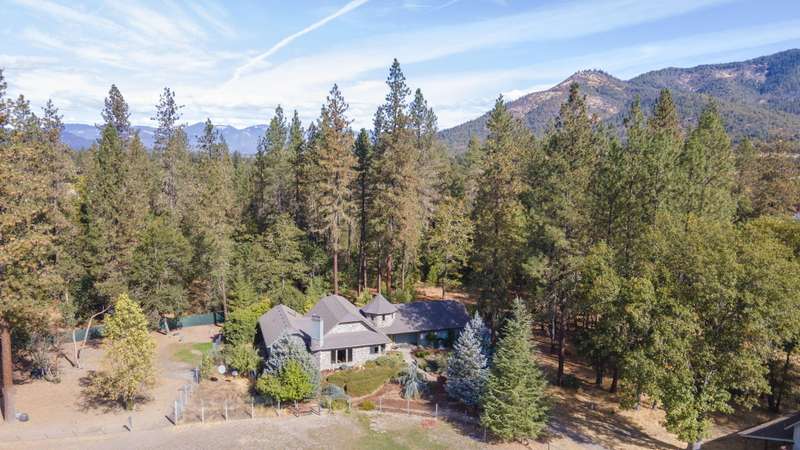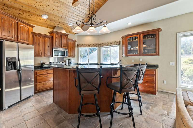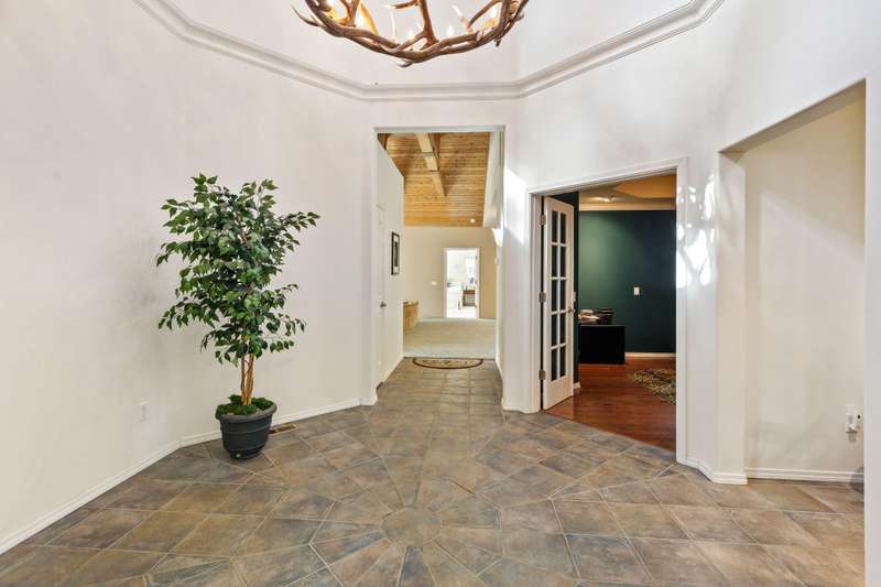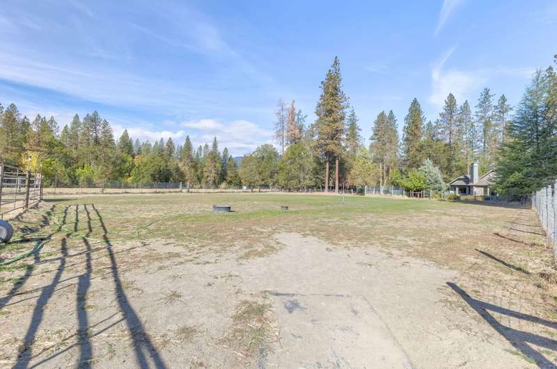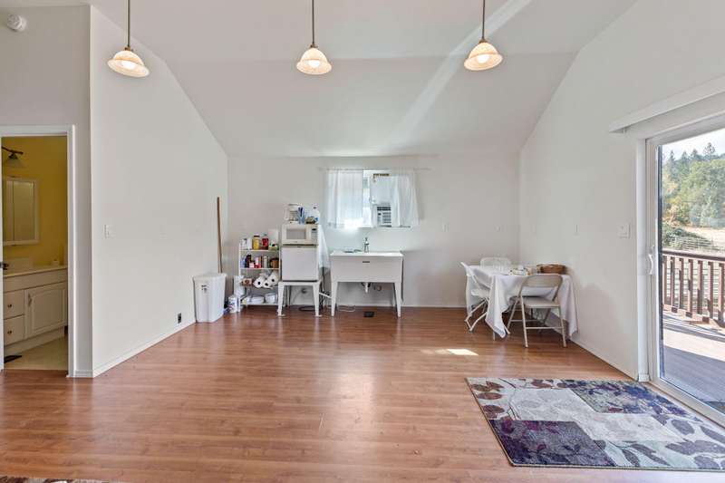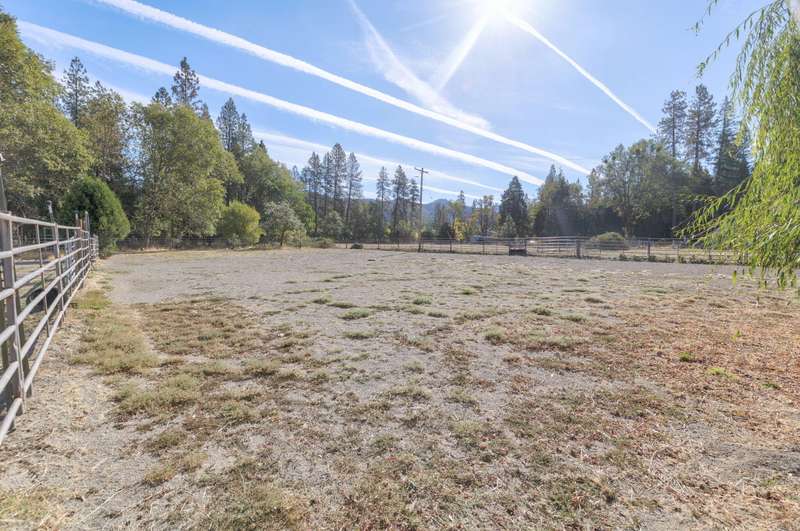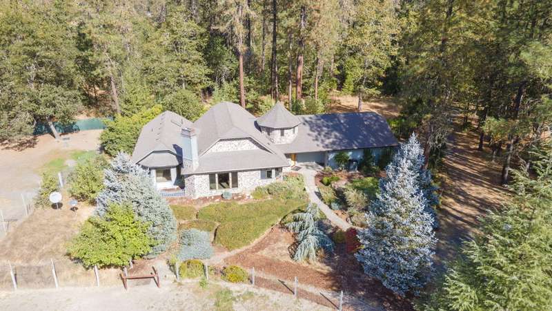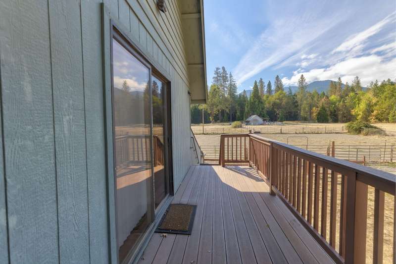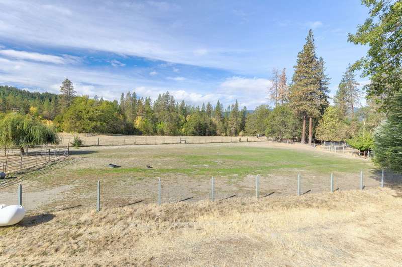 Welcome Home! Custom upgrades throughout feel more like a rural retreat with it's cozy home and horses facilities situated on 5 usable acres. The large living room windows provide incredible views of the mountains as well as the horse pastures. Architect enthusiasts will marvel at the robust exposed beams running across the vaulted ceilings, the sunken living room and expertly hand carved fireplace framing. Step outside onto the patio, where you can enjoy the serene surroundings from within your hot tub. Perfect for guests or extended family with studio/guest quarters above barn offering breathtaking views from the deck. Also features a whole house auto-transfer generator. This property is a true equestrian's dream, offering well-maintained horse arenas and grazing areas with stalls and tack room. Whether you're looking to enjoy the beauty of rural living or seeking a property with ample space for your horses and hobbies, this home offers it all.