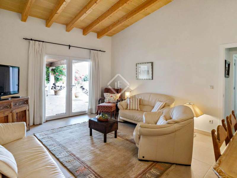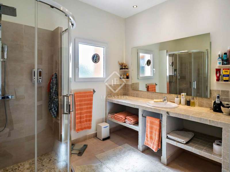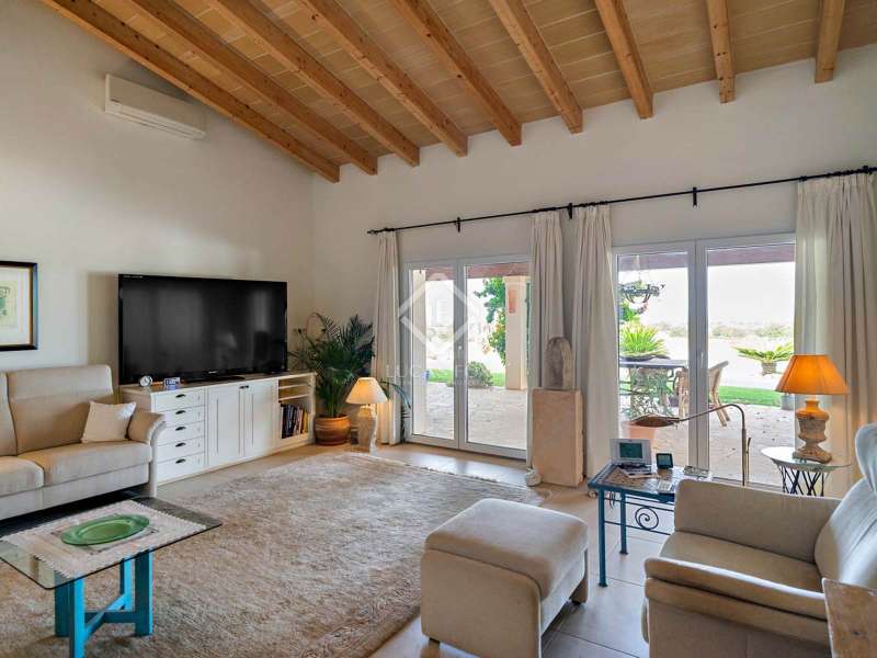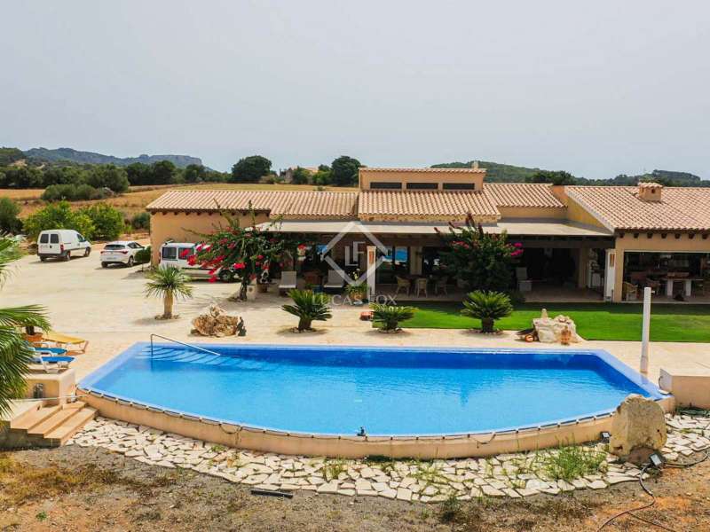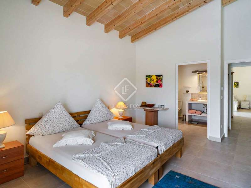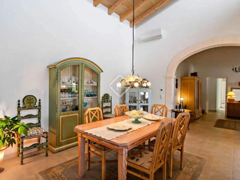 The property boasts a generous 23,268 m² plot with a spacious 354 m² home, including a 51 m² summer kitchen designed for year-round use. Built on a single level, the house is ideal for all ages and accessible to those with limited mobility. It features four large bedrooms, each with an en-suite bathroom. Two of the bedrooms have separate entrances and an additional living room, providing extra privacy for guests. The main suite includes a spacious dressing room, en-suite bathroom, and picturesque views of Sant Salvador from the bed. Additional highlights include a large two-car garage and a maintenance room. The home is equipped with underfloor heating, air conditioning, and triple-glazed windows for optimal comfort and energy efficiency. Solar panels and a private well ensure complete self-sufficiency. Outside, we find several covered terraces for shaded relaxation, an infinity pool with sweeping views of the Tramuntana mountains, and a traditional wood-burning oven for homemade pizzas. The beautifully landscaped Mediterranean garden, filled with palm trees and native plants, creates a serene oasis. This property seamlessly combines tradition, elegance, comfort, and panoramic views, making it an exceptional opportunity not to be missed. Please contact us for further information about this stunning property for sale in Son Prohens, offering luxury living with breathtaking views of the distant Tramuntana mountains.