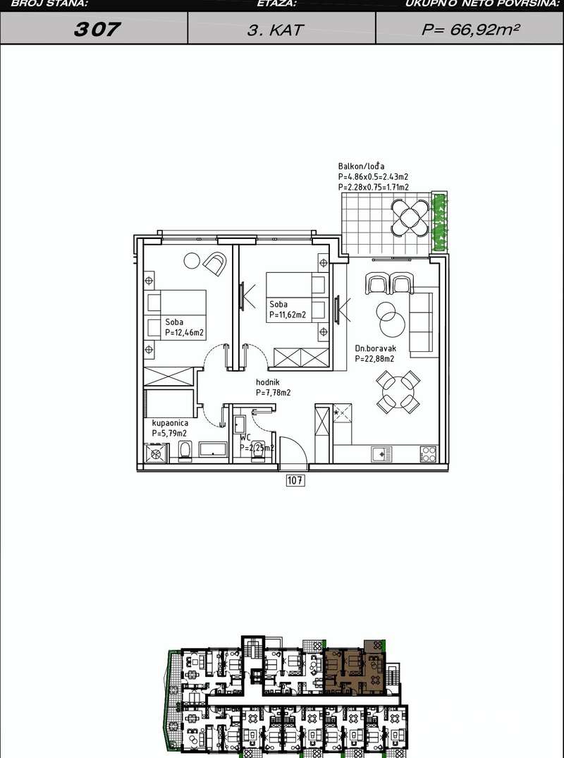 Apartment Z2-S307 - 3th floor - living area 62.11 m2 (2 bedrooms + bathroom + toilet) + balcony/loggia (7.40 m2), all net calculation area 66,92 m2 = 254,296 EUR