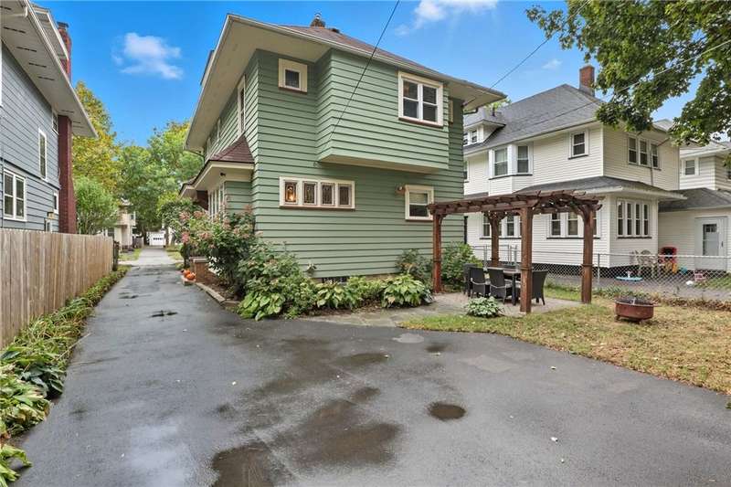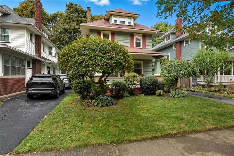 Step back in time and experience the unmatched charm of this 1925-built home, where stunning original details have been preserved and enhanced for modern living. Leaded glass windows, pocket doors, rich gumwood trim, gleaming hardwood floors, soaring 9-foot ceilings, elegant crown molding, and period lighting highlight the home's craftsmanship.The spacious living room is flooded with natural light, featuring a fireplace flanked by built-ins and direct access to the front porch. The formal dining room boasts gumwood wainscoting and built-in storage benches, while the large kitchen offers abundant cabinetry, generous counter space, and a natural stone peninsula ? ideal for gatherings or casual daily meals. Upstairs, you'll find three sizable bedrooms and a full bath. The primary bedroom includes a bright morning/dressing area and built-in storage, while another bedroom features a charming sleeping porch. Additional highlights include a full walk-up attic and a bright, clean basement offering plenty of potential.Thoughtful updates blend seamlessly with the home's character, including an added first-floor half bath, updated exterior doors, and a comprehensive window upgrade ? vinyl replacements and storm windows preserving the original wood frames and ornate leaded glass.Recent exterior paint accentuates the home's period craftsmanship, while the rebuilt front porch with detailed woodwork provides a perfect place to unwind or greet neighbors. Outside, enjoy a new driveway, a paver patio beneath a pergola and a beautifully landscaped, fully fenced yard that's easy to maintain.A rare find, the property also offers a three-car garage with concrete floor and automatic door openers. Nestled in Rochester's desirable Homestead Heights neighborhood, this home combines walkability and convenience ? close to parks, dining, arts, and entertainment ? while maintaining peaceful residential charm.This home is in remarkable condition, brimming with character, and ready to be treasured by its next owner!Delayed negotiations: The Sellers will review YOUR offer Monday, 10/20, after 3:00 PM.OPEN HOUSE: Sunday, 10/19, from 11:00 AM to 1:00 PM.
