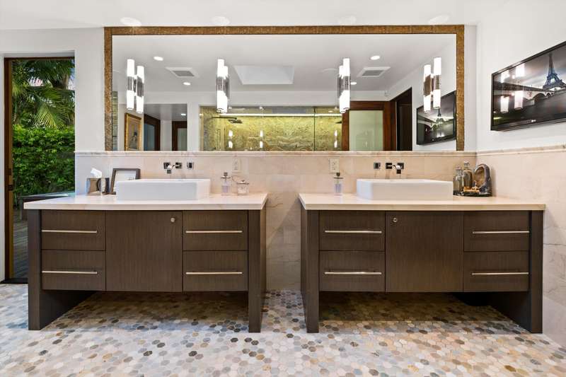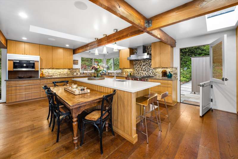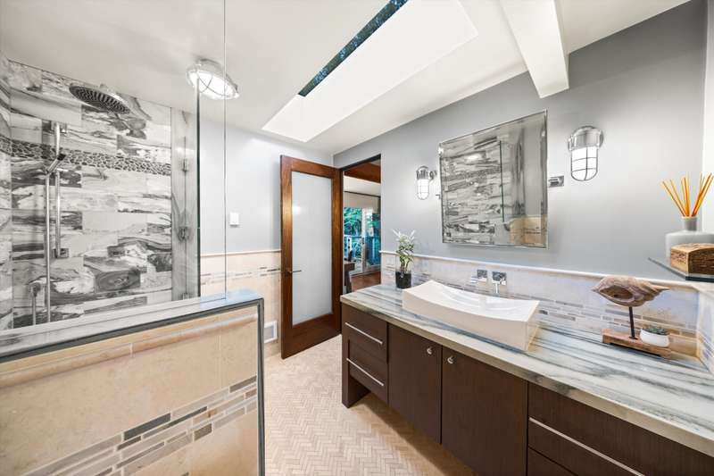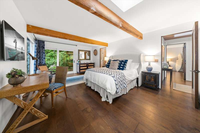 The spa-inspired primary suite features radiant heated floors, steam shower, ceiling-fill soaking tub, and private garden with hot tub and outdoor shower. Two additional en-suite bedrooms and two offices offer flexibility and comfort.