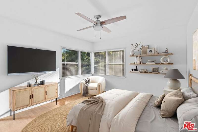 Welcome to this charming and light-filled 2BD+2BA home located in the Cathay Circle neighborhood. The spacious living room features a large bay window that fills the space with natural light, recess lighting & fireplace. Kitchen is equipped with stainless steel appliances and a convenient side-by-side washer and dryer. A separate dining area sits just off the living room and kitchen which can also be used as a den or home office. Both bedrooms include en-suite bathrooms for added comfort and privacy. Enjoy outdoor living in the yard with fruit trees and a trellis-covered patio perfect for entertaining or relaxing. Other features include hardwood floors throughout, central AC/heat, and tandem parking in a detached shared garage. Located in a family-friendly neighborhood, this home is close to parks, restaurants, and the well-known La Cienega Tennis Center. Plus, Stella's Coffee Haus and STUDEO Gym are just steps away! Two separate residences on one lot, each with its own address and private entry, connected only by the shared garage.
