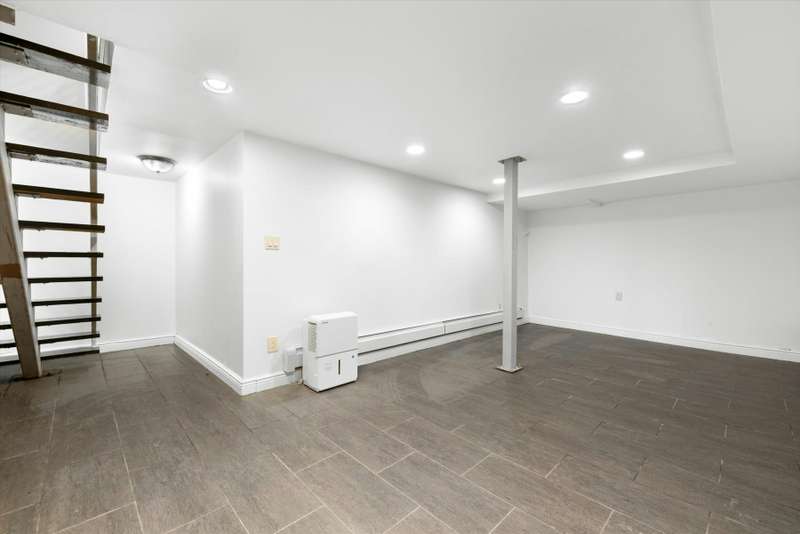 Downstairs is a large, flexible recreation room. The unit also features hardwood floors, natural light, and an exposed brick wall. Outside, there is a shared courtyard.
