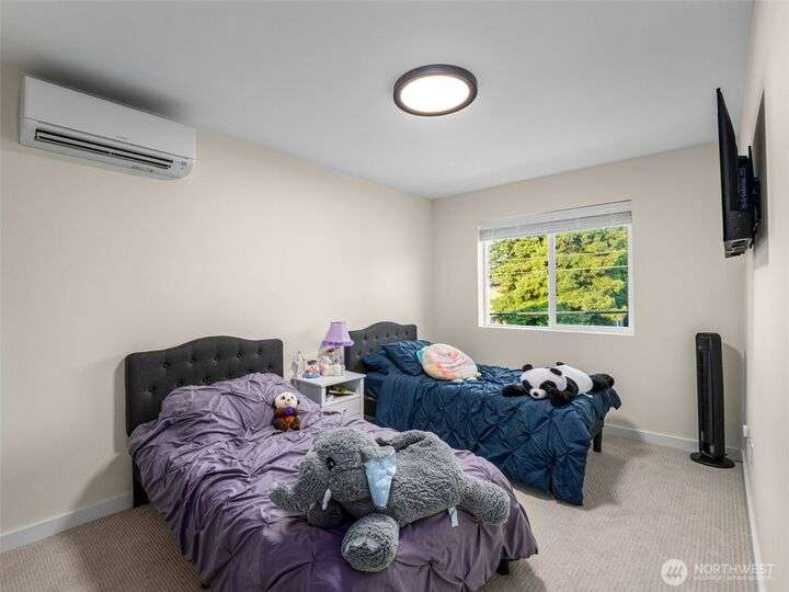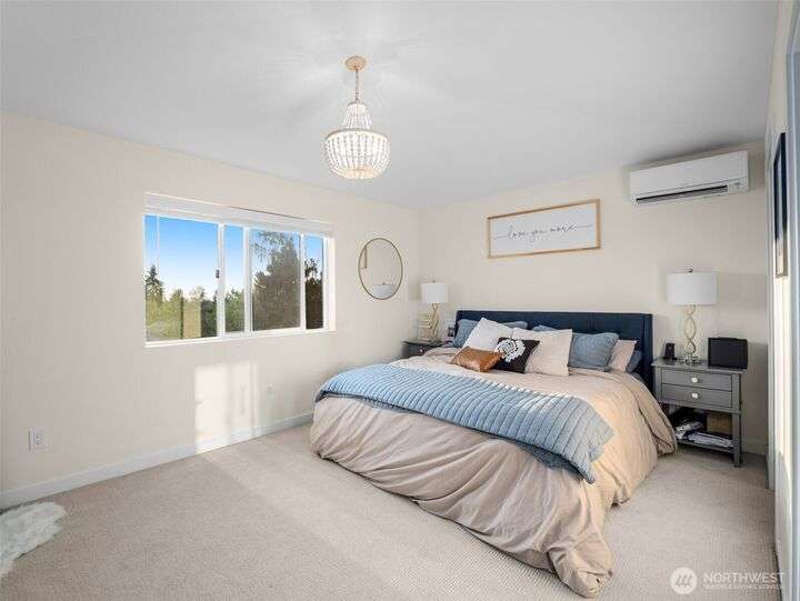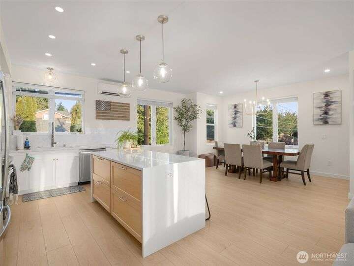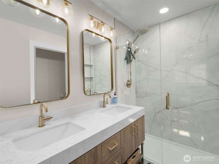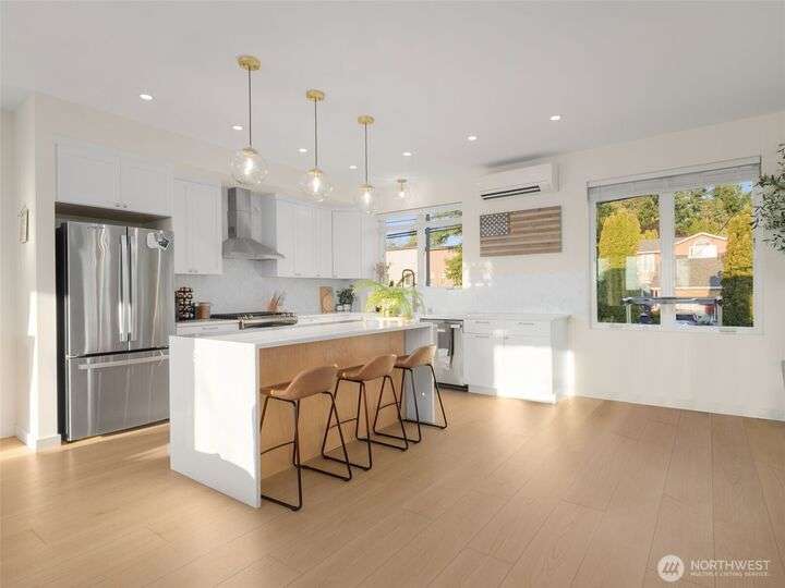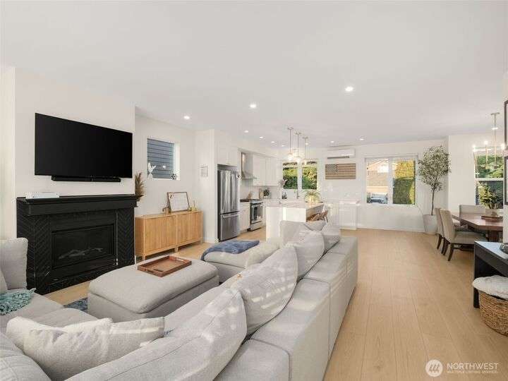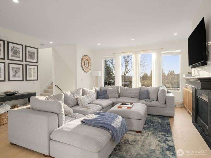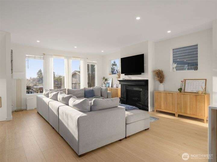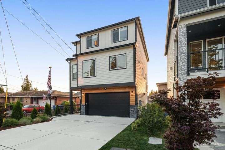 This stunning former model home offers clean, modern luxury with custom finishes throughout. Step through the front door to a versatile main-level primary suite w/walk-in closet & ensuite bath, perfect for multi-generational living or home office. The second level feels open, bright and inviting with sleek custom cabinetry, a striking waterfall island, dedicated dining space, large living room w/gas fireplace and windows that allow for tons of natural light. Upstairs, you'll find generously sized bedrooms, including a primary suite w/ensuite bath. Other features include a two car garage, driveway parking, gated front entry and easy access to both 405 and I-5! Don't miss out on this gorgeous like-new home that blends efficiency with style!