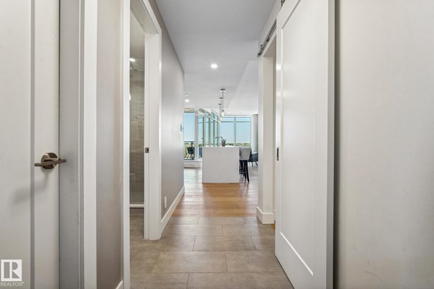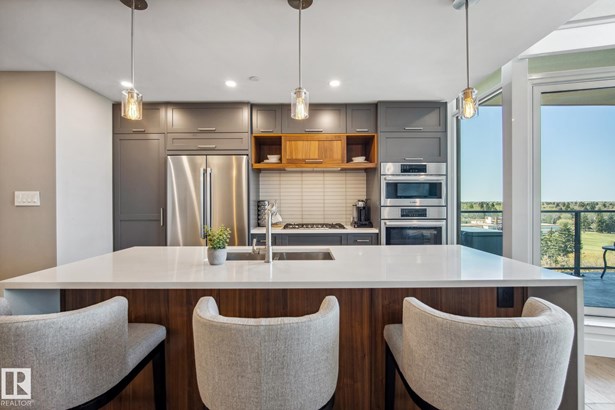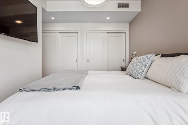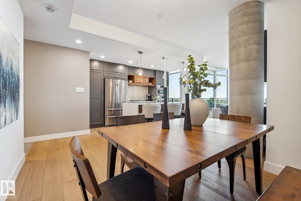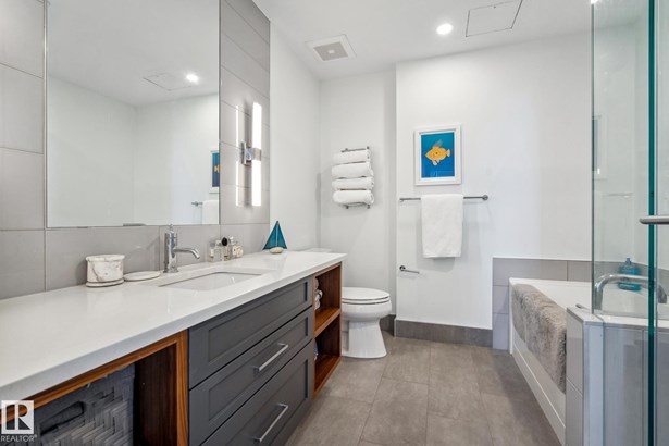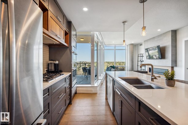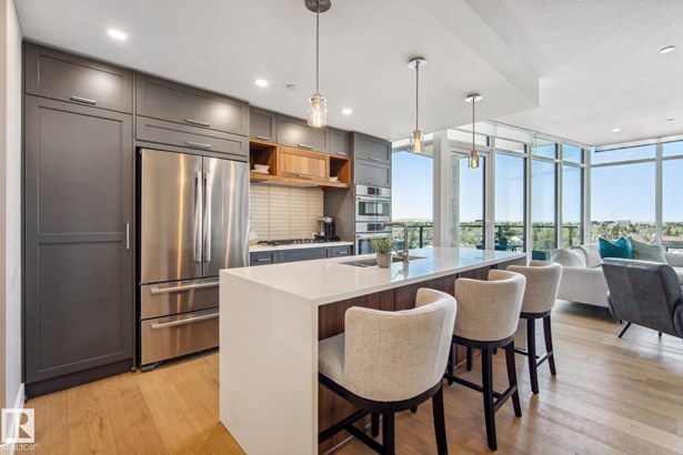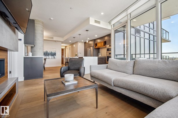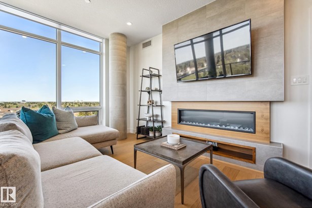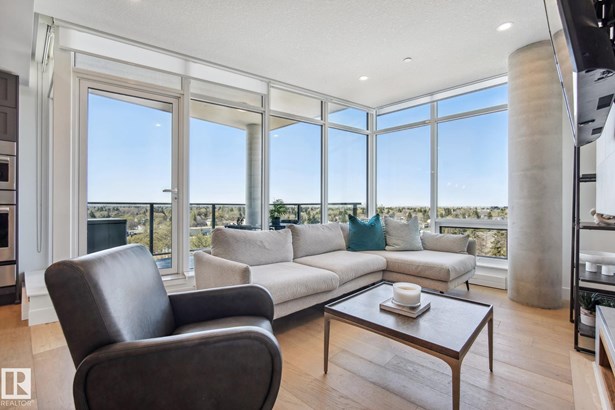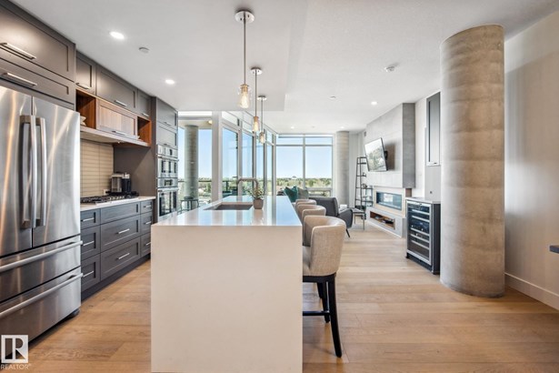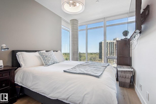 Luxury Condo Living in The West Block Glenora – minutes to downtown Edmonton. 7th-floor, CORNER UNIT with 2 bedrooms and 2 bathrooms. Luxuriously finished, with wide plank hardwood and floor-to-ceiling windows - offering breathtaking city skyline views from West balcony. A Chef's kitchen with quartz countertops, gas stove & wine bar. The master bedroom features an ensuite with a jet tub. The second bedroom with a removable hide-a-bed and wardrobe. Bathroom in-floor heating, air conditioning, full-size washer & dryer, one titled U/G parking stall (P2, Lab R100, Leg 147) and storage cage (M, Leg 198) . First-class amenities, concierge service, rooftop lounge, indoor games room, guest suite, state-of-the-art fitness centre, car wash, dog wash station, and a rooftop dog run. An urban village with trendy restaurants all steps away from our beautiful river valley & LRT. Perfect for small families, busy professionals, or retirees to live in one of Edmonton’s most desirable and mature communities.
