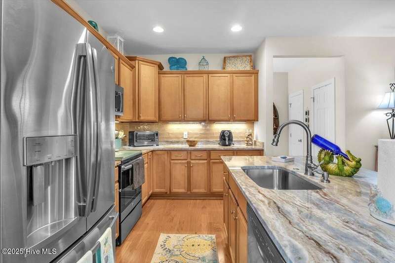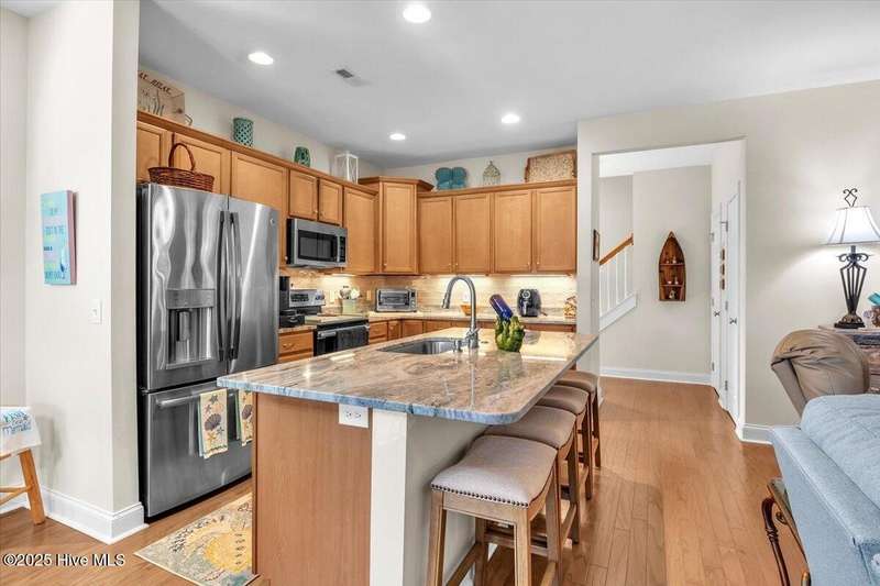 Experience coastal living in this meticulously maintained residence in the desirable community of Cambridge Crossings situated between Oak Island and Southport. It featuring hardwood floors, a vaulted ceiling in the living room and a gas fireplace. The master bedroom is on the main level with walk-in closet and shower. Upstairs is a large bedroom with a full bathroom for your guests. A large spacious kitchen with recently installed marble counters. Relax with your morning coffee on the screened-in patio. This wonderful community includes all maintenance and low HOA fees. Nearby activities include Bill Smith Park, a dog park, Dutchman Creek boat ramp, South Harbor Village Marina, waterfront dining experiences, par three golf course, community pool, tennis/pickle courts, and a short drive to the Oak Island beaches and historical Southport.