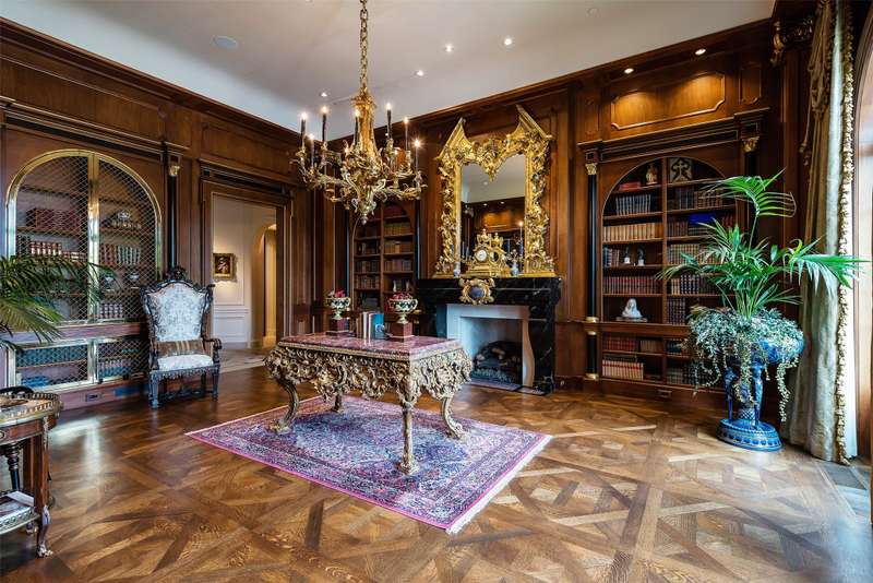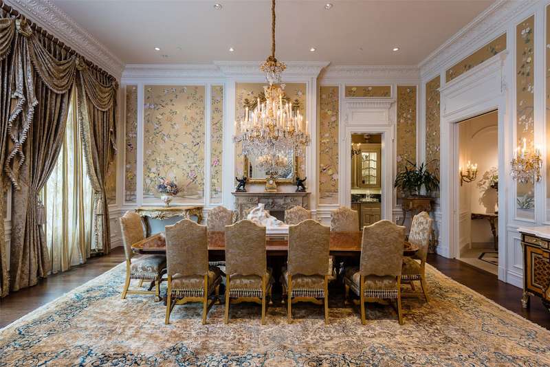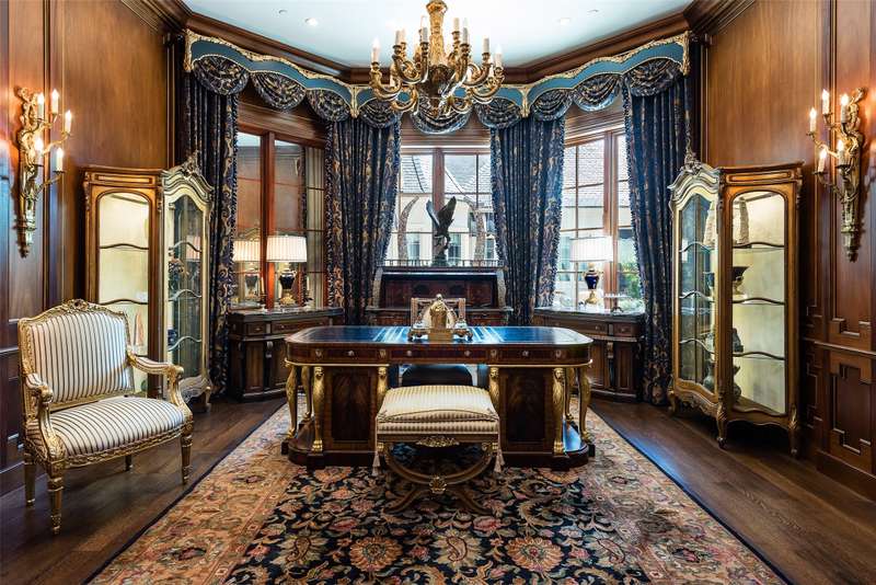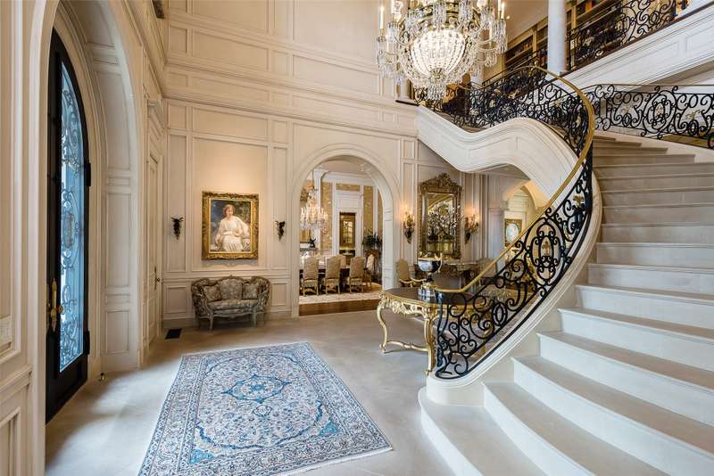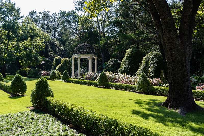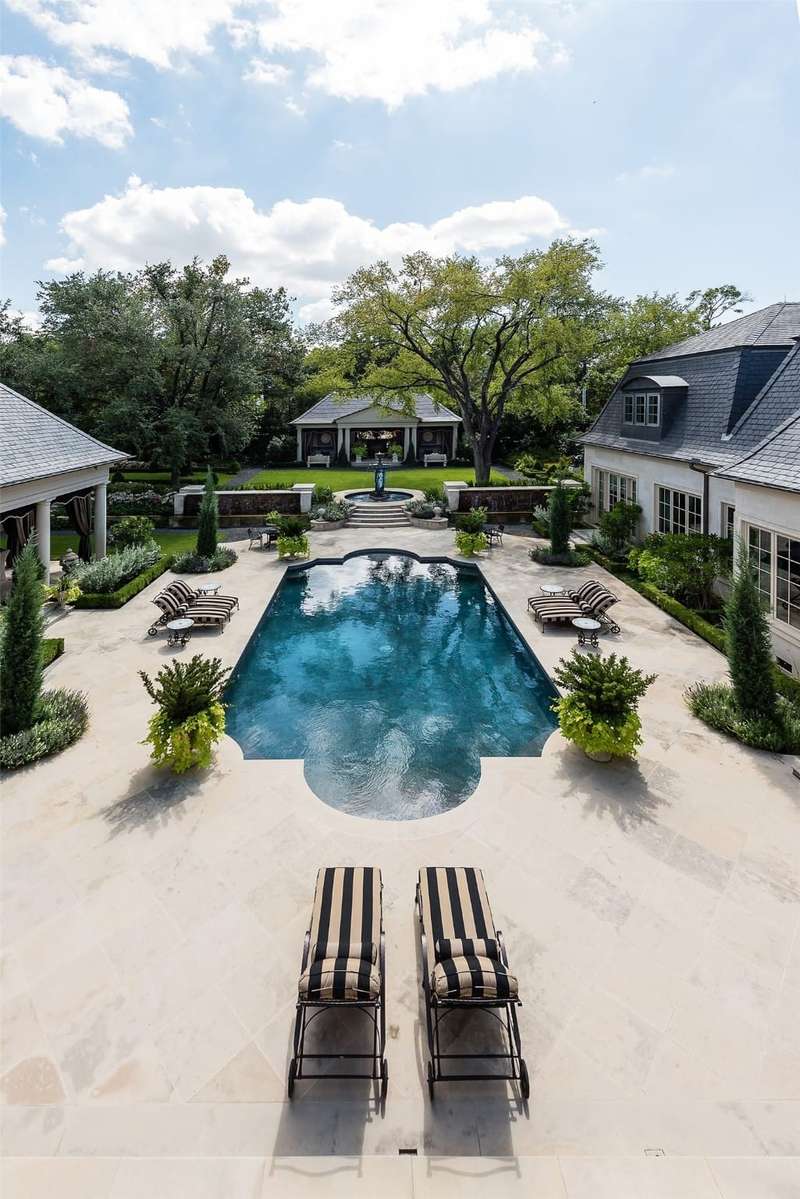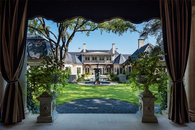 Tucked behind iron gates, this remarkable estate sits on over 2 acres in the heart of Old Preston Hollow. The custom 6-bedroom, 7.3-bath residence, completed in 2014, blends luxurious materials, textiles, and finishes. Spanning nearly 20,000 square feet, the French Renaissance-inspired home offers complete privacy and tranquility. A two-story domed entry features a stunning floating staircase, with marble floors in the Grand Foyer and rich mahogany moldings in the Library, Formal Study, and Media Room creating a dramatic atmosphere. The Grand Dining Room, adorned with de Gournay silk and embroidered wallpaper, offers unparalleled elegance. The gourmet kitchen includes an 8-burner Wolf range, 4 Wolf ovens, induction stovetop, and a center island, complemented by custom cabinetry. An open layout leads to a keeping room, junior dining room, and family room, which opens to a covered outdoor terrace. At the heart of the home, the Grand Hall boasts ornate plaster ceilings, two black marble fireplaces, and stunning marble medallions. The Media Room is a sports enthusiasts dream, with 5 televisions, a 120 drop-down screen, and a full wet bar. The main level Master Suite includes a private sitting room and opens to a terrace with a fireplace, pool, waterfall, and cabana. His-and-hers master baths feature marble floors, separate dressing areas, including a second story additional master showroom couture closet, and a large double shower. Upstairs, 5 additional bedrooms with luxurious baths include suites with private balconies overlooking the pool and gardens. Other highlights include a Billiards Room, Game Room, Physiotherapy Room with Steam Room, and Home Gym, all accessible by elevator. For car enthusiasts, the estate offers 3 garages with 4 car lifts, providing space for 10 luxury vehicles. The grounds feature a saltwater pool, cabana, walking paths and gardens, creating a serene resort-like atmosphere.
