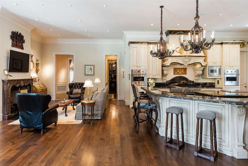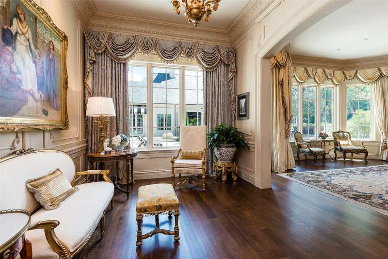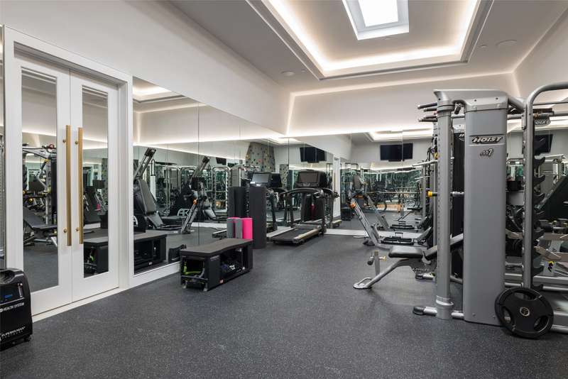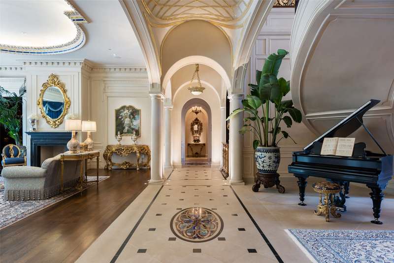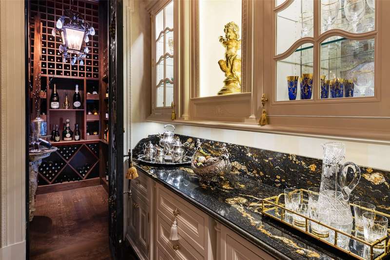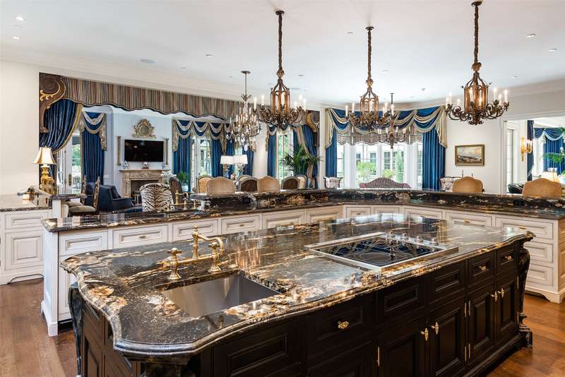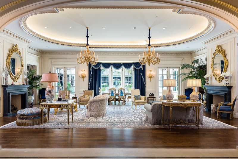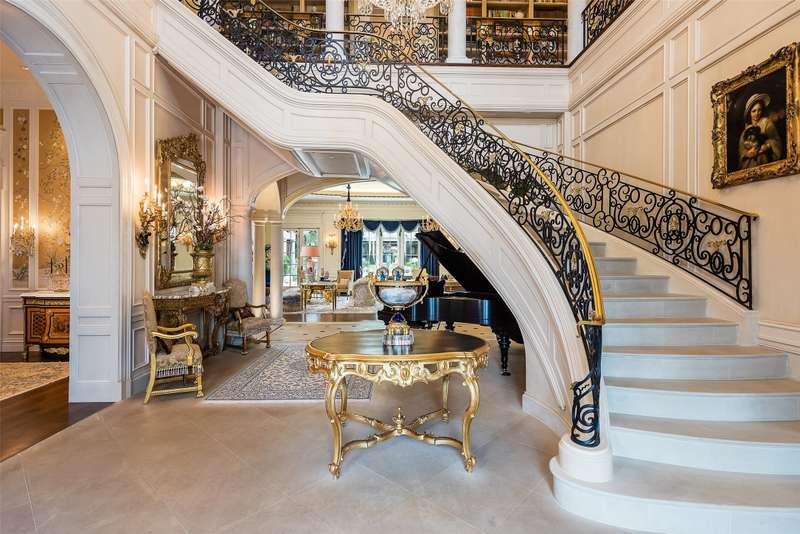 Tucked behind iron gates, this remarkable estate sits on over 2 acres in the heart of Old Preston Hollow. The custom 6-bedroom, 7.3-bath residence, completed in 2014, blends luxurious materials, textiles, and finishes. Spanning nearly 20,000 square feet, the French Renaissance-inspired home offers complete privacy and tranquility. A two-story domed entry features a stunning floating staircase, with marble floors in the Grand Foyer and rich mahogany moldings in the Library, Formal Study, and Media Room creating a dramatic atmosphere. The Grand Dining Room, adorned with de Gournay silk and embroidered wallpaper, offers unparalleled elegance. The gourmet kitchen includes an 8-burner Wolf range, 4 Wolf ovens, induction stovetop, and a center island, complemented by custom cabinetry. An open layout leads to a keeping room, junior dining room, and family room, which opens to a covered outdoor terrace. At the heart of the home, the Grand Hall boasts ornate plaster ceilings, two black marble fireplaces, and stunning marble medallions. The Media Room is a sports enthusiasts dream, with 5 televisions, a 120 drop-down screen, and a full wet bar. The main level Master Suite includes a private sitting room and opens to a terrace with a fireplace, pool, waterfall, and cabana. His-and-hers master baths feature marble floors, separate dressing areas, including a second story additional master showroom couture closet, and a large double shower. Upstairs, 5 additional bedrooms with luxurious baths include suites with private balconies overlooking the pool and gardens. Other highlights include a Billiards Room, Game Room, Physiotherapy Room with Steam Room, and Home Gym, all accessible by elevator. For car enthusiasts, the estate offers 3 garages with 4 car lifts, providing space for 10 luxury vehicles. The grounds feature a saltwater pool, cabana, walking paths and gardens, creating a serene resort-like atmosphere.