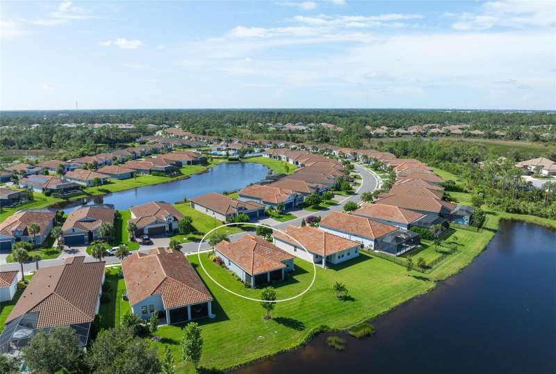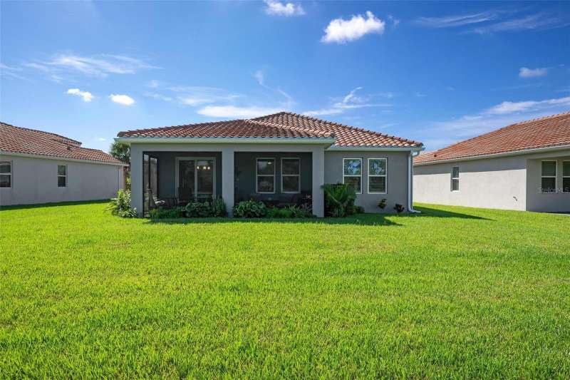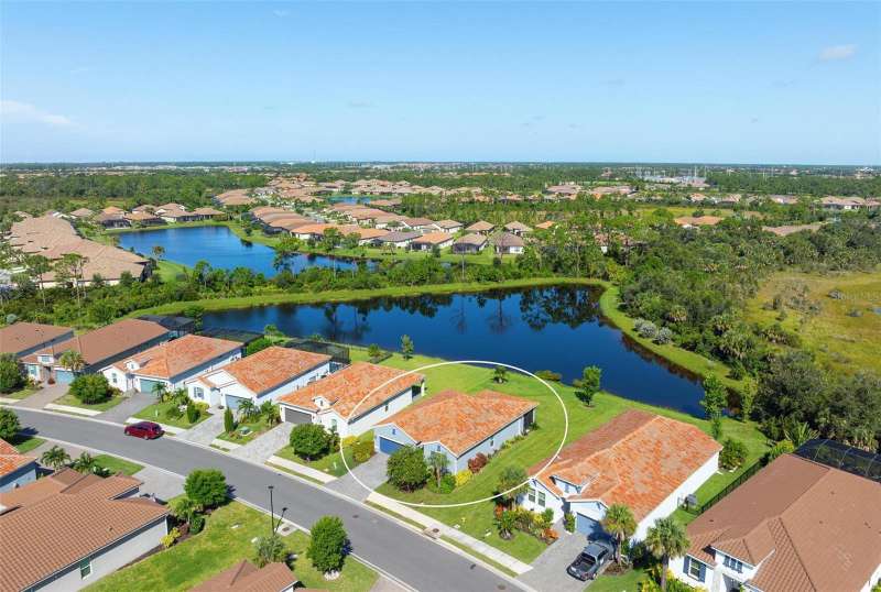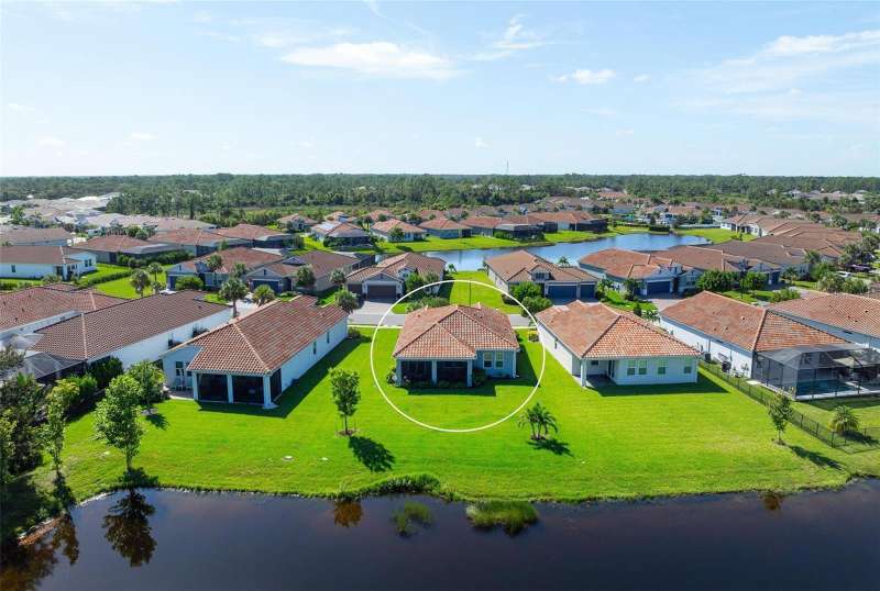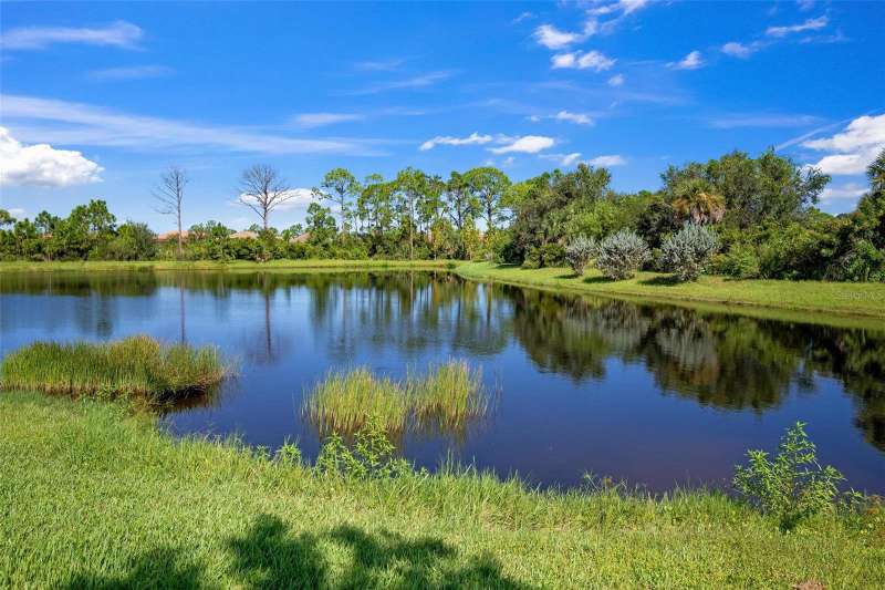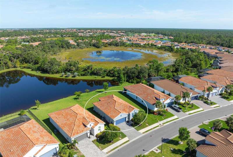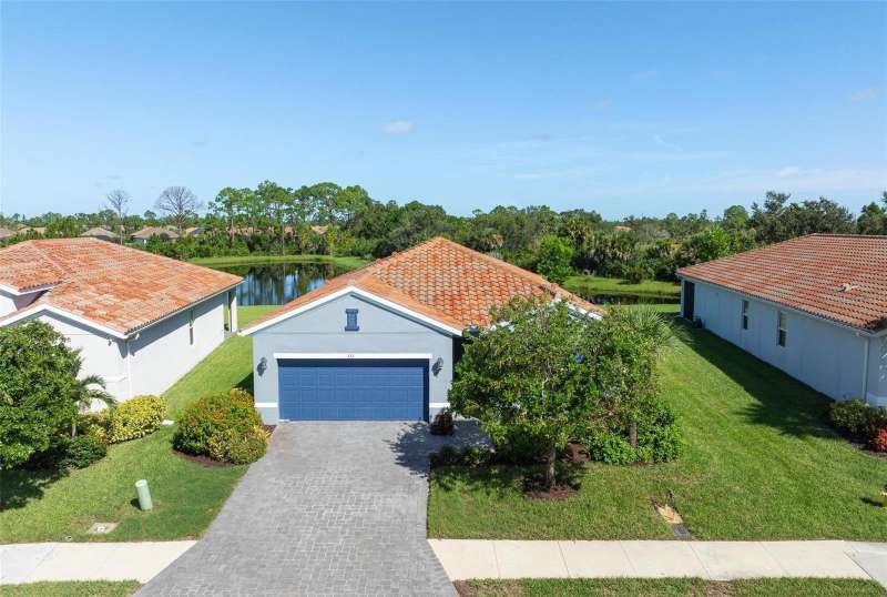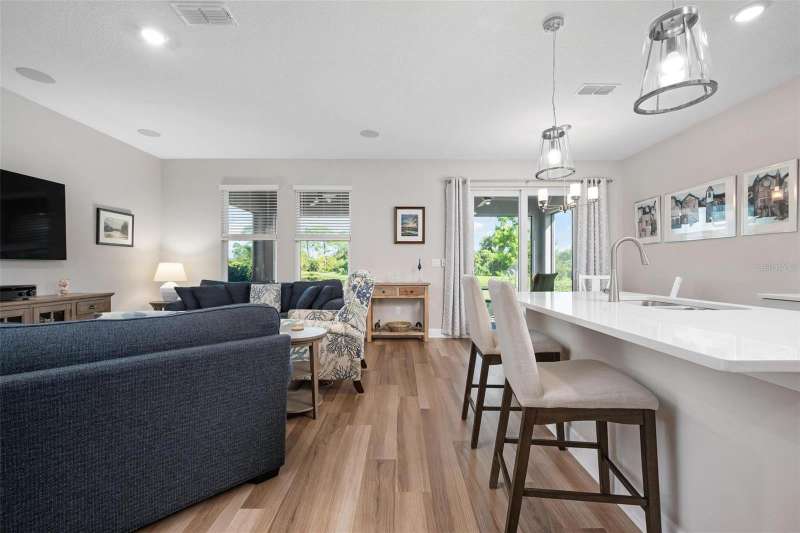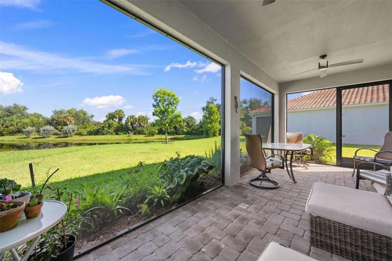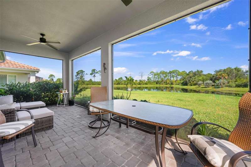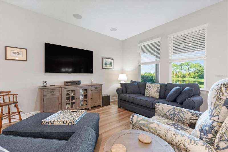 In 2021 this 3 bedroom 2 bath 2 car garage home was built on an oversized lakefront lot in gated Venice Woodlands, and it shows like new! Open the screened front door and the beautiful luxury vinyl plank flooring flows, welcoming you into the bright great room and kitchen area. The large great room offers a ceiling sound system, water views, with a convenient floor outlet to avoid those messy cords. The kitchen has soft grey cabinetry, with built in pull-out shelving in the lower units and a walk-in pantry. Soft quartz counter tops with a breakfast bar add to the finishes. The dinette area has sliders to the outdoor space. Step into your extended lanai with panoramic views of water and preserve to capture all that mother nature offers. You just might never leave! The primary bedroom, also with water views, has a large main bathroom with double sinks and an oversized walk-in closet. The other two bedrooms and second bath are in the front of the home providing privacy to family members and guests. Just off the kitchen is the laundry room with storage and it has been plumbed for a utility sink. The two car garage has an epoxy floor. NO CDD FEES and LOW HOA fees are a plus! Impact windows too! The amenities are rich at a low monthly cost and include lawn care, irrigation, clubhouse, a fitness center, community pool and pickle ball courts, bocce ball and various social clubs. Enjoy the nearby Sleeping Turtle or Carlton Preserves. This home is being home furnished so catch the next sunset from your lanai!