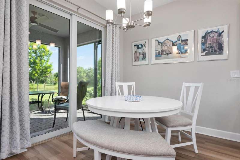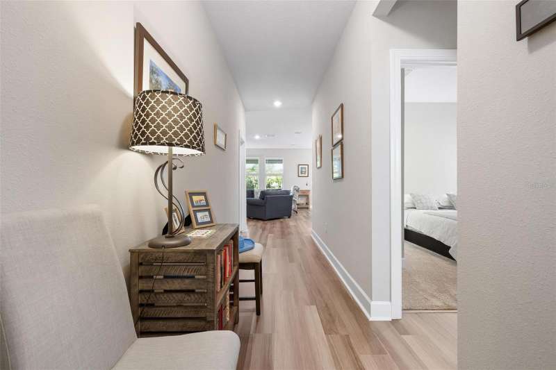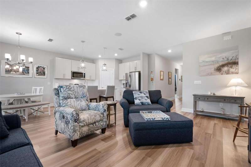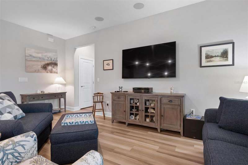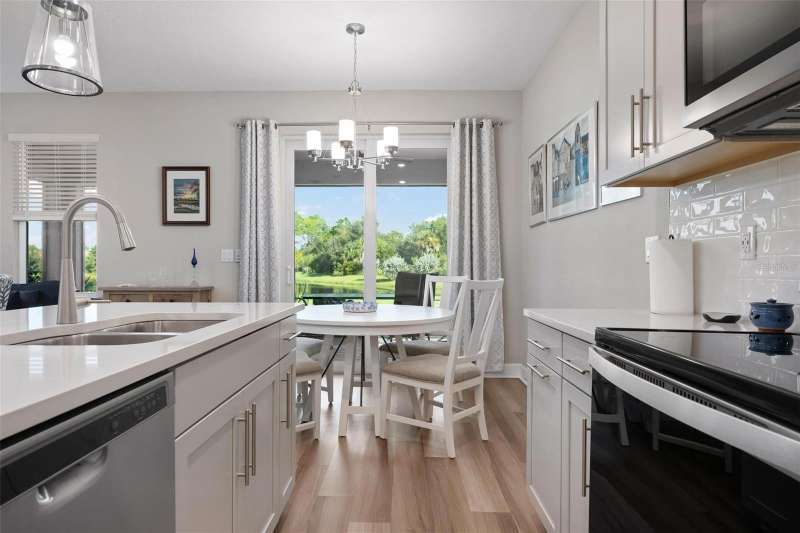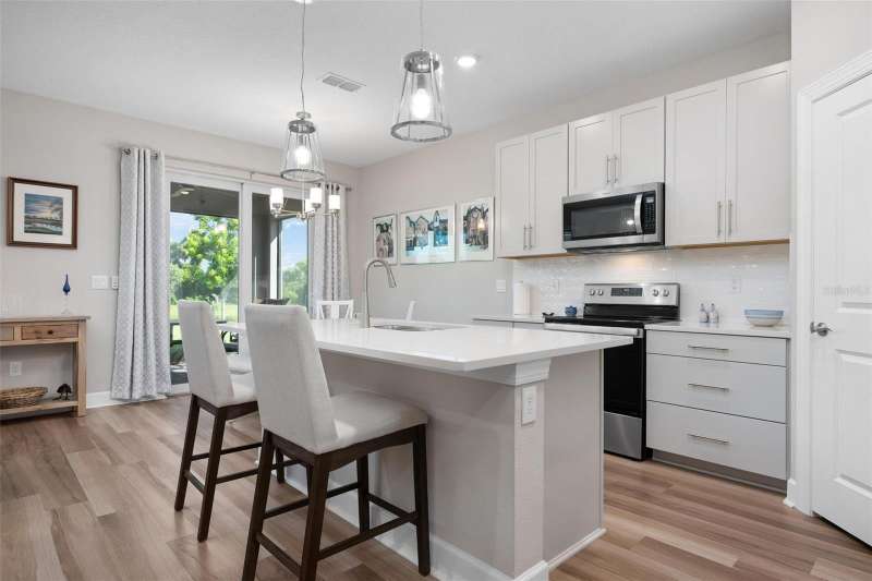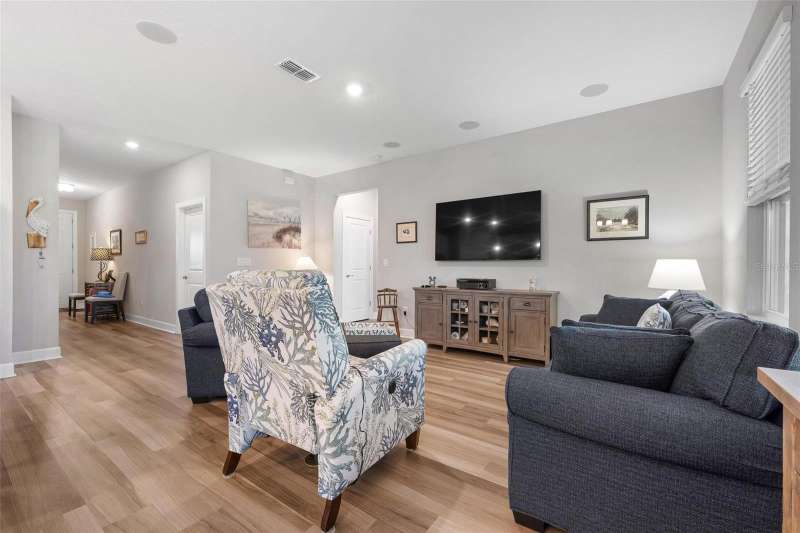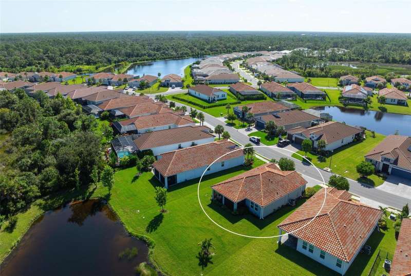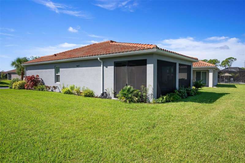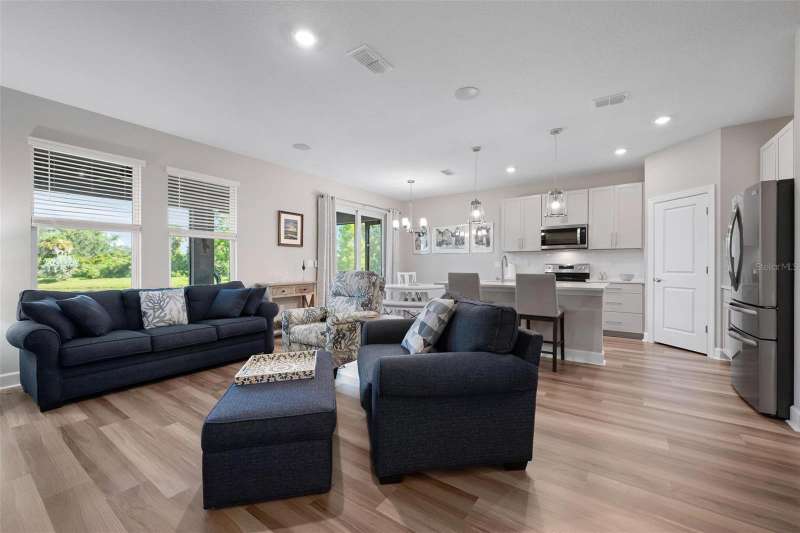 In 2021 this 3 bedroom 2 bath 2 car garage home was built on an oversized lakefront lot in gated Venice Woodlands, and it shows like new! Open the screened front door and the beautiful luxury vinyl plank flooring flows, welcoming you into the bright great room and kitchen area. The large great room offers a ceiling sound system, water views, with a convenient floor outlet to avoid those messy cords. The kitchen has soft grey cabinetry, with built in pull-out shelving in the lower units and a walk-in pantry. Soft quartz counter tops with a breakfast bar add to the finishes. The dinette area has sliders to the outdoor space. Step into your extended lanai with panoramic views of water and preserve to capture all that mother nature offers. You just might never leave! The primary bedroom, also with water views, has a large main bathroom with double sinks and an oversized walk-in closet. The other two bedrooms and second bath are in the front of the home providing privacy to family members and guests. Just off the kitchen is the laundry room with storage and it has been plumbed for a utility sink. The two car garage has an epoxy floor. NO CDD FEES and LOW HOA fees are a plus! Impact windows too! The amenities are rich at a low monthly cost and include lawn care, irrigation, clubhouse, a fitness center, community pool and pickle ball courts, bocce ball and various social clubs. Enjoy the nearby Sleeping Turtle or Carlton Preserves. This home is being home furnished so catch the next sunset from your lanai!