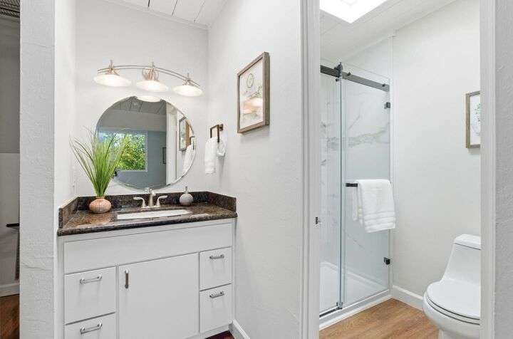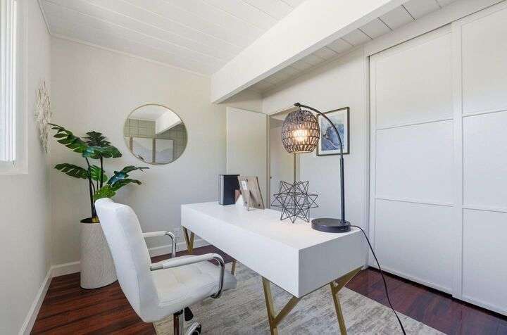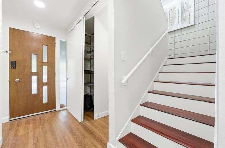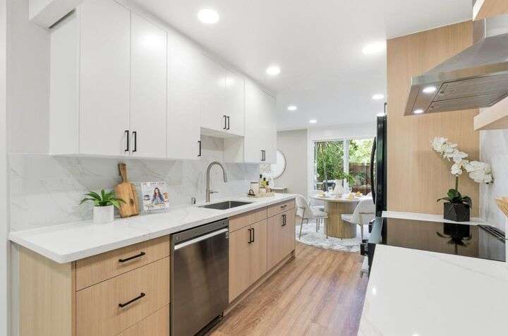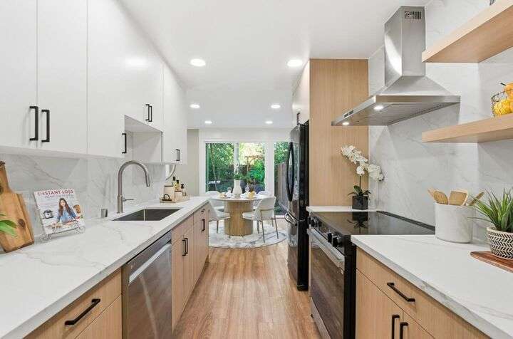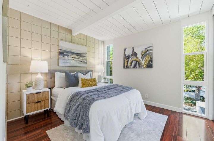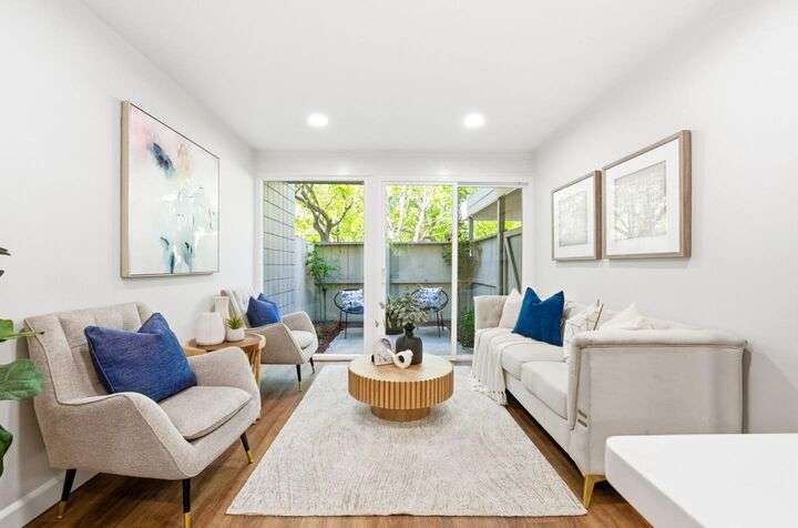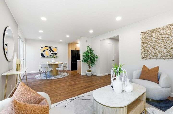 Experience the charm of mid-century modern design in this beautifully updated 4B/2.5Bth townhome, ideally situated in the heart of Silicon Valley. Nestled in a quiet, well-maintained community, this spacious home blends classic style w/ modern comfort. Step inside to discover a bright, open layout enhanced by 2 enclosed patios that create a seamless indoor-outdoor connection. The brand new galley kitchen is a culinary standout, featuring sleek quartz countertops, full backsplash, European cabinetry, open shelves & new appliances. It opens directly into a large dining+ living room & a separate family room. Upstairs, 4 generously sized bedrooms offer flexible living, including a peaceful primary suite complete with a walk-in closet, ensuite bath & a view over the backyard and the pool. All bathrooms were renovated in 2024. The convenience of an upstairs laundry area adds to the home's thoughtful design. Additional highlights include energy-efficient dual-pane windows and sliders, radiant heated flooring, recessed lights, skylights & copper plumbing. This home is just minutes from top tech employers like Apple and Nvidia, walking distance to CarMichael Park, Stratford School, Santa Clara High, Pomeroy Elem., close to Kaiser Hospital, Central Park & Library, and major commute routes.
