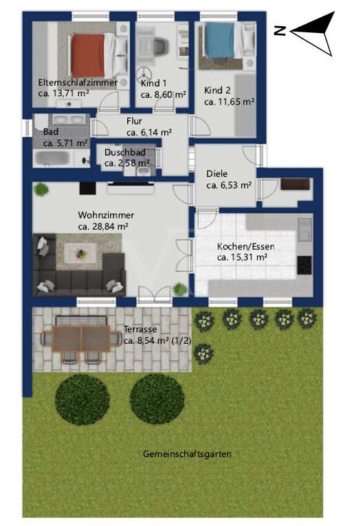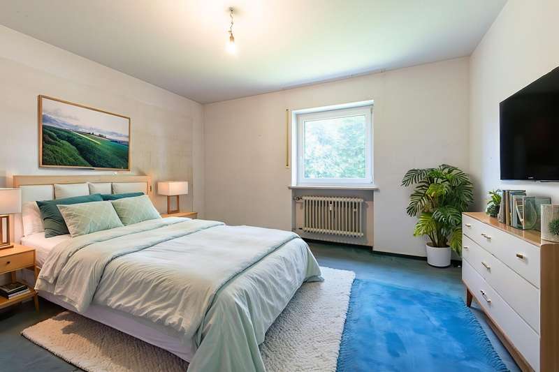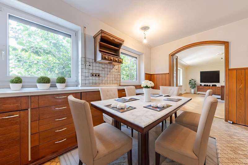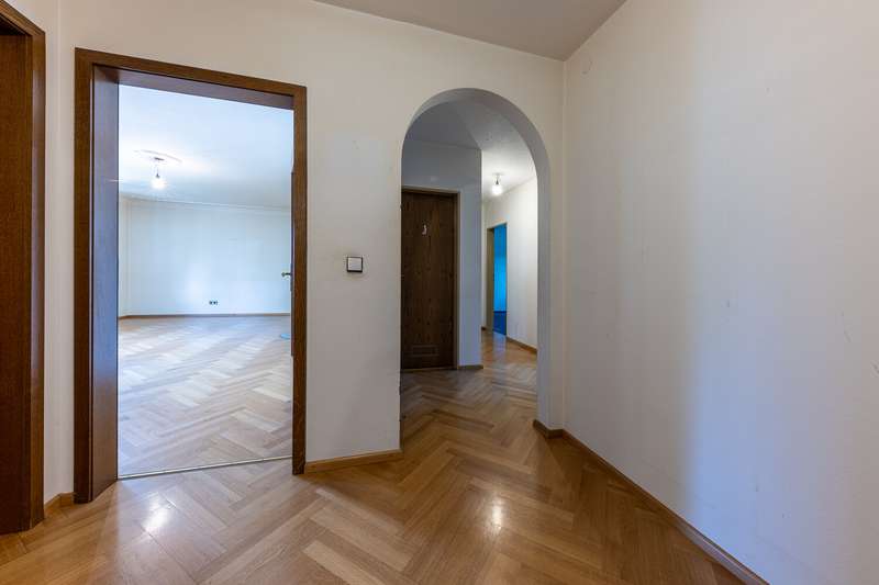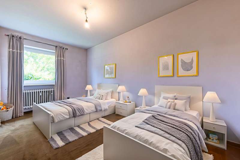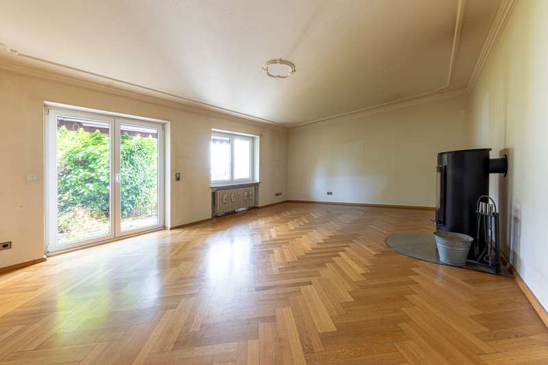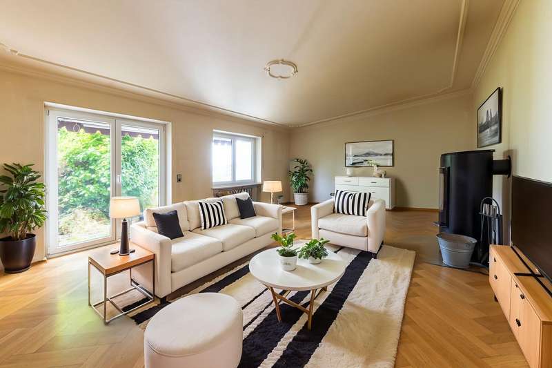 This bright 4-room apartment awaits you in the middle of a well-kept residential complex. Perfect for small families, couples with space requirements or anyone who values a comfortable floor plan and a cozy ambience. As soon as you enter the apartment, you are greeted by an inviting hallway with enough space for a wardrobe. Slightly set back is a practical storage room, which is ideal for household utensils or supplies. In the fitted kitchen, wooden fronts meet classic retro-style wall tiles and an impressive double door provides access to the spacious living room. This impresses not only with its brightness and elegant parquet flooring, but also with a timeless Swedish stove. It gives the room a cozy feel and makes it the perfect place for relaxing evenings with family and friends. From here, the path leads directly to the sunny terrace with a view of the communal garden. Whether it's breakfast outdoors or a glass of wine in the evening - here you can enjoy the peace and quiet and the well-kept living environment. In addition to the main bathroom with shower, bathtub, WC and washbasin, the apartment has a separate guest bathroom. The spacious master bedroom, a bright children's room and a further room, which is perfect as an office, hobby room or guest room, offer plenty of space. Every member of the family will find their own retreat here. The offer is rounded off by a separate cellar compartment for additional storage space, a private underground parking space, a hobby room, a bicycle cellar and a laundry drying room. See this spacious apartment for yourself and arrange your viewing today.