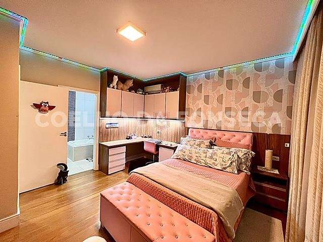 Imóvel com living para 3 ambientes com lareira, 5 suítes, cozinha e lavanderia repleta de planejado, espaço gourmet integrado, escritório, adega, ara condicionado em todos os ambientes, piscina aquecida e aquecimento solar.