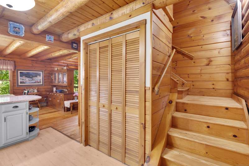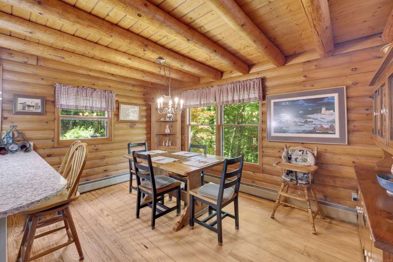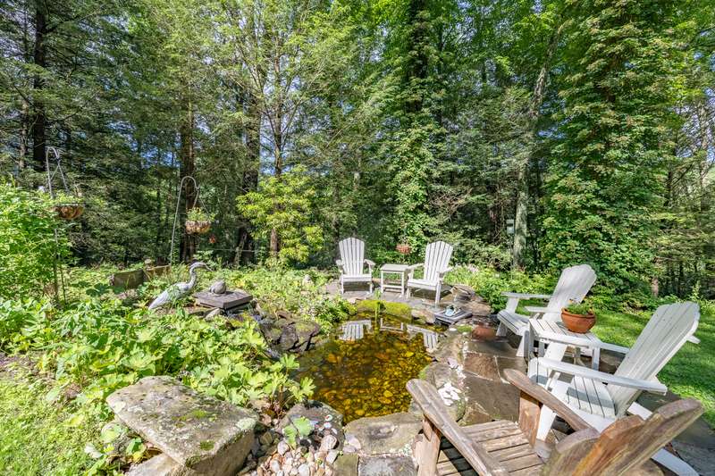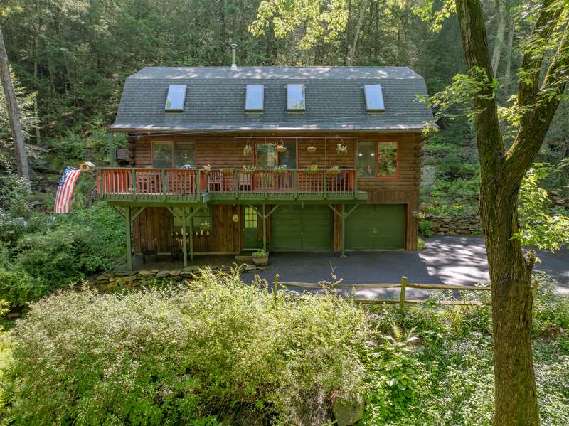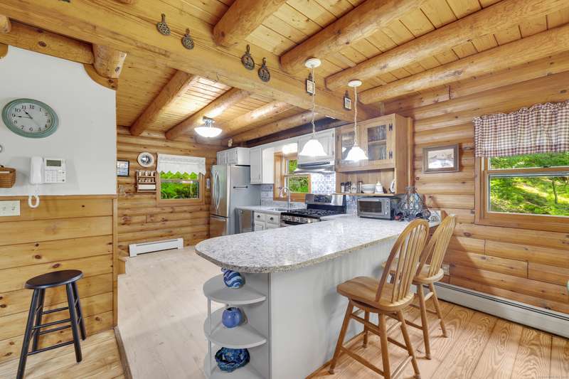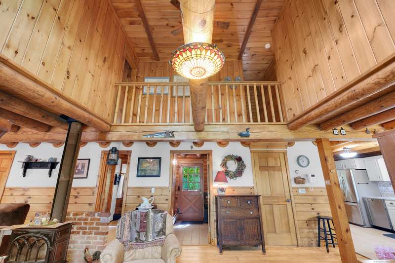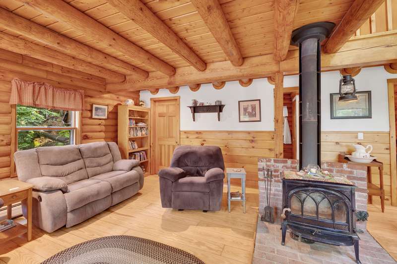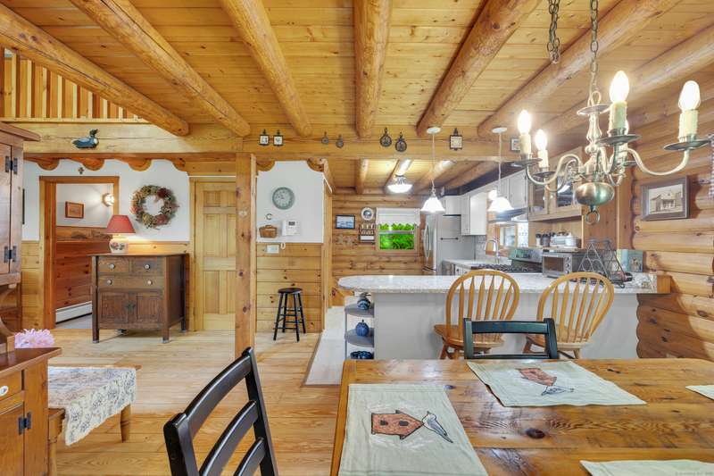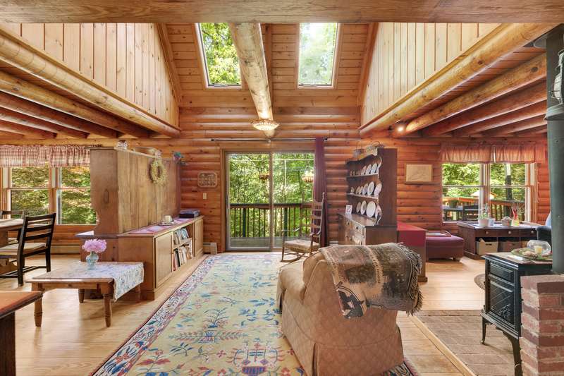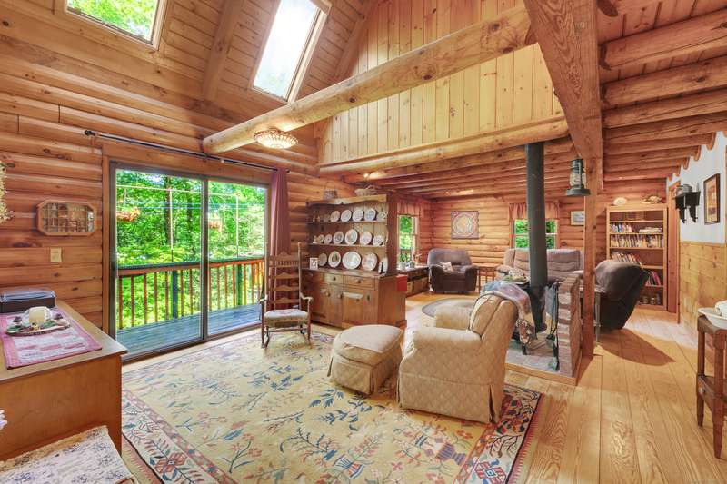 Nestled on 5.04 acres of serene, park-like grounds, this charming log cabin offers a perfect blend of seclusion, natural beauty, and year-round comfort. Surrounded by lush landscaping, mature trees, and open space, it's a peaceful escape from the everyday. Enjoy tranquil afternoons by the serene manmade pond, or spend your evenings unwinding beneath a sky full of stars. Inside, the home radiates warmth and charm. Step into the expanded foyer with soaring cathedral ceilings that lead to a captivating family room, filled with natural light and character. that leads to a large deck. The charming kitchen boasts elegant quartz countertops and a dedicated dining area-perfect for hosting gatherings with family or friends. Newly refinished hardwood floors flow throughout the main level and upper hallway.Upstairs, the primary bedroom is joined by two additional bedrooms, providing ample space for guests. The walk-out lower level offers even more living space-ideal for a game room, home office,
