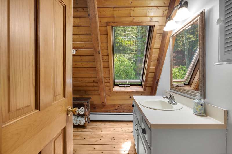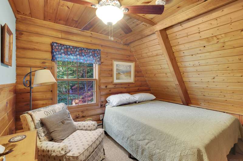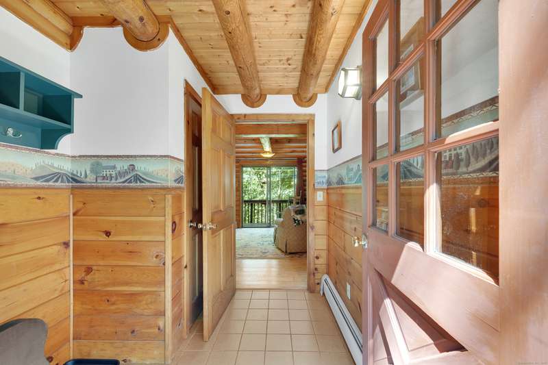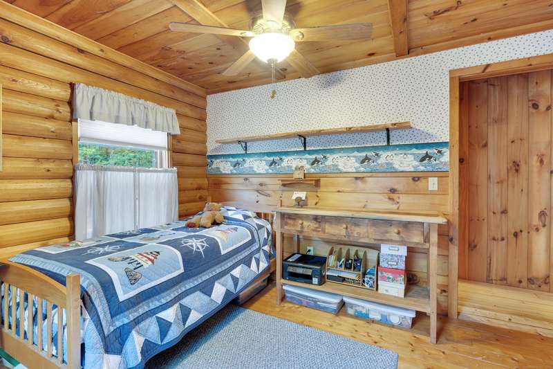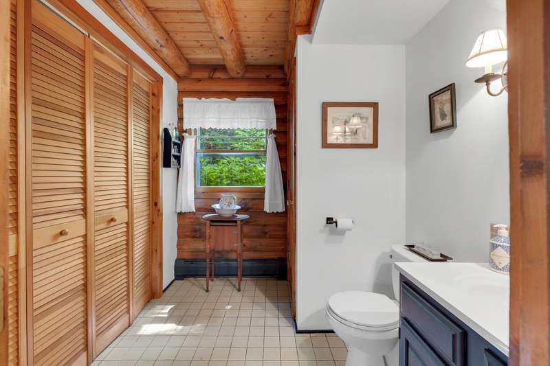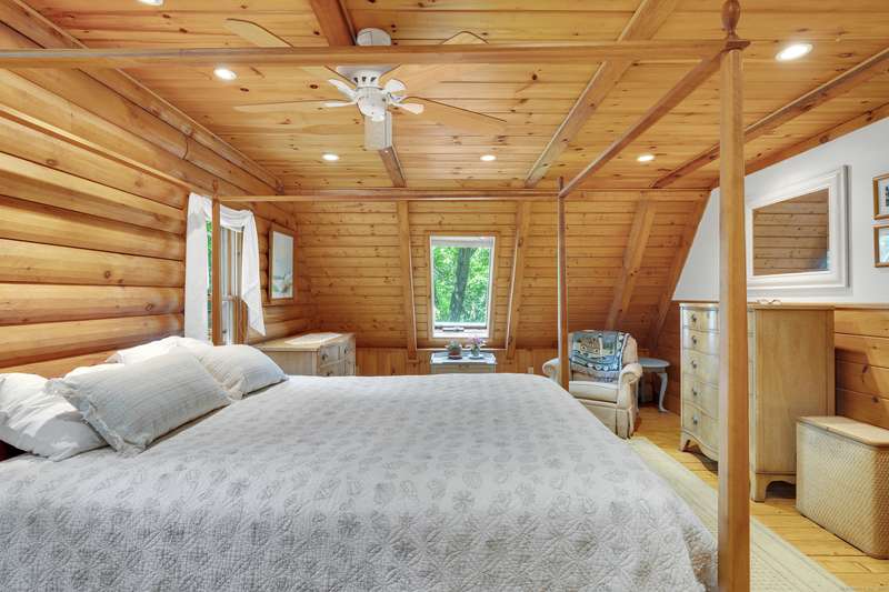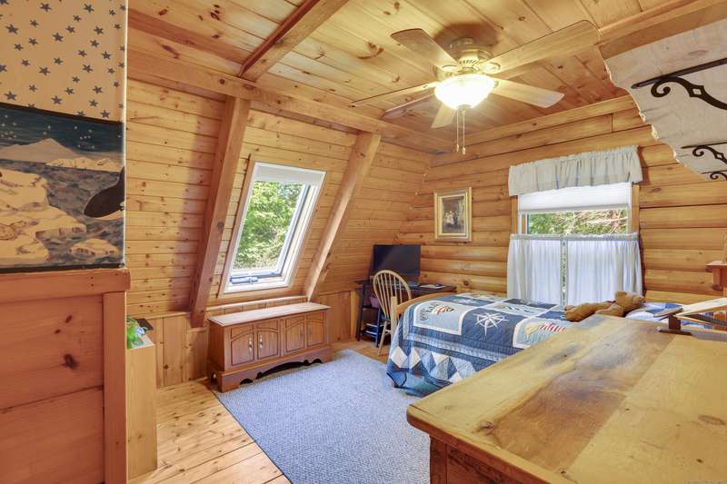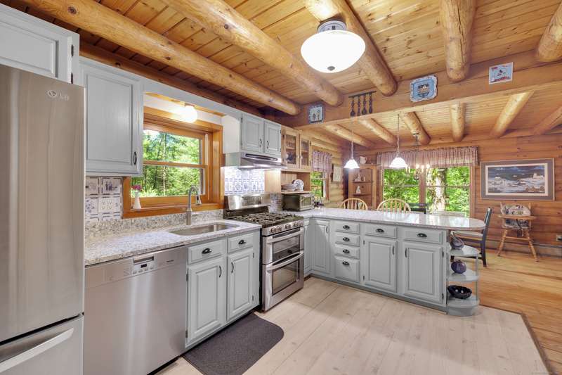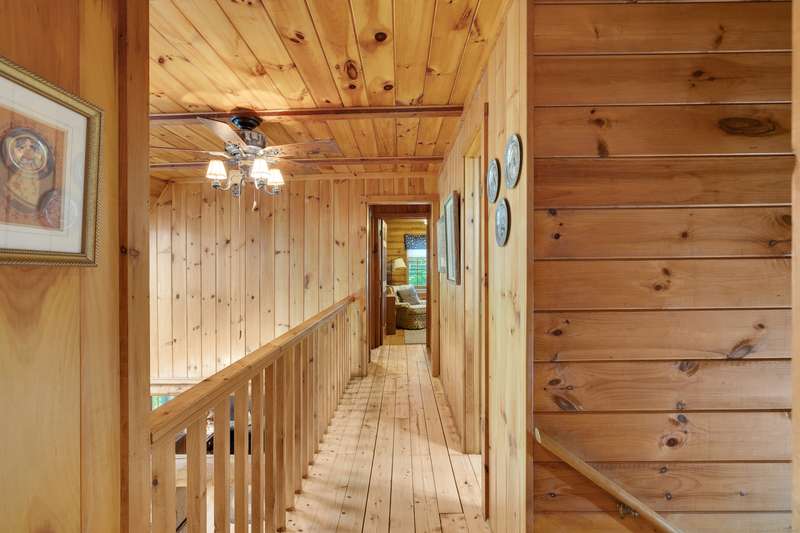 Nestled on 5.04 acres of serene, park-like grounds, this charming log cabin offers a perfect blend of seclusion, natural beauty, and year-round comfort. Surrounded by lush landscaping, mature trees, and open space, it's a peaceful escape from the everyday. Enjoy tranquil afternoons by the serene manmade pond, or spend your evenings unwinding beneath a sky full of stars. Inside, the home radiates warmth and charm. Step into the expanded foyer with soaring cathedral ceilings that lead to a captivating family room, filled with natural light and character. that leads to a large deck. The charming kitchen boasts elegant quartz countertops and a dedicated dining area-perfect for hosting gatherings with family or friends. Newly refinished hardwood floors flow throughout the main level and upper hallway.Upstairs, the primary bedroom is joined by two additional bedrooms, providing ample space for guests. The walk-out lower level offers even more living space-ideal for a game room, home office,