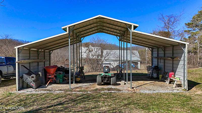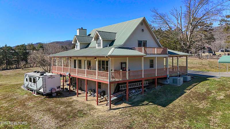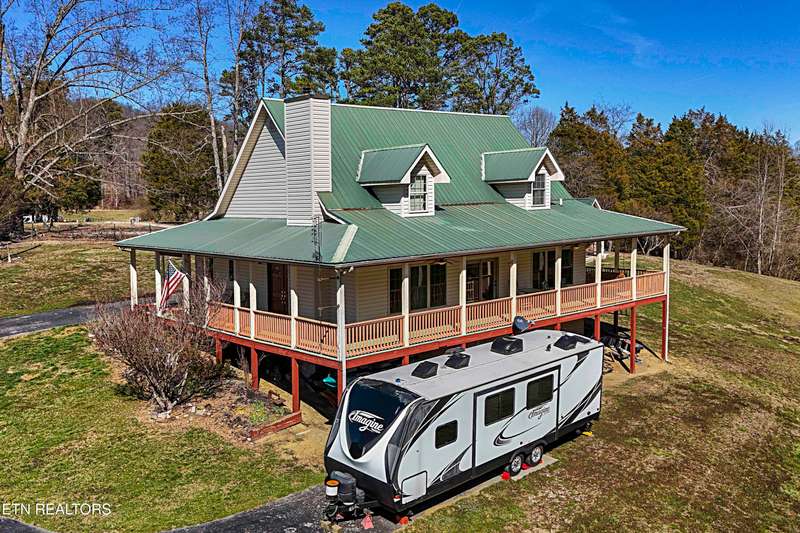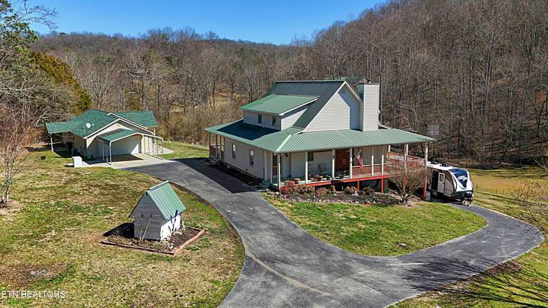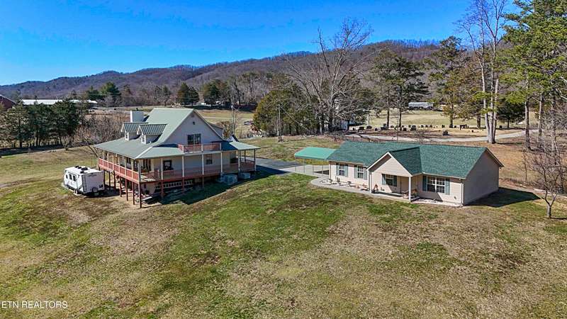 2 HOUSES ON 4.85 ACRES - Here's your chance to own your own little piece of beautiful East Tennessee. Located in Washburn this private 4.85-acre property featuring two homes, a year-round creek, and multiple living options! The main home is a charming 3-bedroom, 2-bathroom home with vaulted ceilings, a stacked stone fireplace with a wood-burning stove, and hardwood floors in the main living area and the loft. On the main level is an open living area allowing easy access into the kitchen and dining area, creating a warm, inviting atmosphere, and perfect for gatherings. The kitchen has plenty of cabinets and a center island. Just off the kitchen is a porch and the laundry room. There are also 2 bedrooms and a full bathroom. The upstairs loft is the main bedroom, a full bathroom, a place for a sitting area or office space, and a deck/balcony. From the main level, step outside to the wrap-around deck, perfect for enjoying peaceful countryside views. There is also a heated and cooled partially unfinished walk-out basement perfect for storage, workshop, or could be finished for additional living space. A second home on the property offers 1 bedroom, 1 bathroom, a spacious living area, a full kitchen, and a two-car garage. This home is ideal as a guest house, in-law suite, or even a short term rental for extra income. Additional features of the property include hookups for RV or Manufactured home, a well house, a 20' x 30' (approximately) metal storage shed for tools, equipment, boat, or other hobbies. There is also a place for RV parking in addition to the area with hookups. Enjoy the privacy of country living while still being just a short drive to Knoxville, Maynardville, or Norris Lake. Whether you need a multi-generational property, investment opportunity, or your own peaceful getaway, this property has it all. Home comes with a one-year 2-10 Home Warranty. Buyer to verify all information.