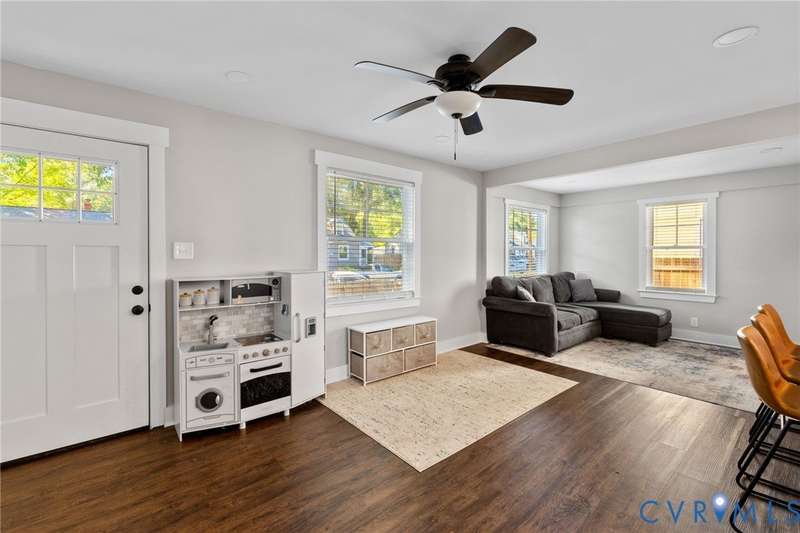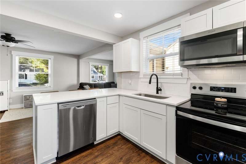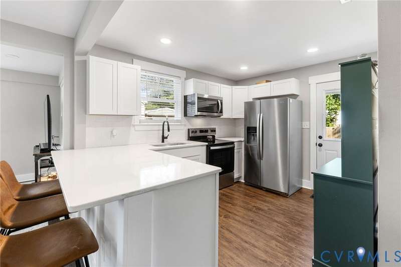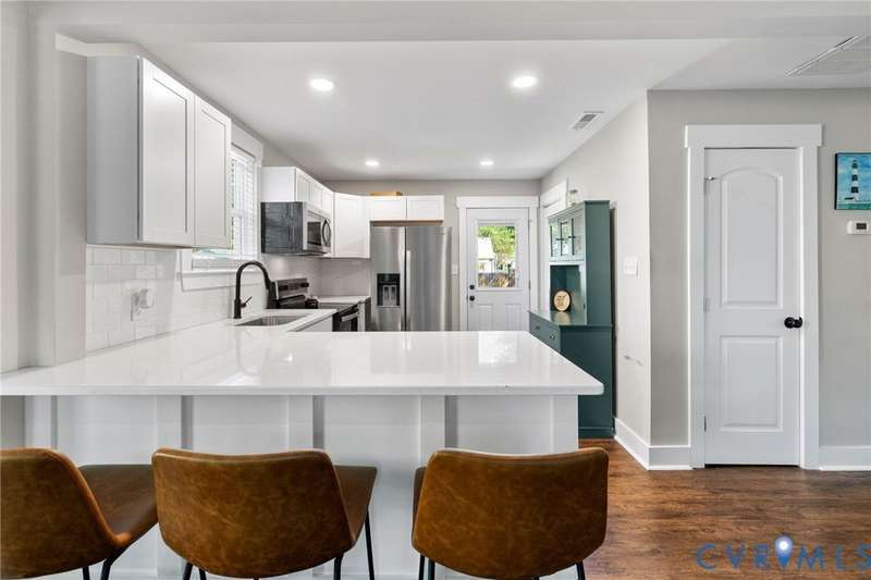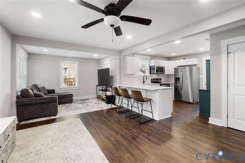 Charming & Bright Ranch with Fully Fenced Backyard! Step inside this beautifully updated ranch home offering 2 BR, 1 BA, 816 square feet and an open, light-filled floor plan designed for modern living. The welcoming foyer leads into an expansive family room featuring recessed lighting throughout and seamless flow into the gourmet kitchen. Enjoy quartz countertops, bar seating, a stylish tile backsplash, stainless steel appliances, a deep single-basin sink, and sleek modern cabinetry, plus direct access to the outdoor space. The primary bedroom showcases gorgeous hardwood flooring, a ceiling fan, and a large closet, while the spacious secondary bedroom offers the same comfortable features. The shared hall bath boasts tile flooring, a pedestal sink, and a tub/shower combo. Outdoors, you'll find a fully fenced, ultra-private backyard, perfect for entertaining, relaxing, or play, offering endless possibilities for outdoor enjoyment. This home offers off street parking for 2 vehicles! This home offers all new items including roof, siding, HVAC, electric, plumbing, sheetrock, paint flooring, kitchen, bathroom & fence all completed in 2024. This charming ranch blends comfort, reliability, style, and functionality, ready for you to call home!